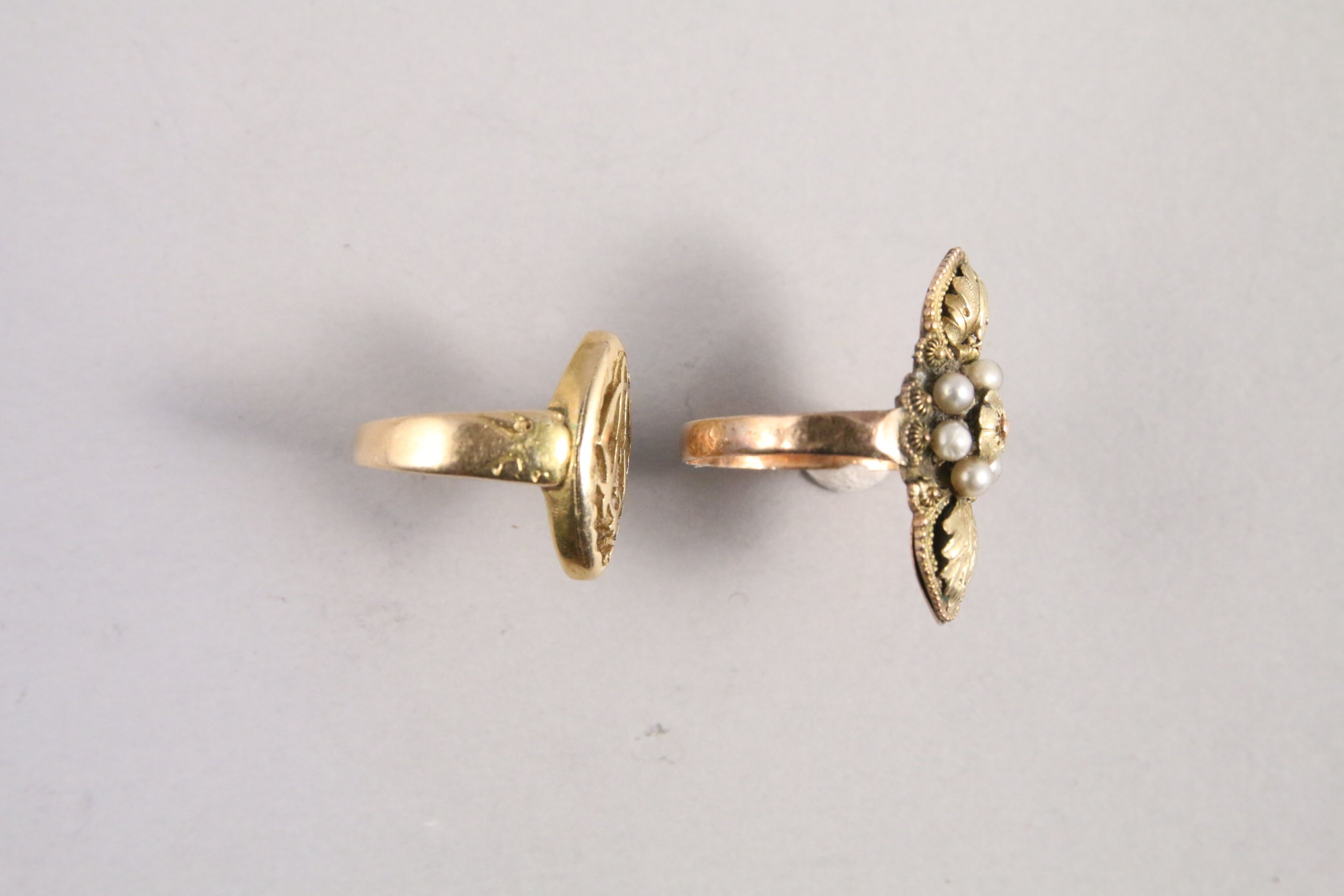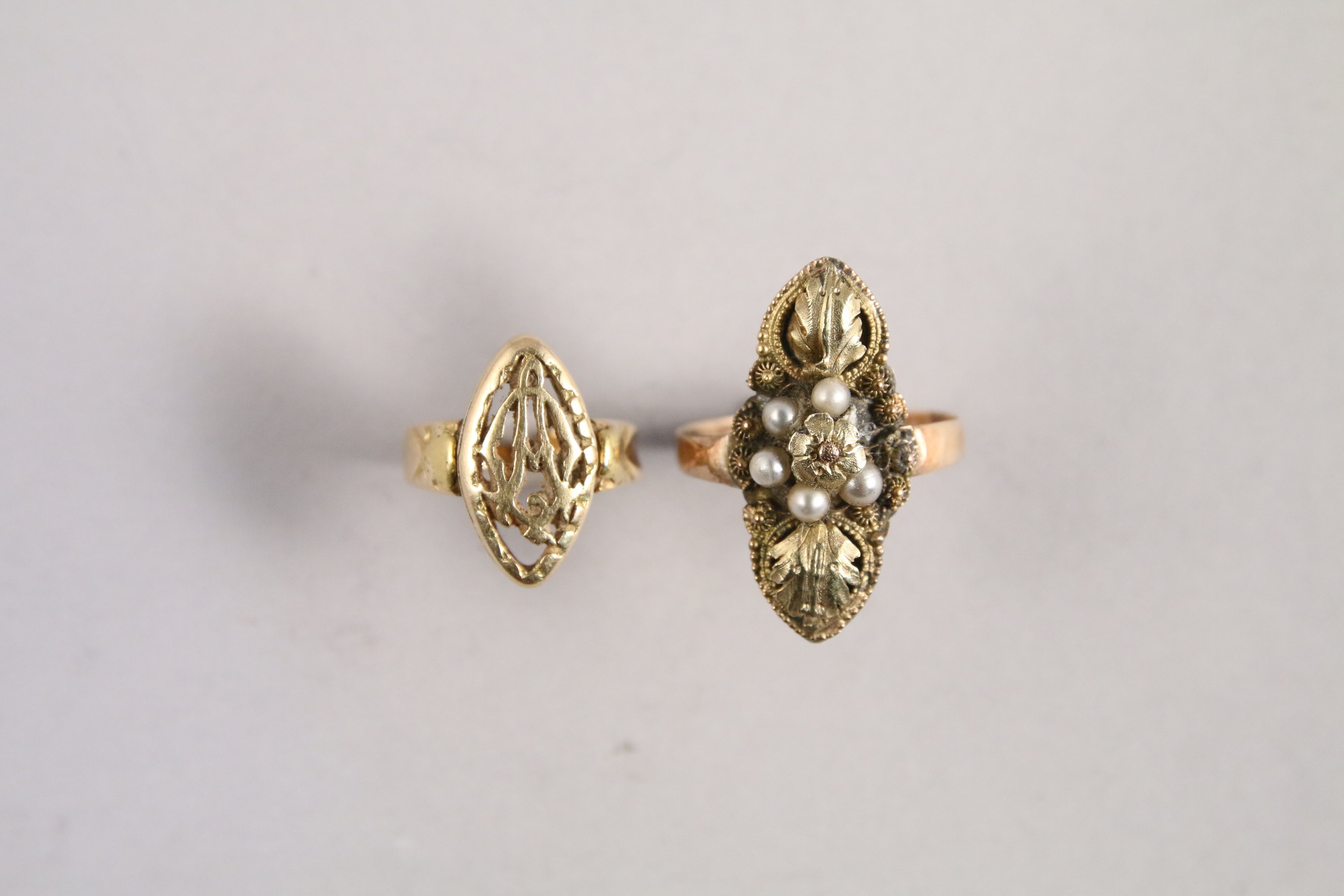 Deux BAGUES en OR 750 millièmes.La première ornée de 5 petites perles (une manquante), la seconde ajourée d'un monogramme "AQ".