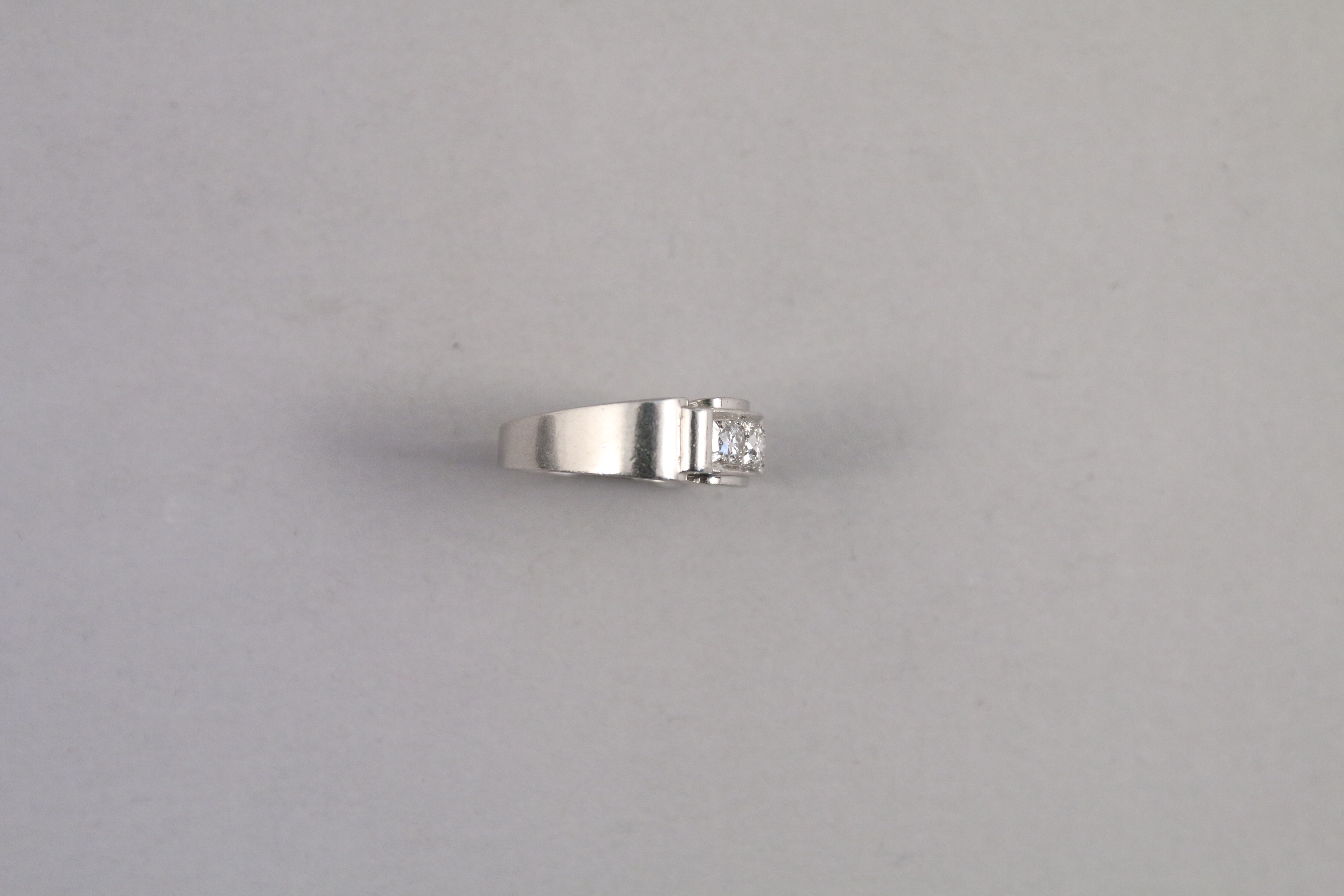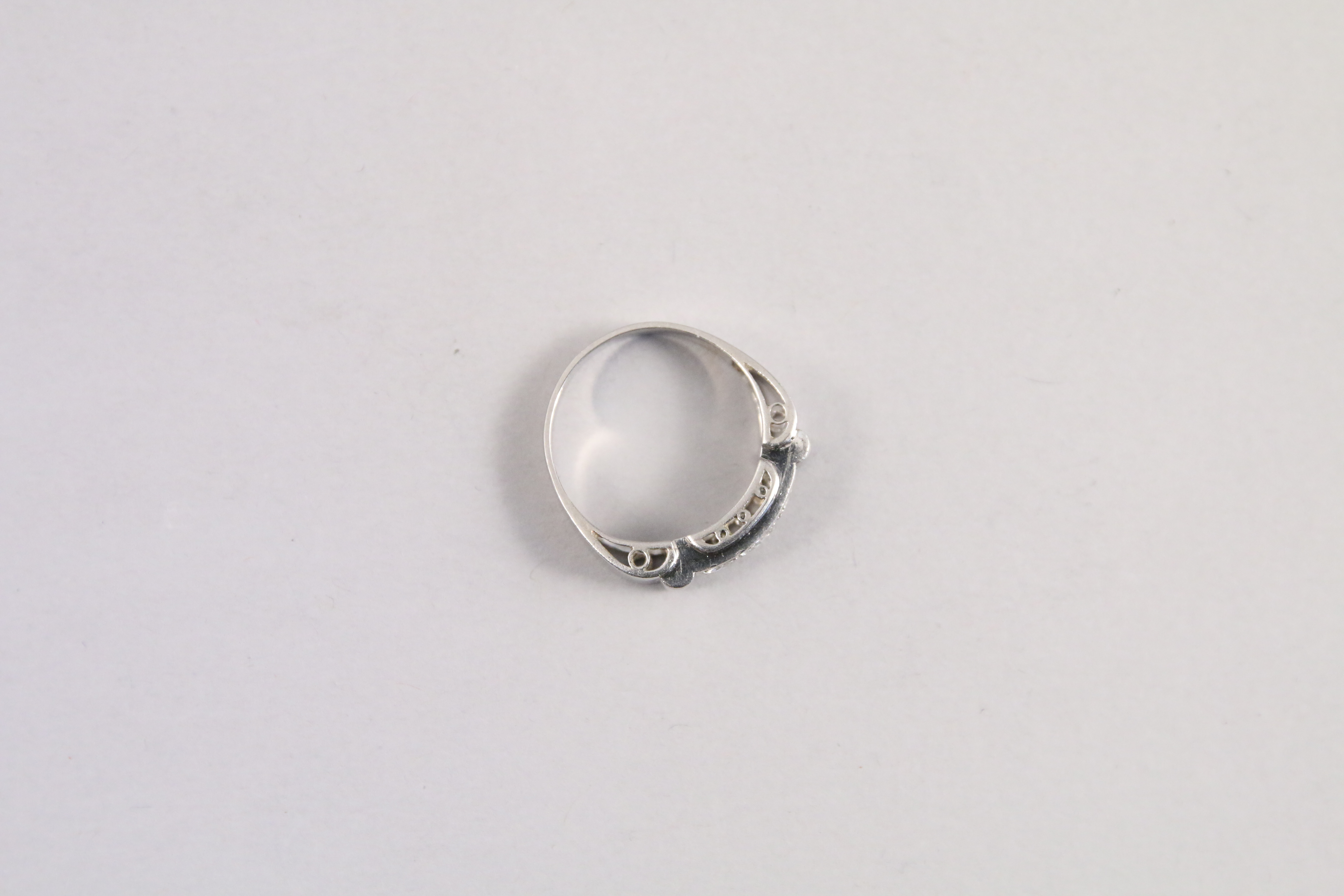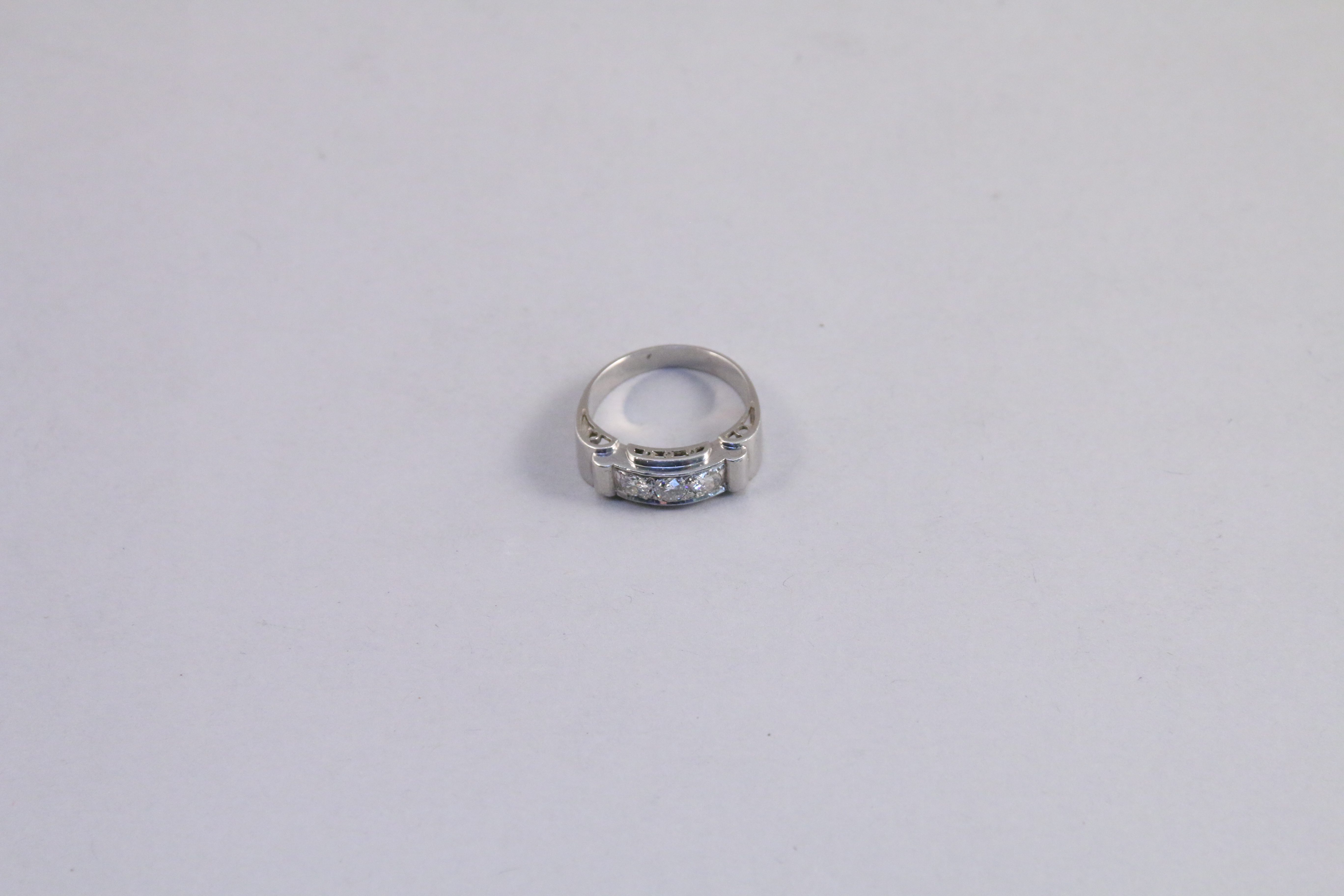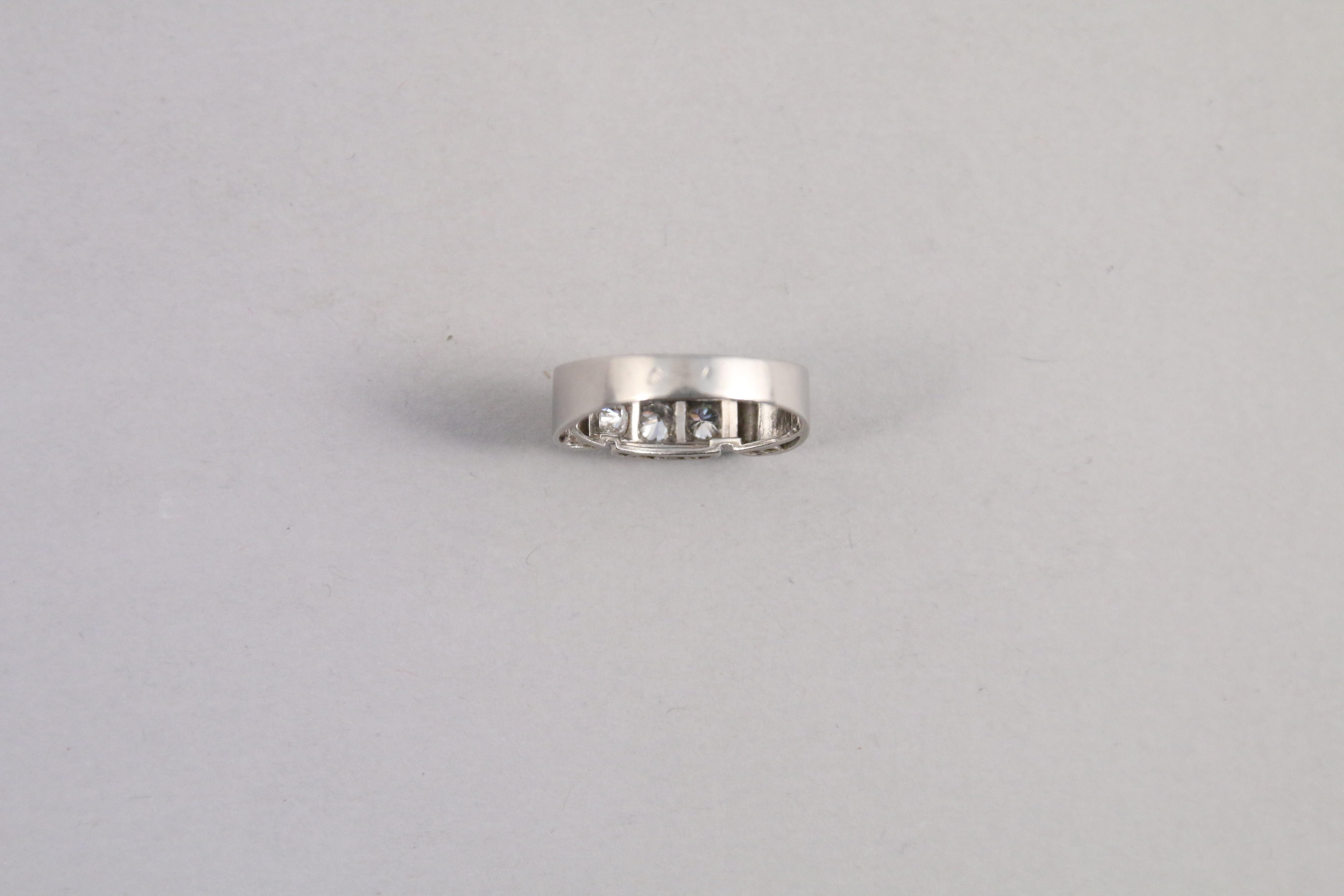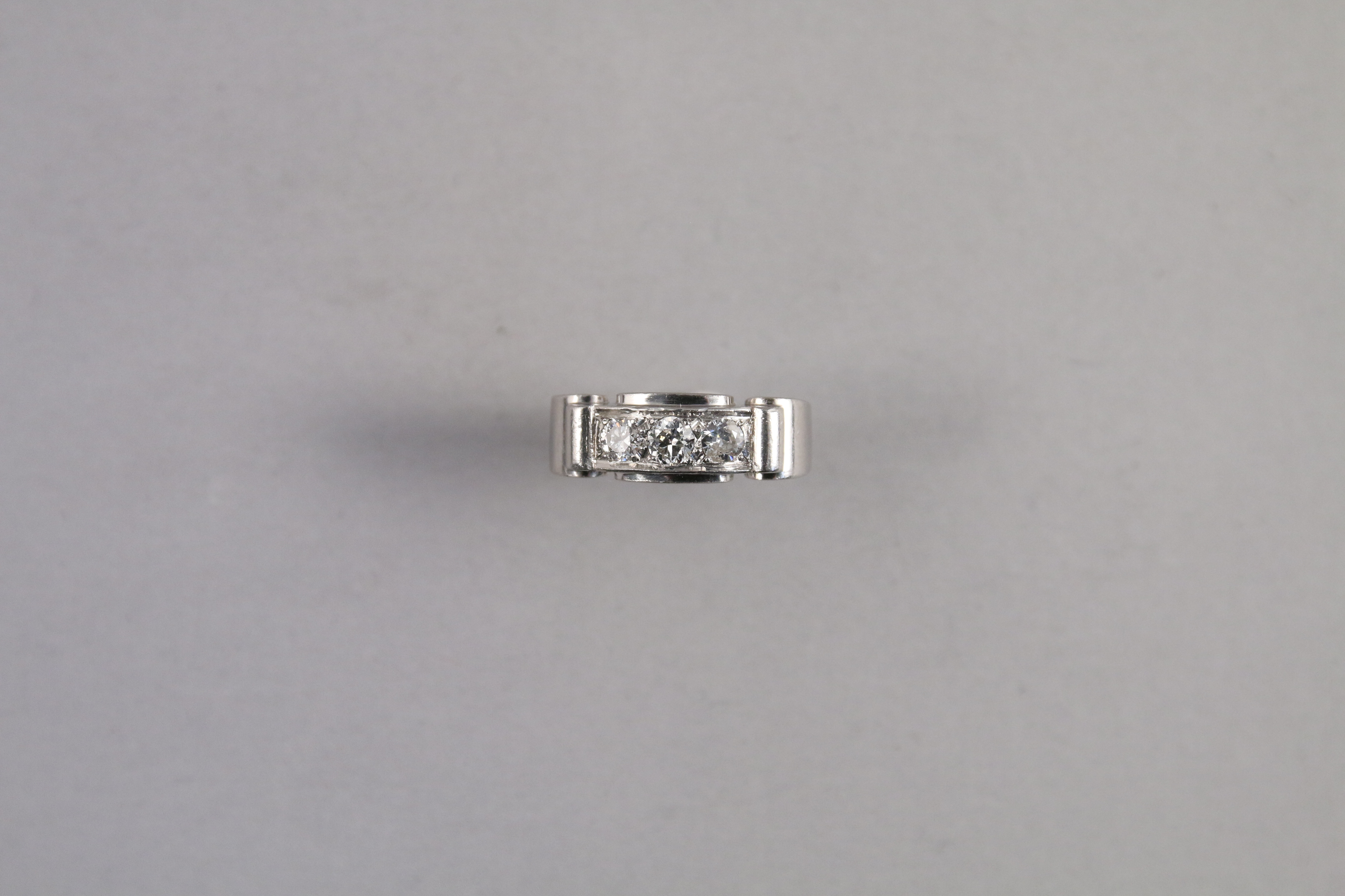 Bague en platine 850 millièmes à décor géométrique, ornée au centre de trois diamants ronds de taille brillant.