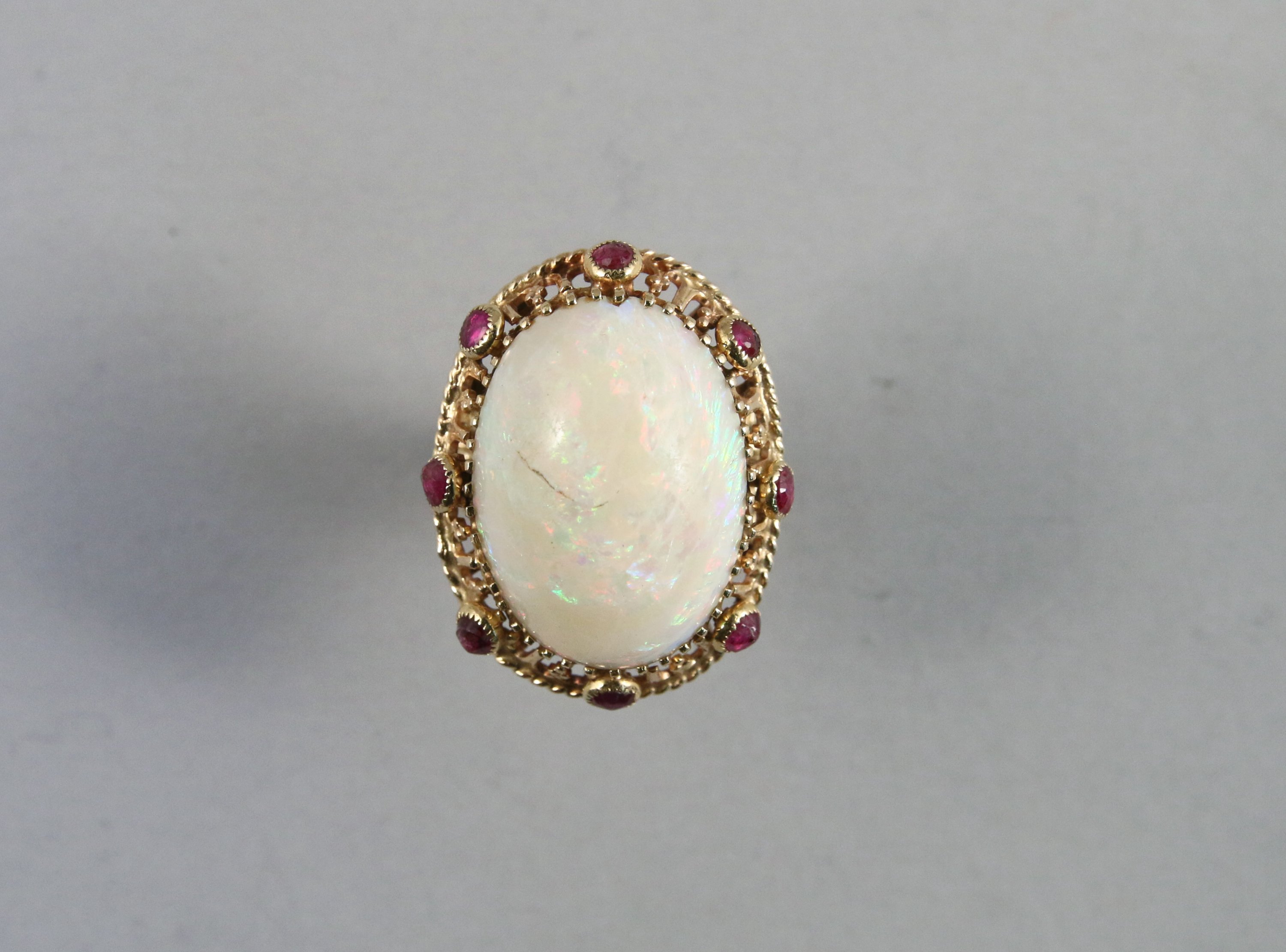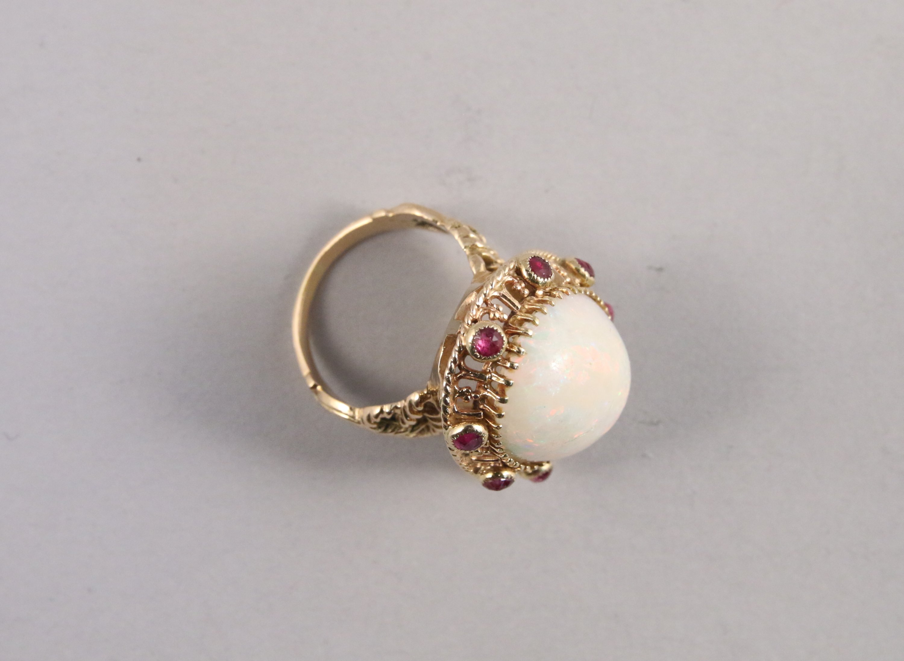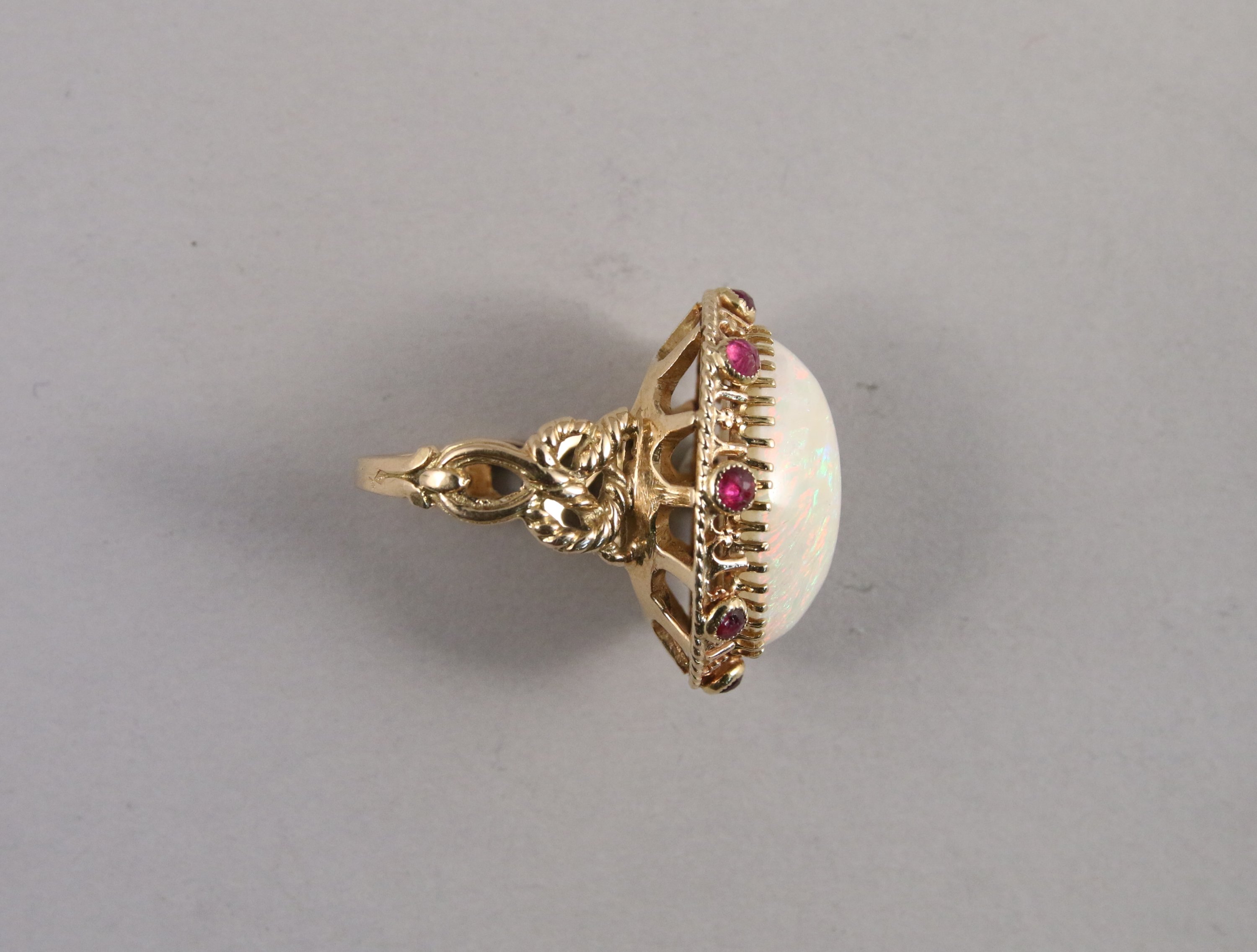 BAGUE en or jaune 750 millièmes, le chaton orné d'une OPALE entourée de huit petites pierres colorées. L'épaule décorée d'un motif de corde.