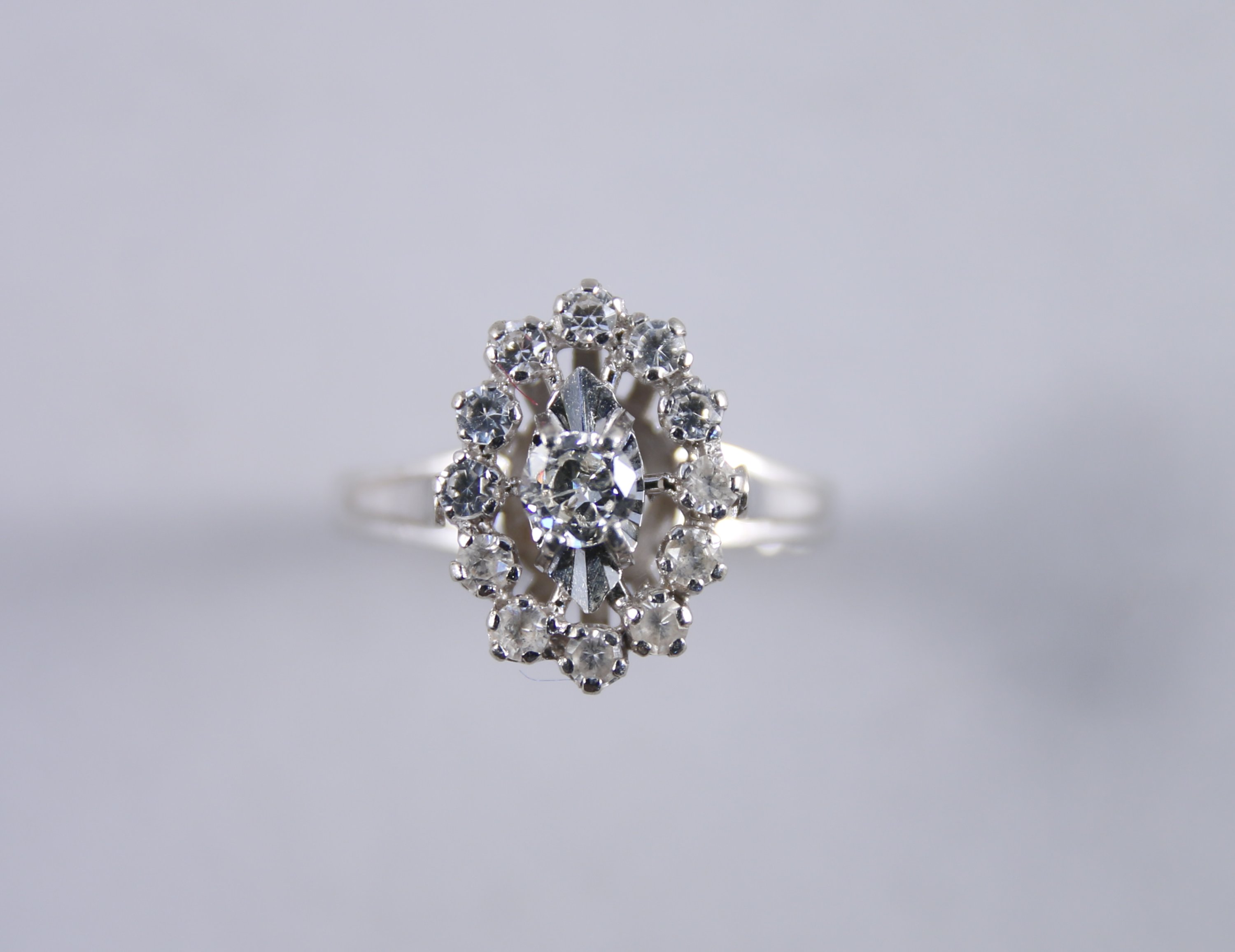 BAGUE en or gris 750 millièmes, ornée d'un DIAMANT rond de taille ancienne dans un entourage de douze pierres d'imitation de couleur blanche.