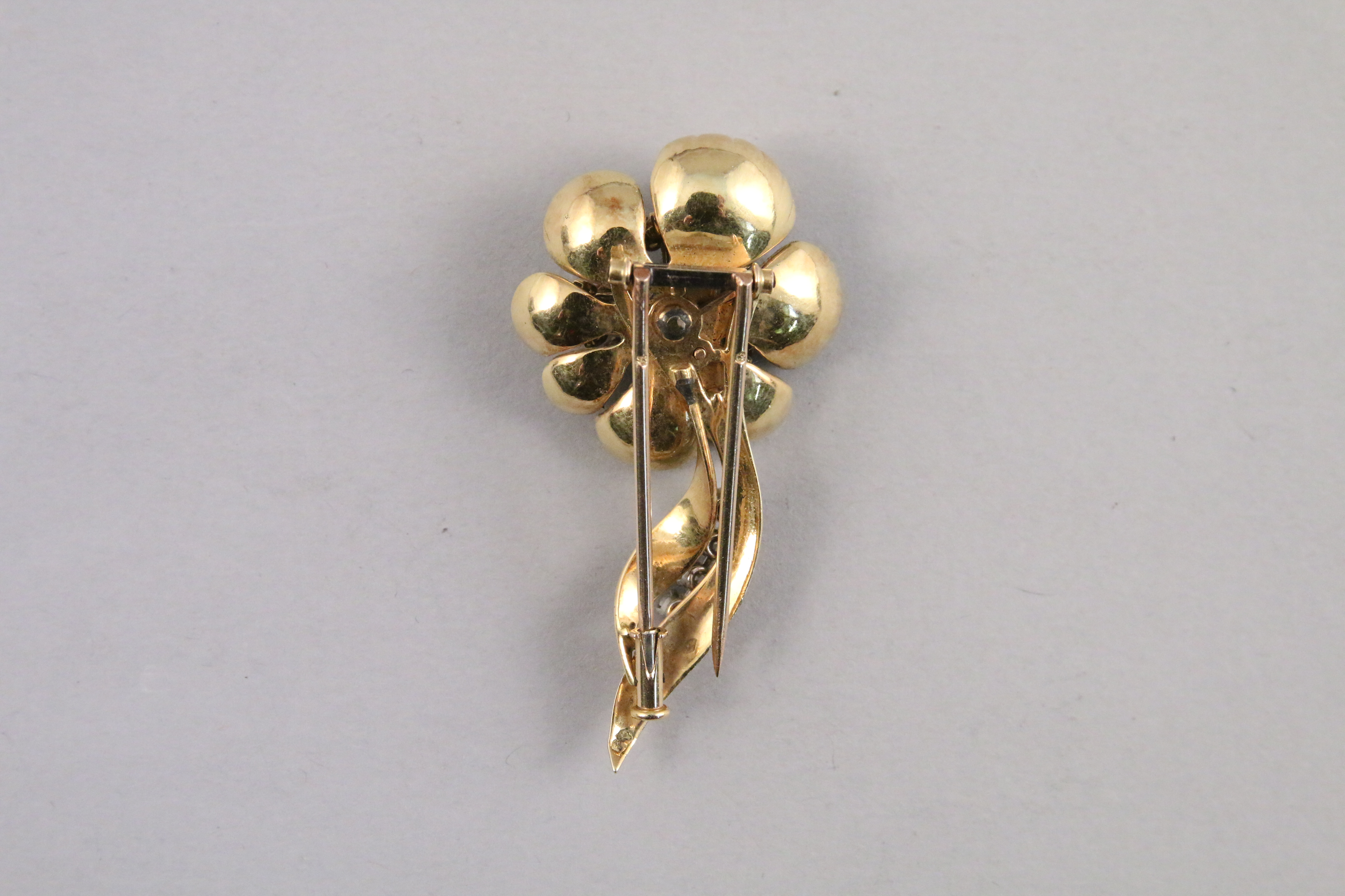 CLIP de REVERS en or jaune 750 millièmes et platine 850 millièmes figurant une fleur émaillée vert, partiellement sertie de citrines et diamants ronds de taille brillant.
