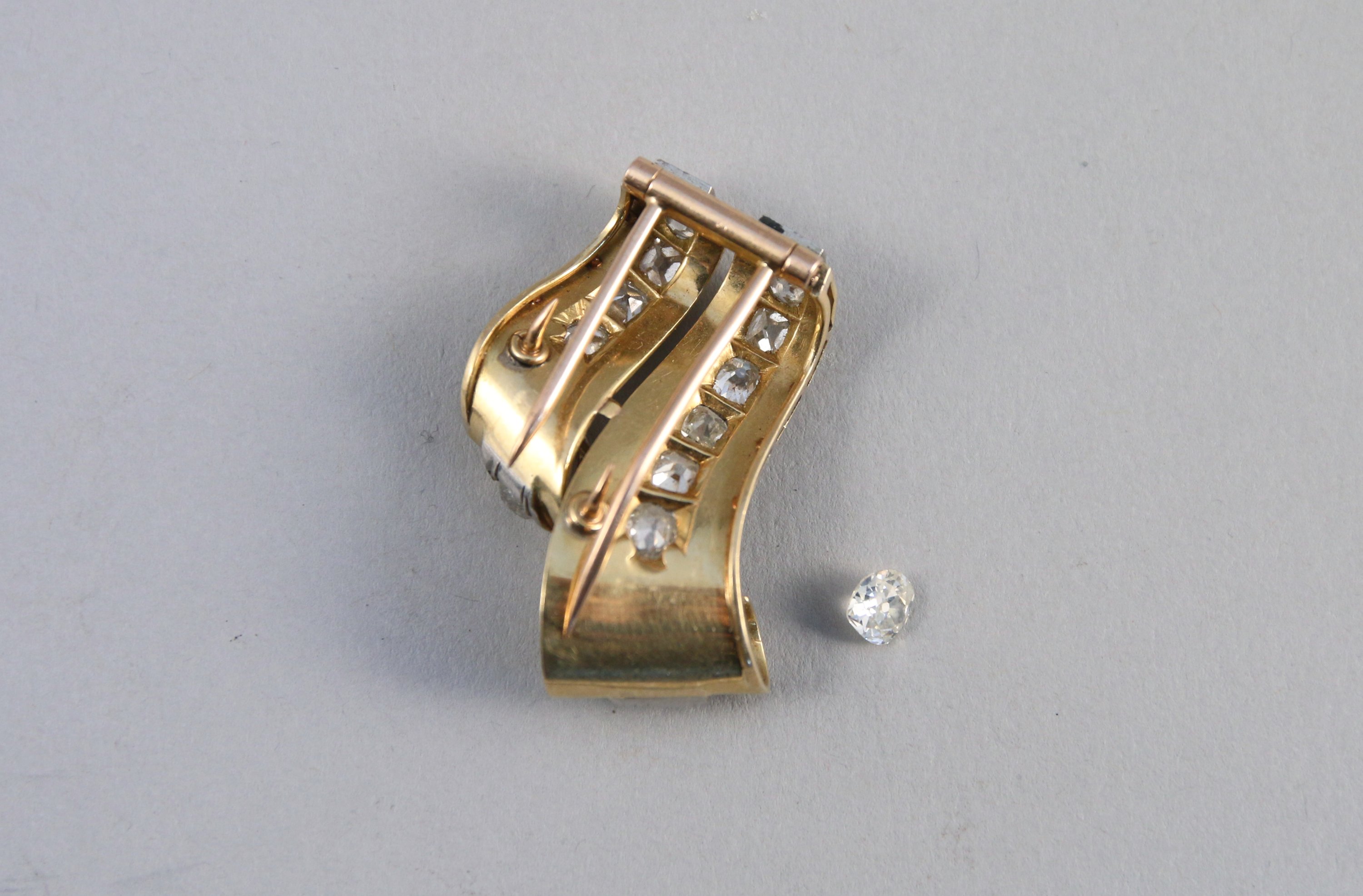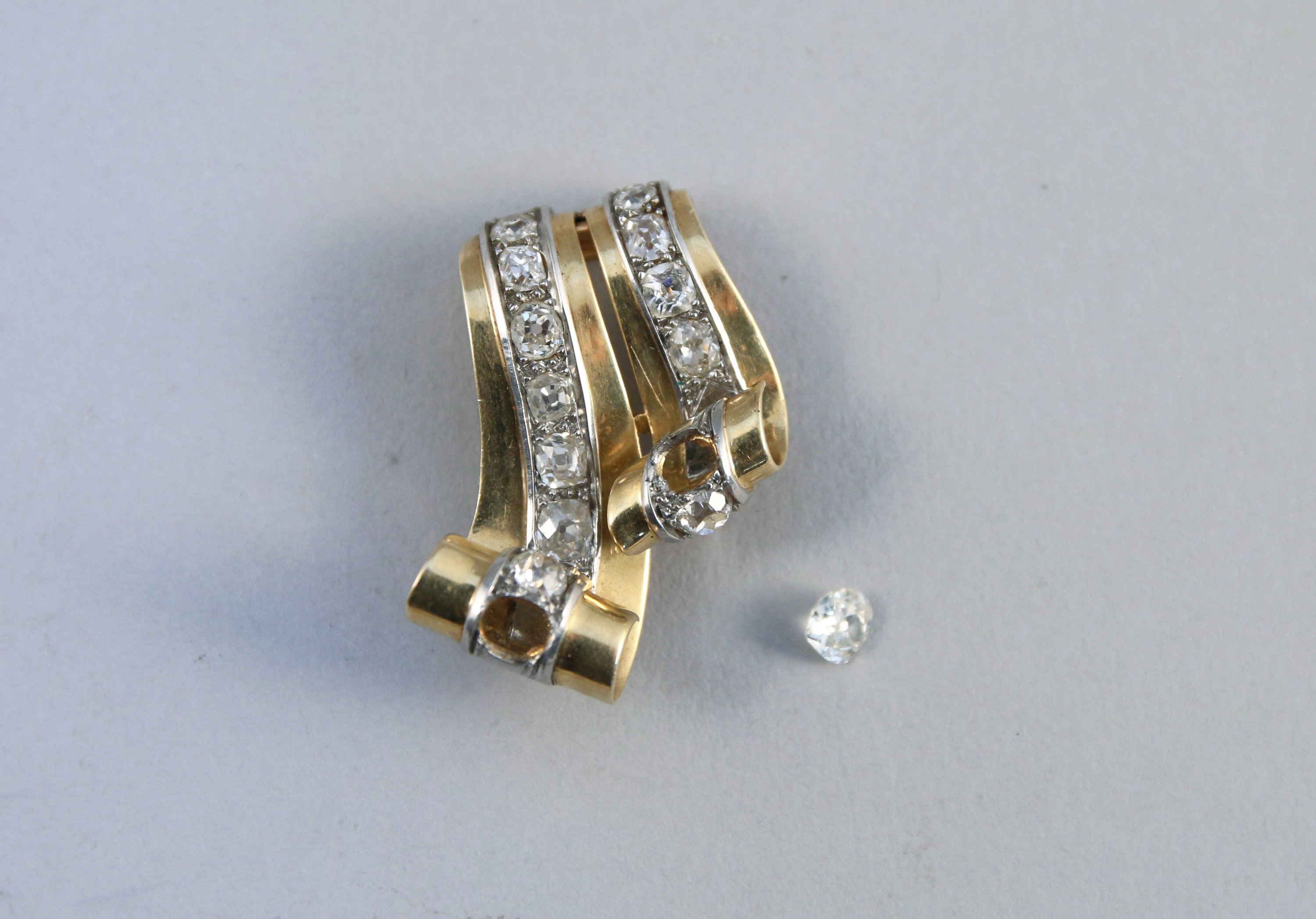 Clip de revers en or jaune 750 millièmes et platine 850 millièmes à décor d'enroulement, orné de deux lignes de diamants ronds et coussin de taille ancienne.