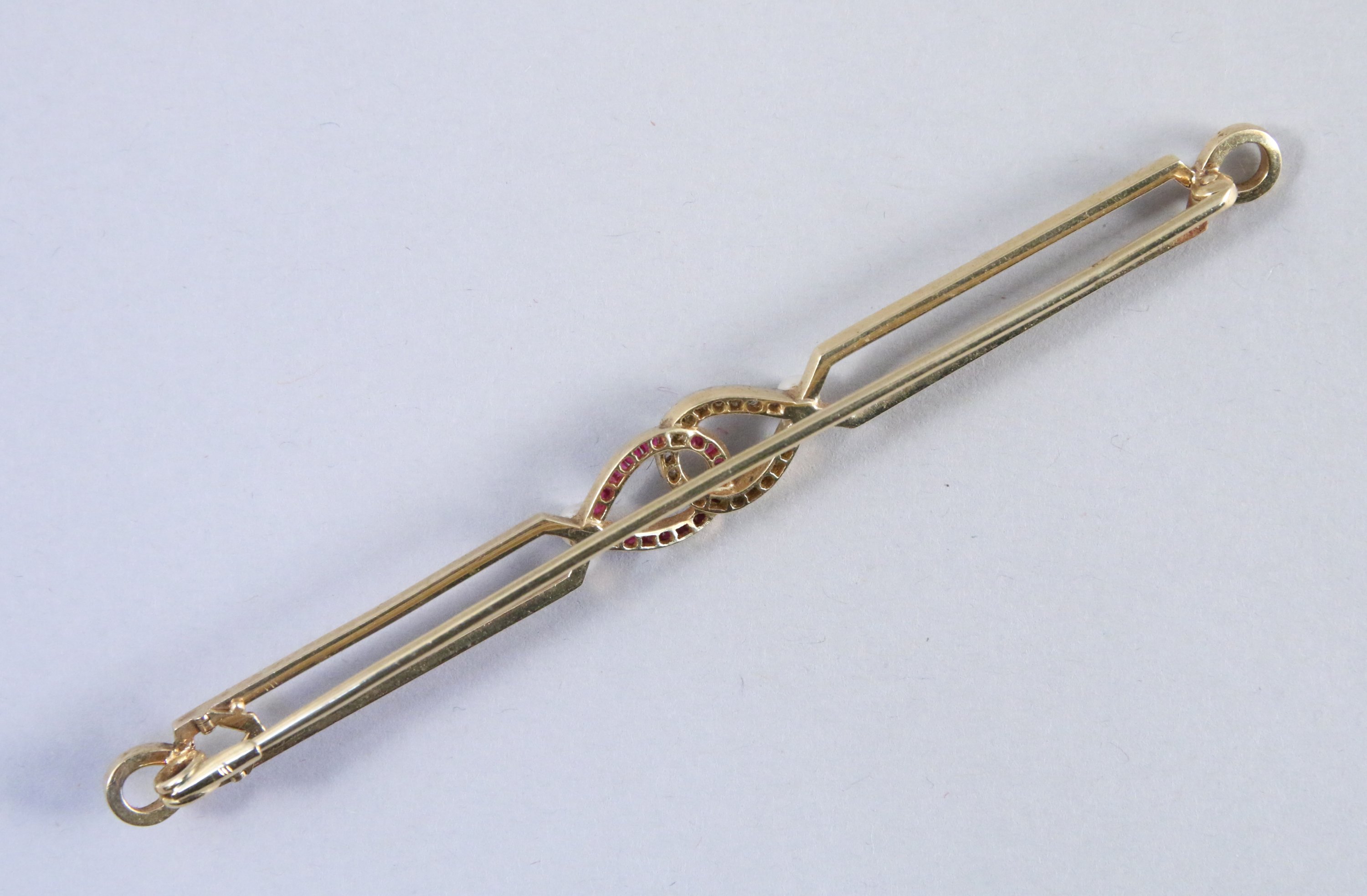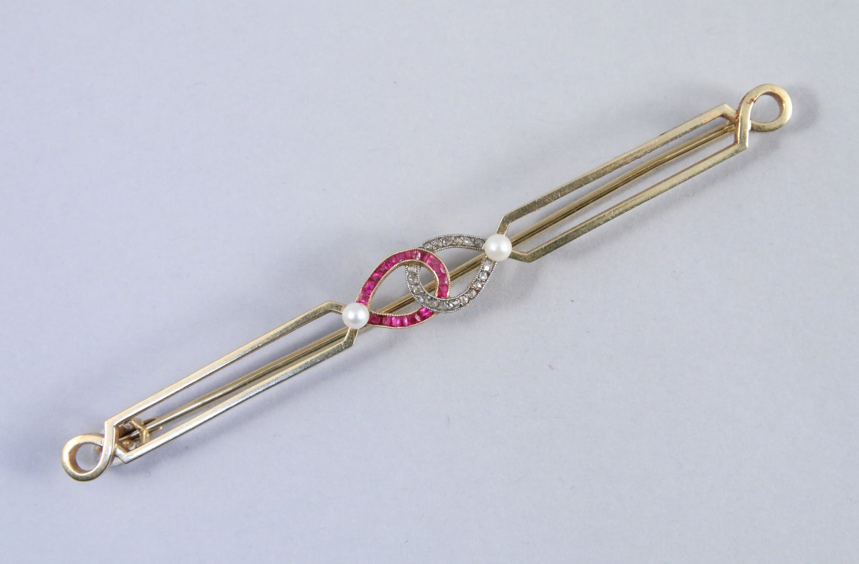 BROCHE en or jaune 750 milièmes à entrelacs géométriques ornés de DIAMANTS, SAPHIRS et PERLE.