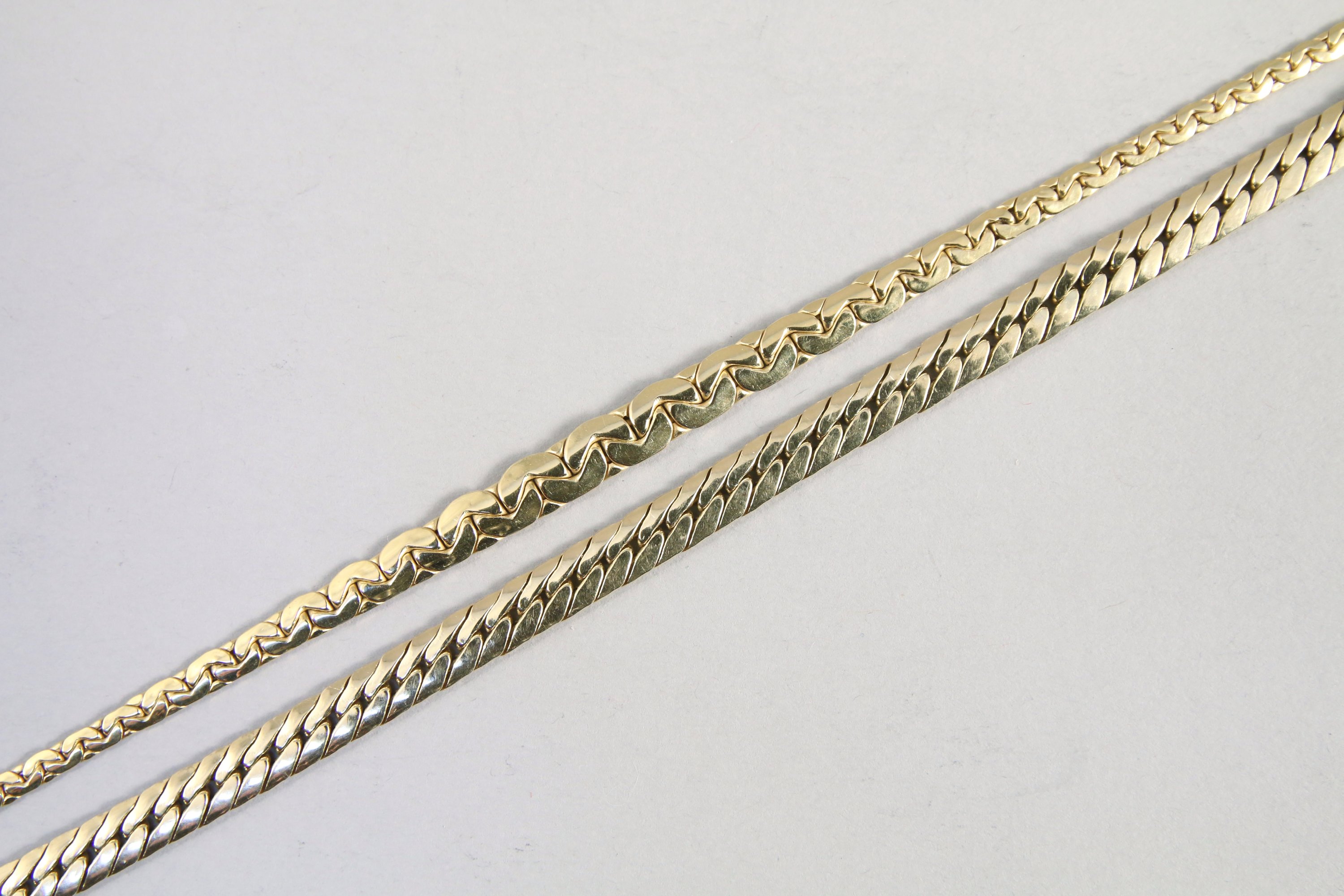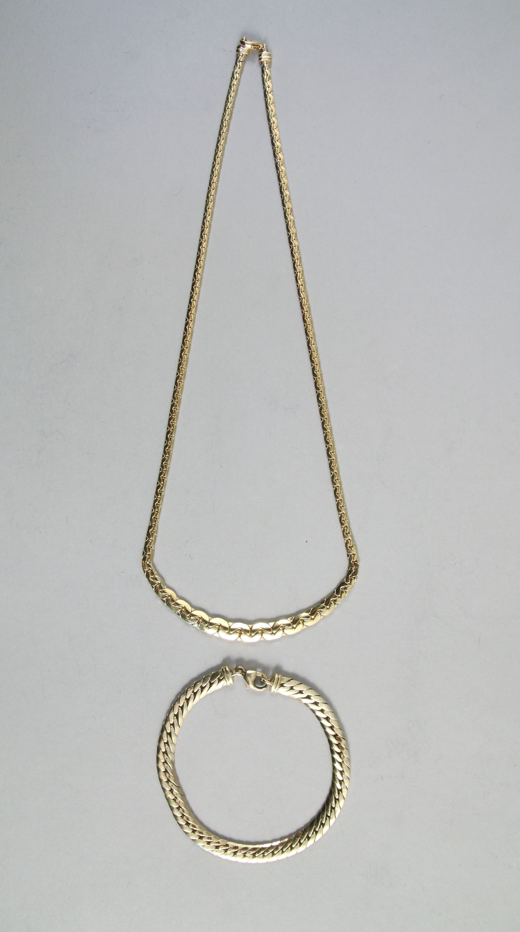 PARRURE en or jaune 750 milièmes à maille à entrelacs plates et articulées (deux modèles) comprenant un BRACELET (Long. 17 cm ; Poids 8,6 g) et un COLLIER (Long. 40,5 cm ; Poids 6,7 g).