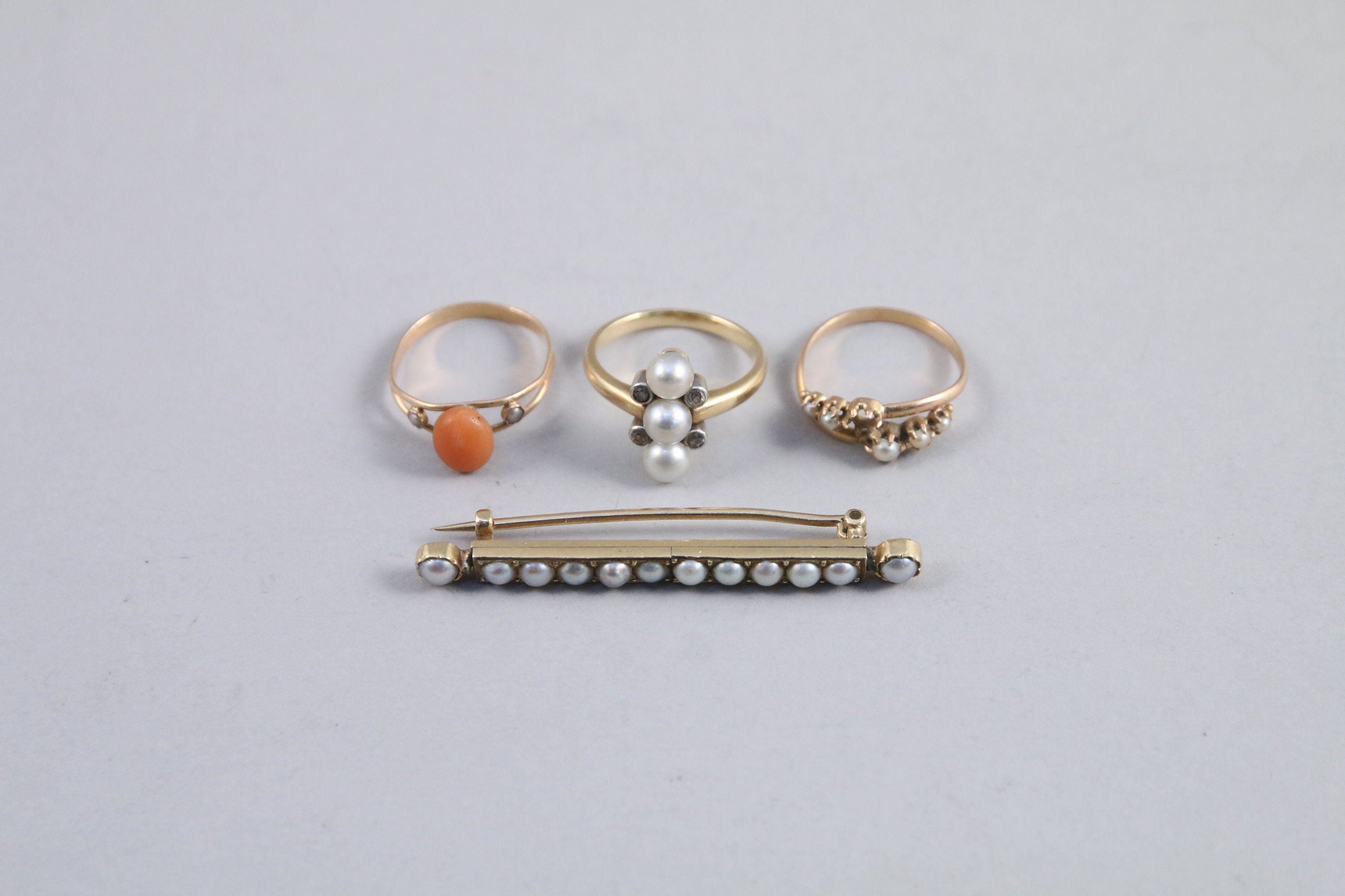 BIJOUX dont BROCHE BARETTE à décor de perles et TROIS BAGUES, UNE ornée de perles, UNE d'un cabochon de corail, et UNE ornée de perles (une perle manquante).