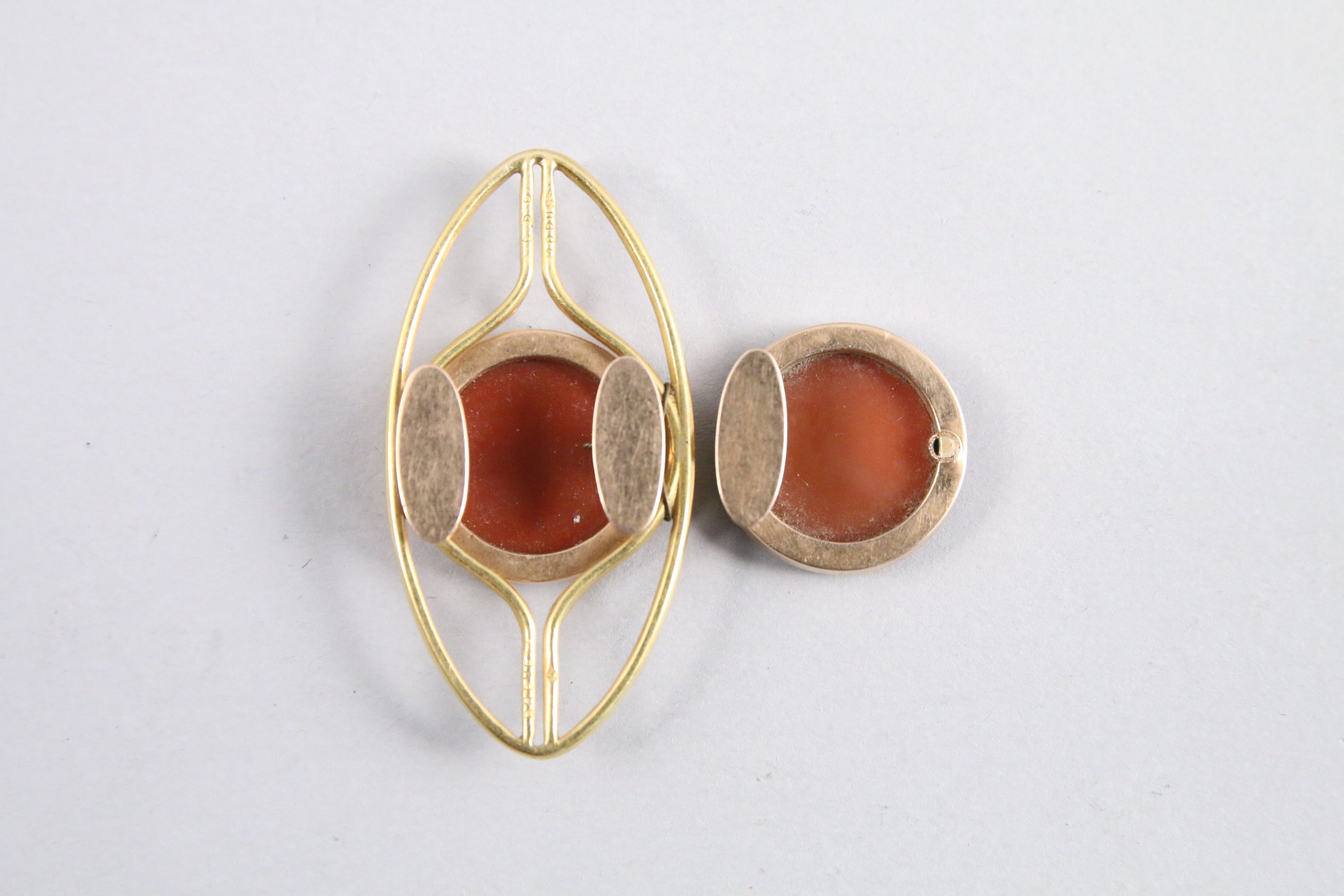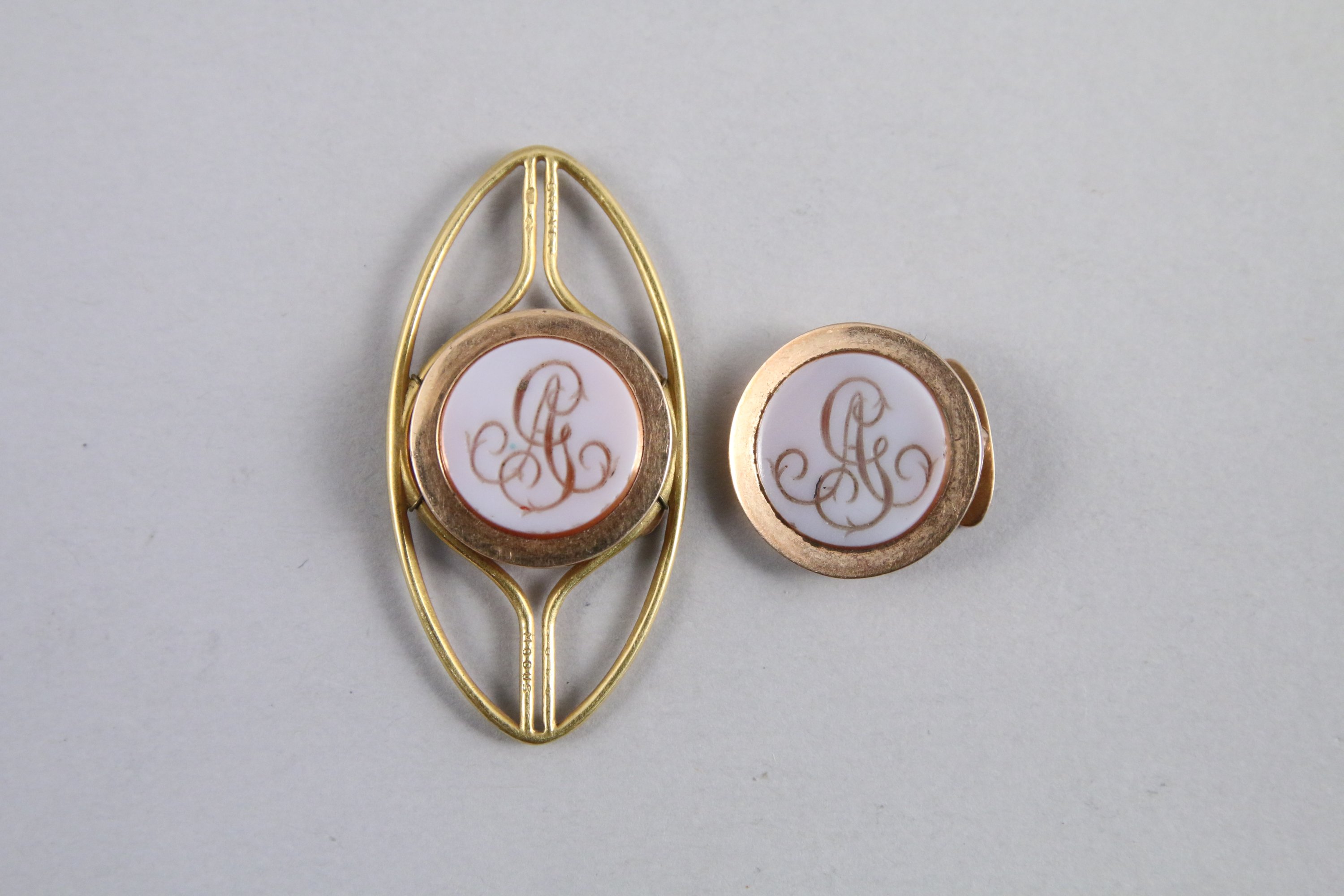 JOINT : PAIRE de BOUTONS de MANCHETTES en or jaune ornée d'une pierre dure gravée du monogramme AG. Poids brut 9,5 g (accidents et manques à l'un).