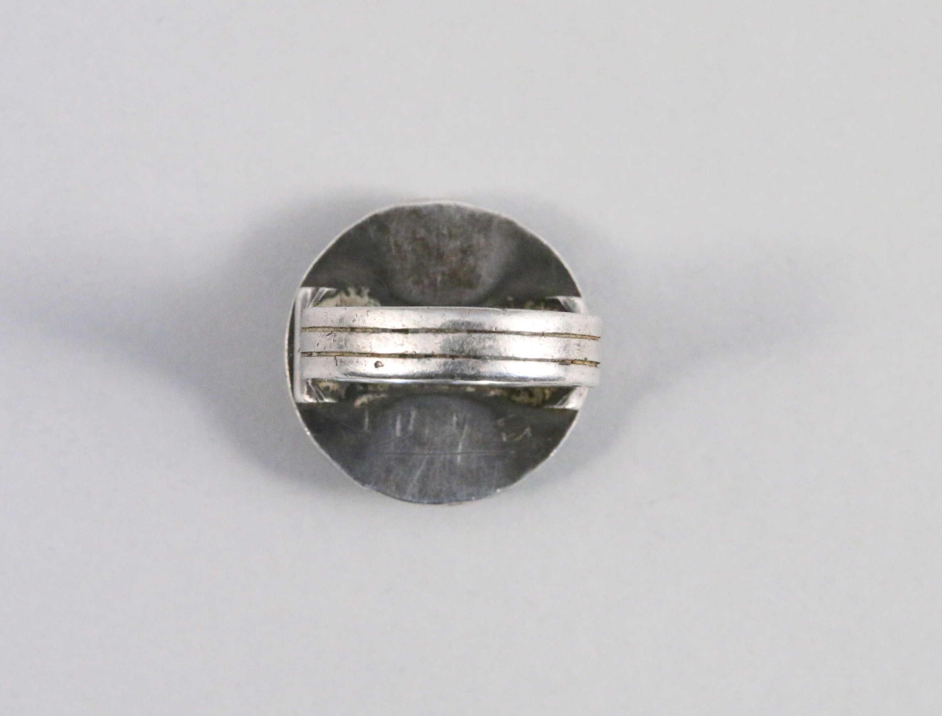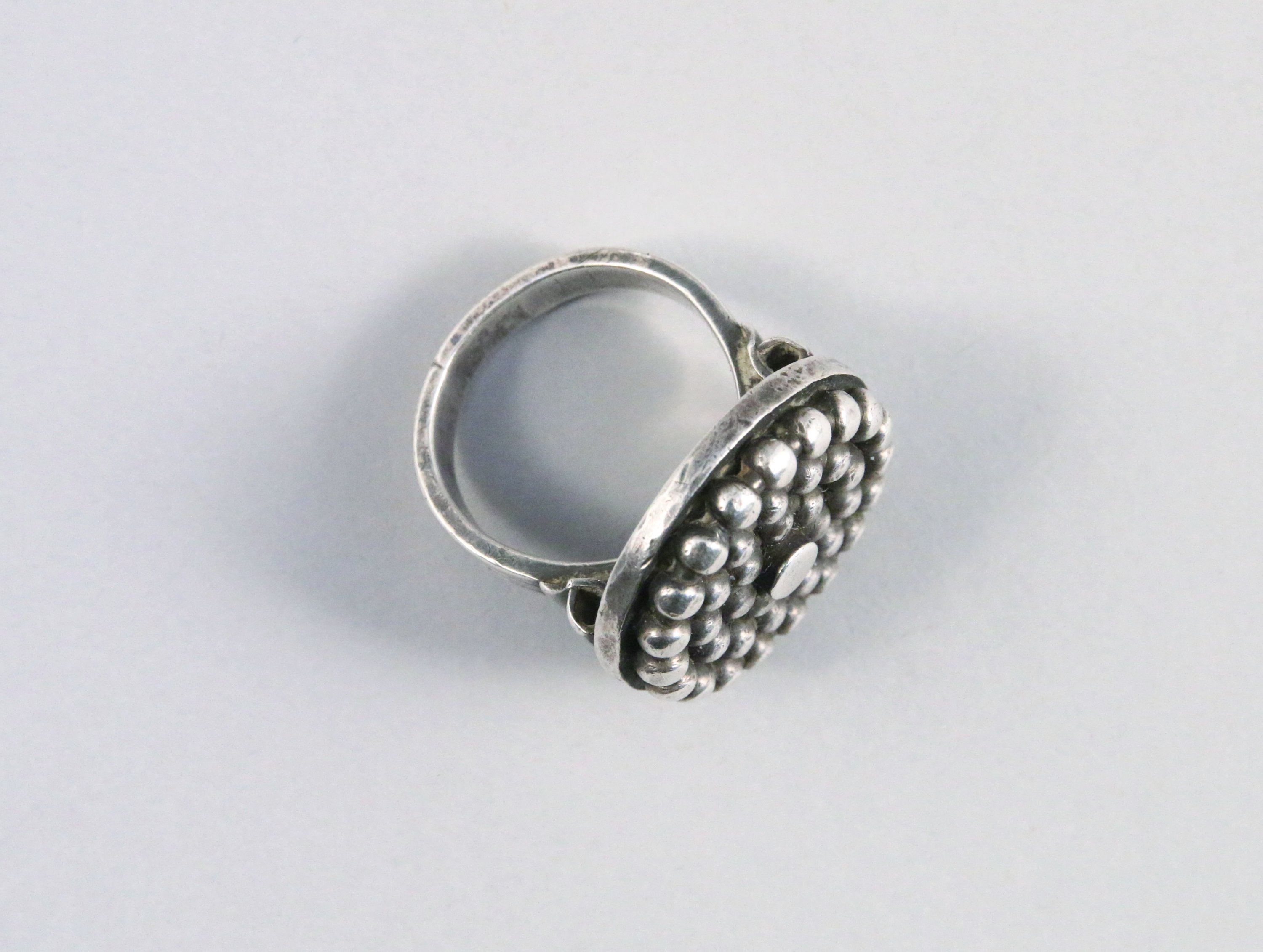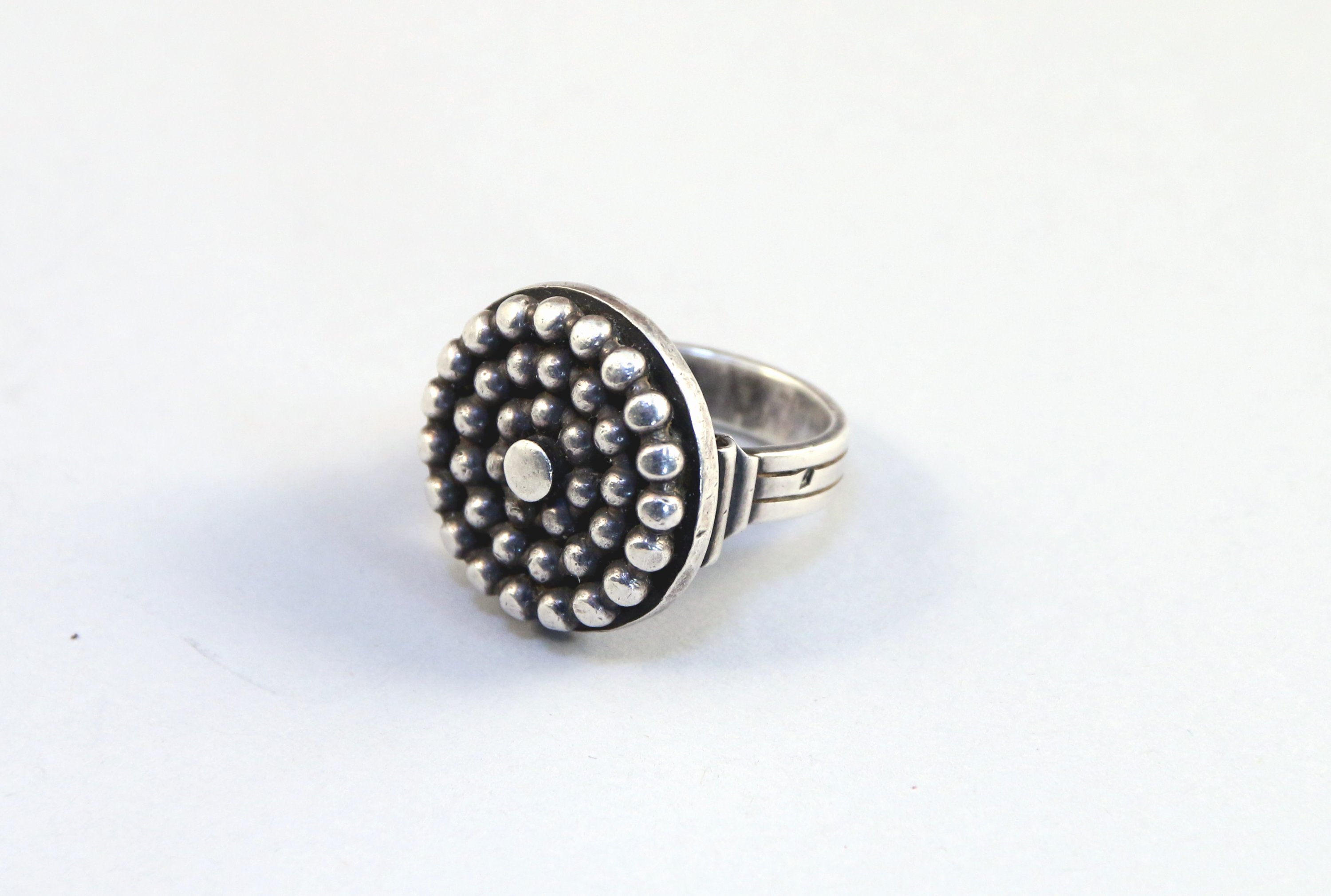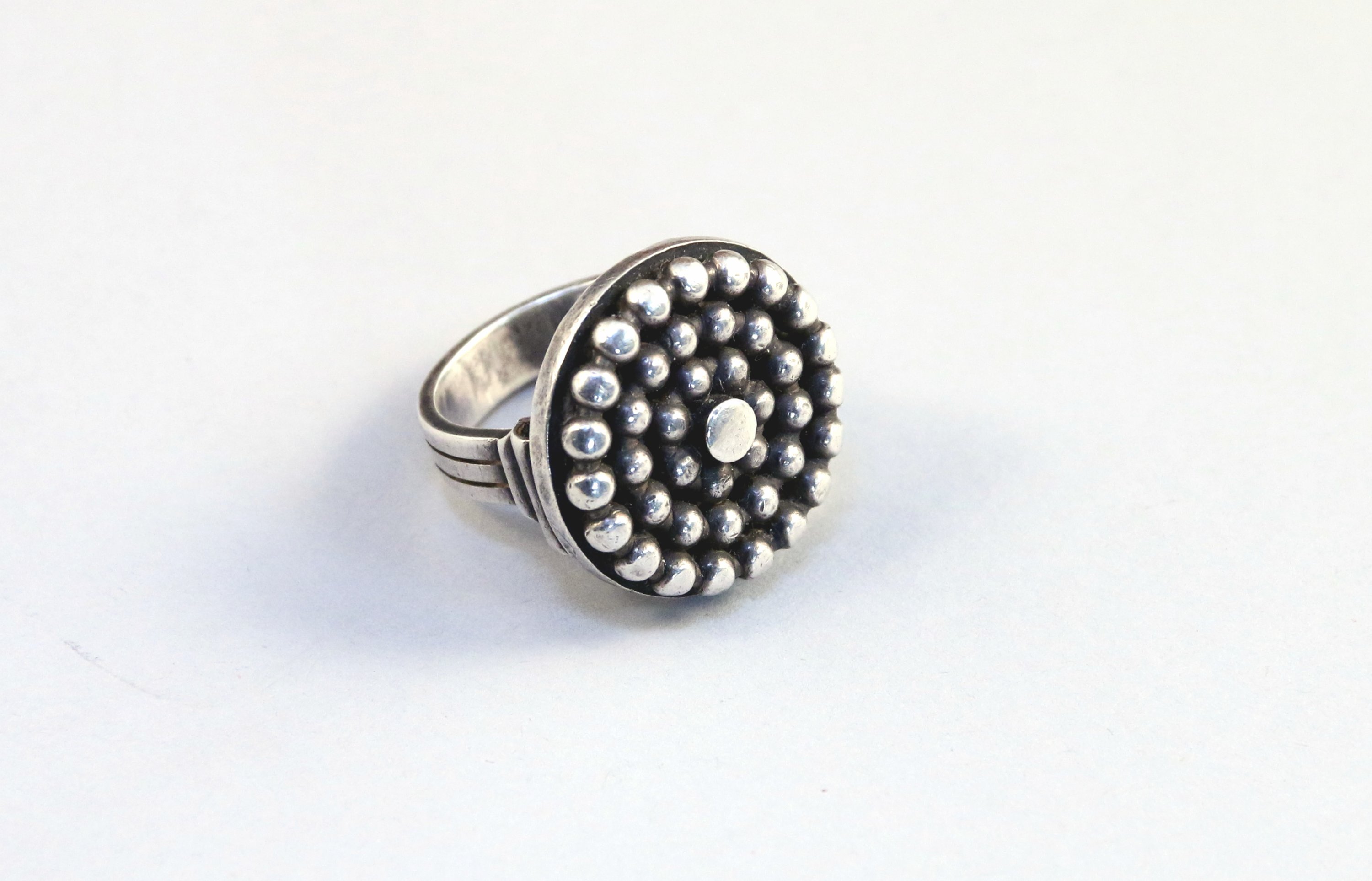 De forme ronde aux motifs concentriques de billes d'argent traitées en granulation, celle du centre, légèrement plus grande, est aplatie. L'anneau, scandé par deux lignes gravées parallèles, rejoint le plateau par deux enroulements géométriques.