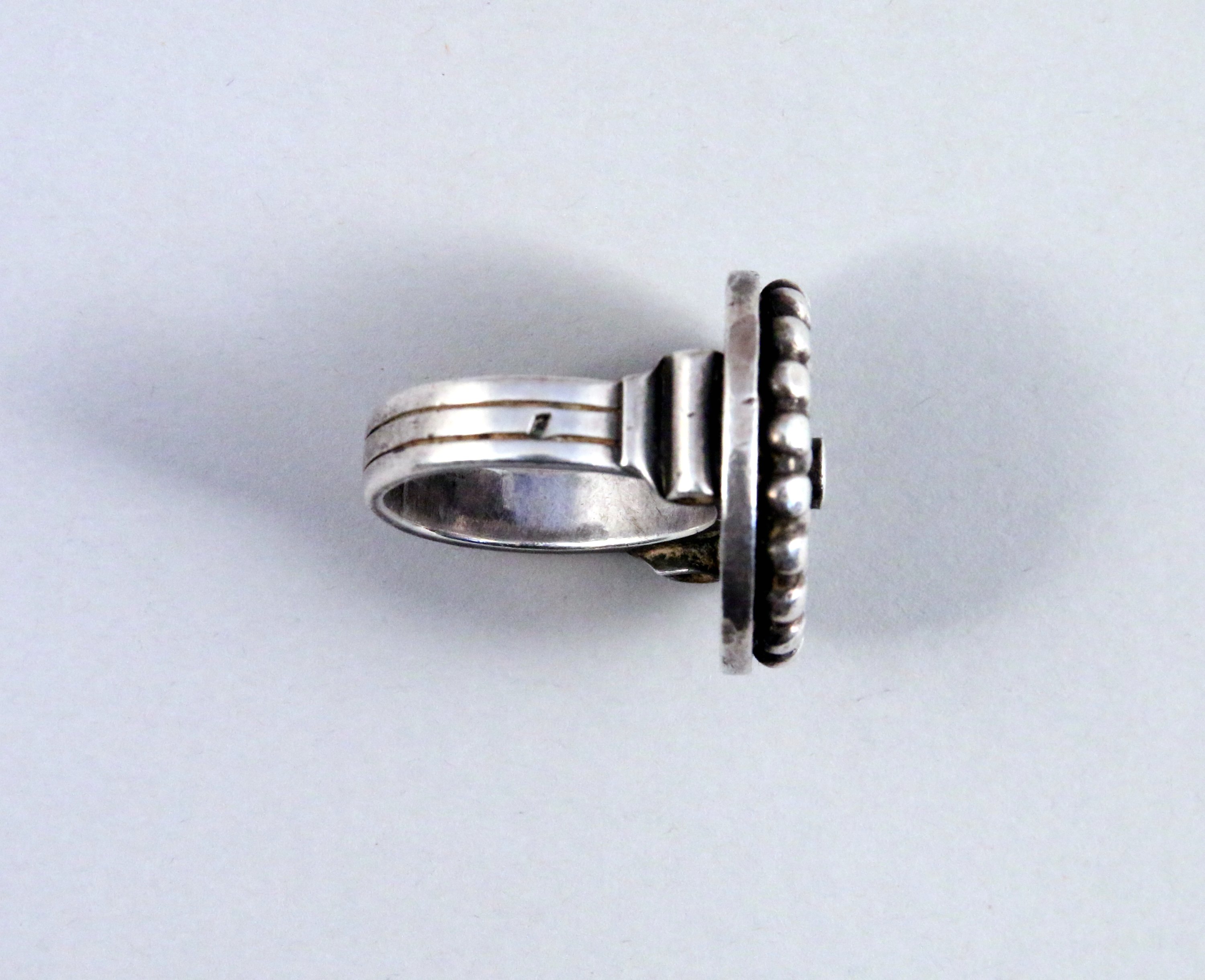 Notre modèle s'il prend la forme de la bague engrenage du musée d'Avallon s'en distingue par ses motifs obtenus par granulation de l'argent. Ce décor très caractéristique, se retrouve dans d'autres bijoux de Jean Després comme la broche et les boucles d'oreilles exposées au salon d'Automne parisien de 1936 (reproduites p. 101 du même ouvrage).