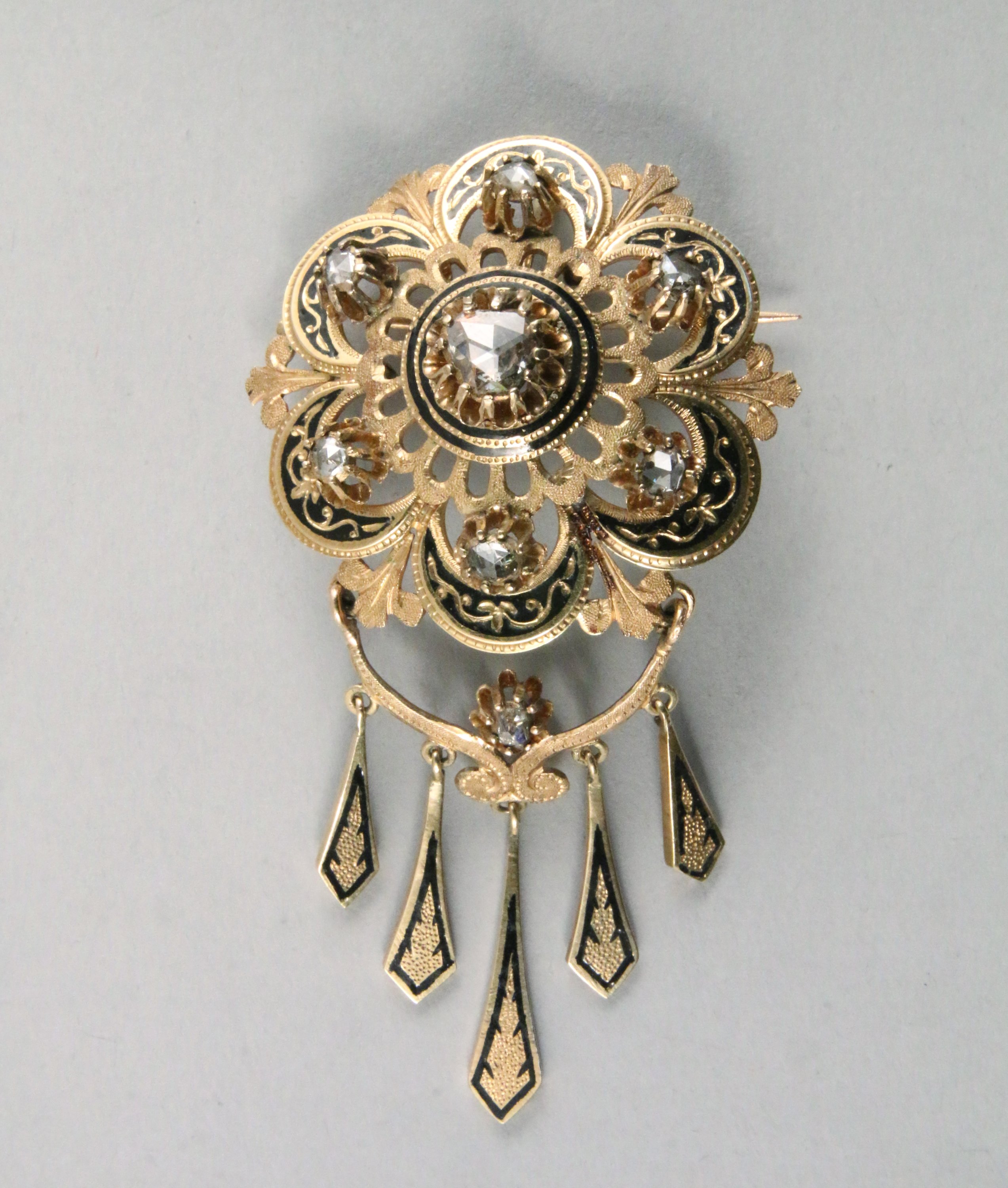 BROCHE POLYLOBÉES à PENDELOQUES en or jaune 750 milièmes ornée au centre d'un DIAMANT taillé en rose, et de six petits diamants en rose monture à griffes. Décor végétal ajouré rehaussé d'un émail noir.