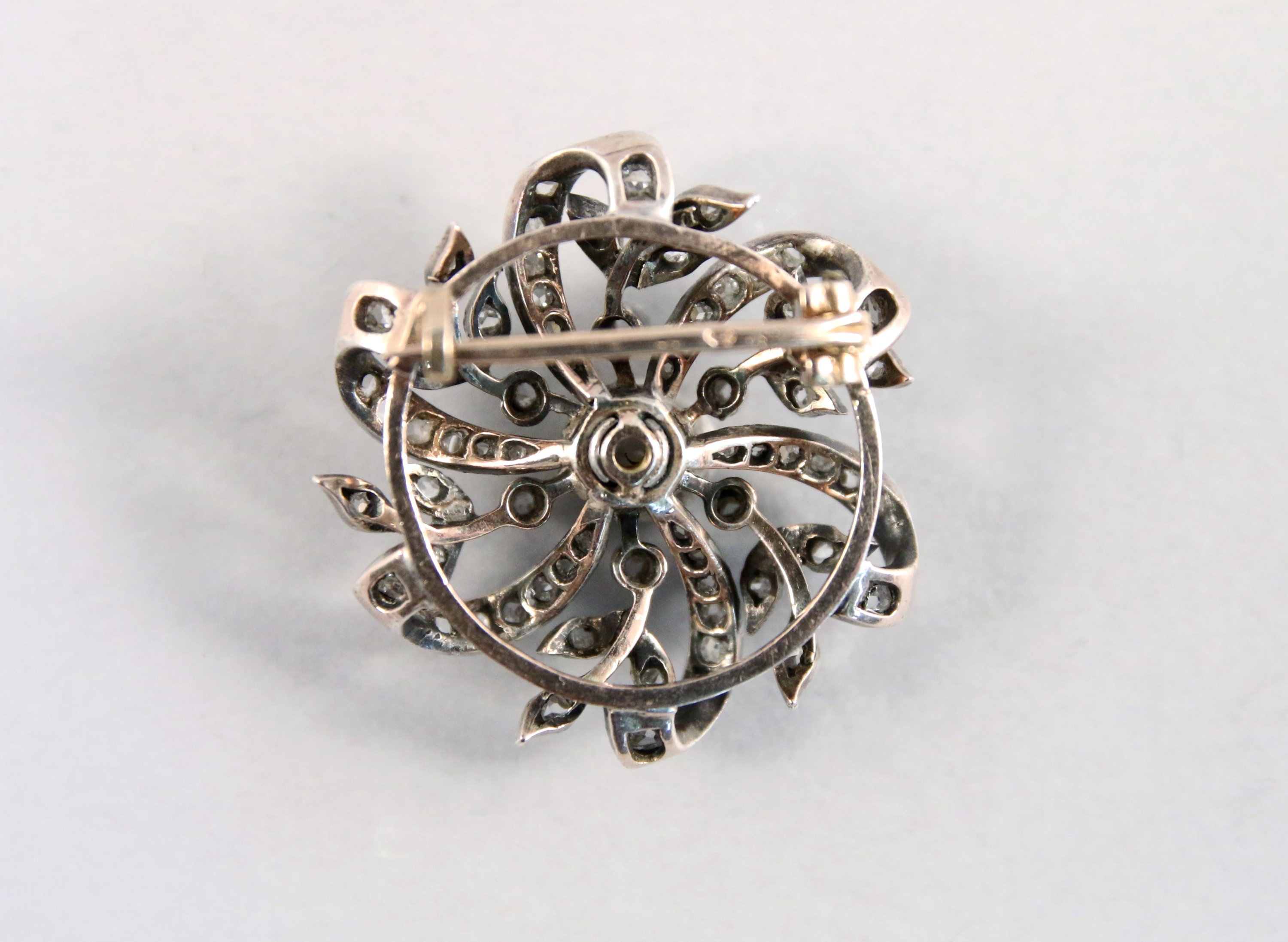 BROCHE ROSACE en or et argent sertie à griffes d'un DIAMANT central de taille ancienne. Il est flanqué de six brillants et pierres blanches taillés en rose, tout comme les tournoyants rubans et branches à trois feuilles.