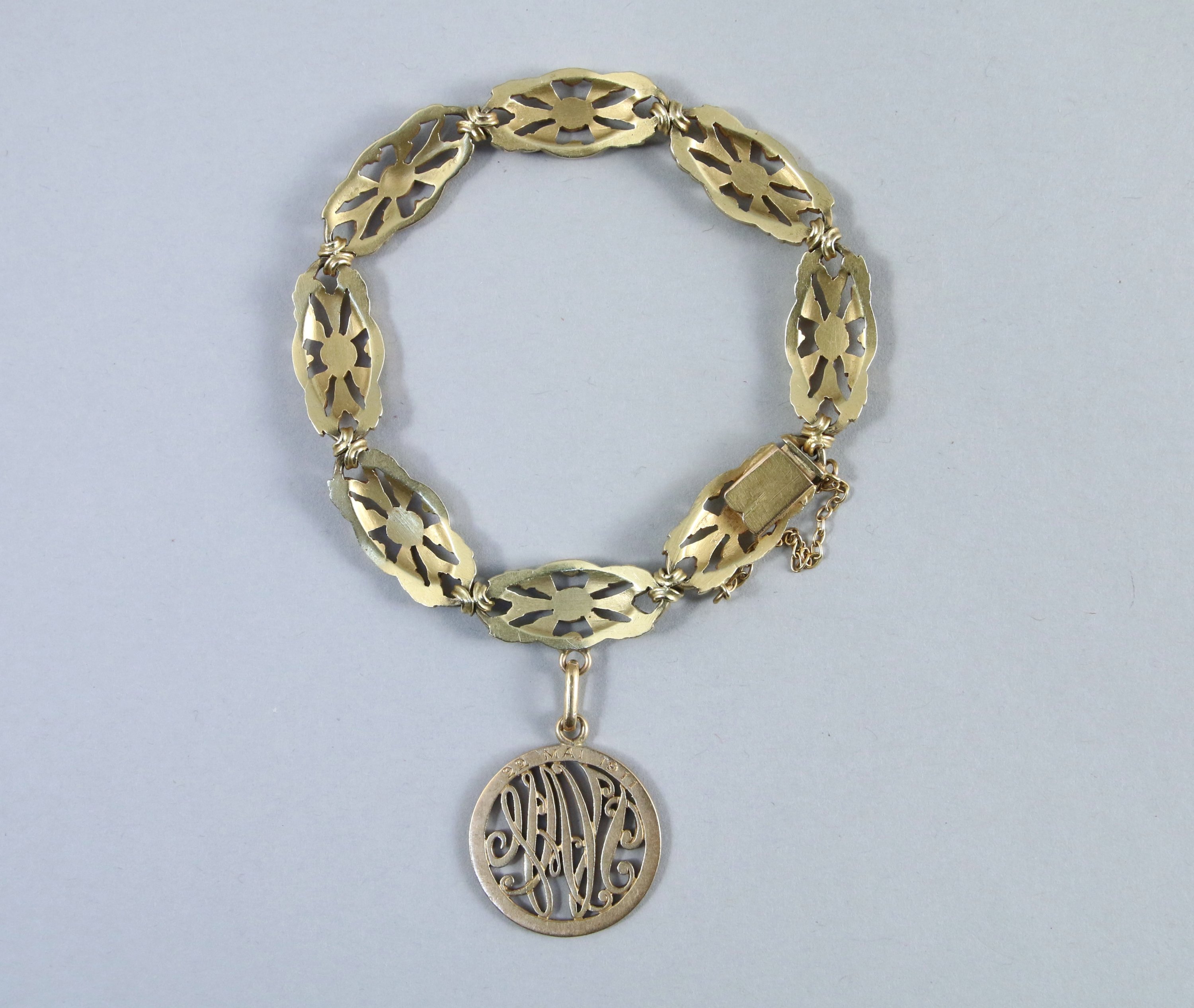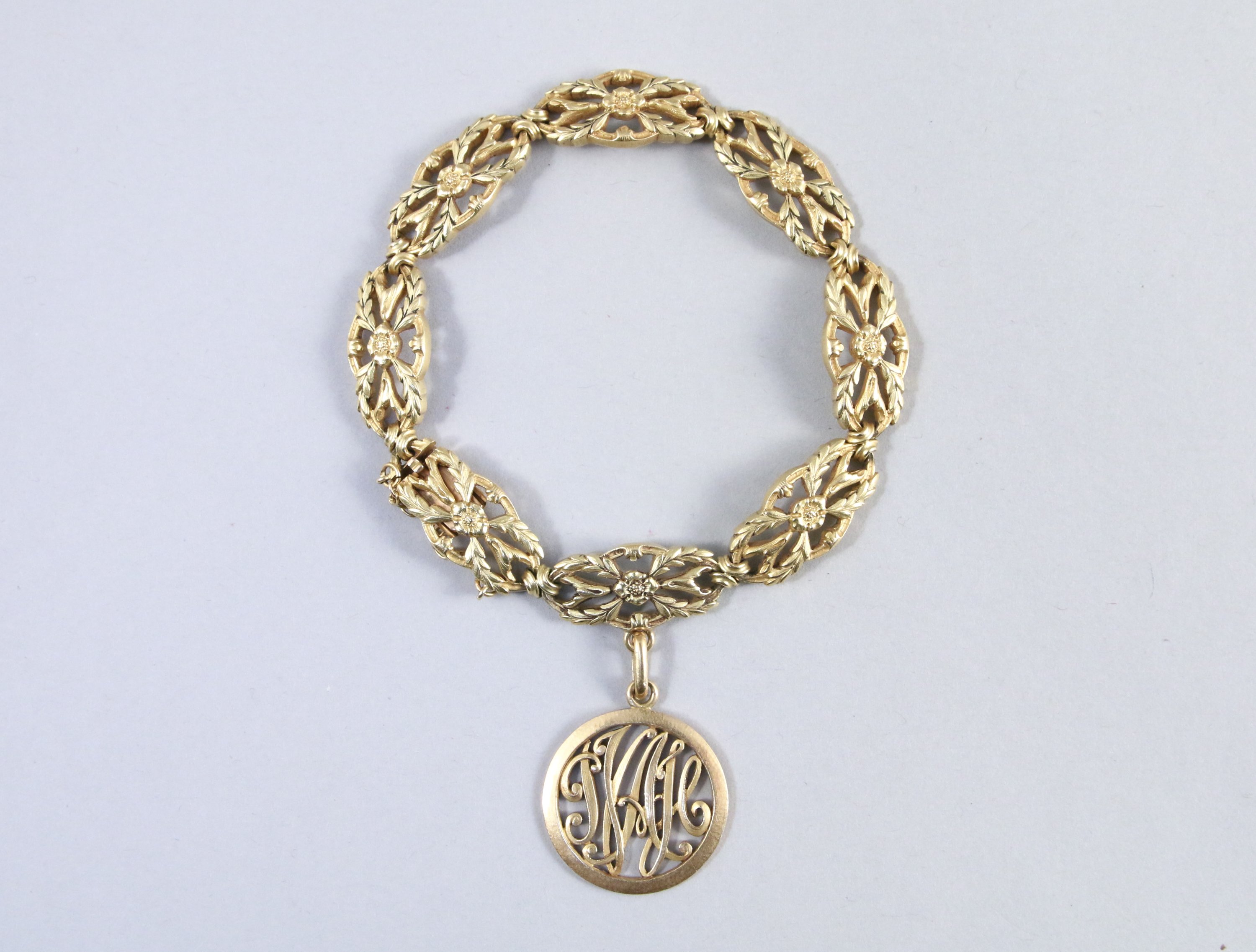 BRACELET en or jaune composé de huit fleurs ajourées et orné d'une médaille.