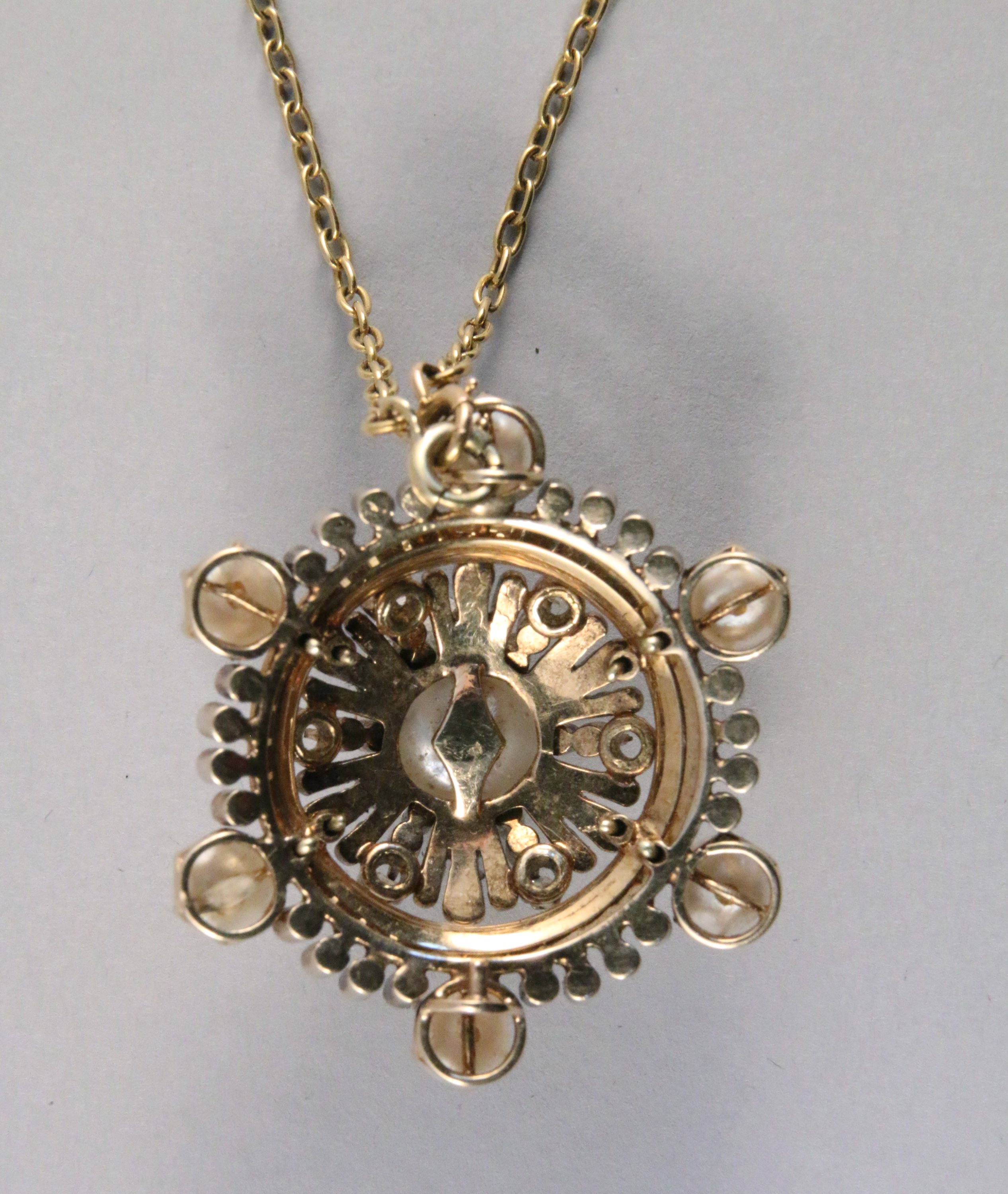 BROCHE en or jaune 750 milième de forme ciculaire onré de sept permes dans un entourage de petits diamants taillés en rose. Montée en PENDENTIF avec une chaînette à maille forçat. L'épingle détachée jointe.