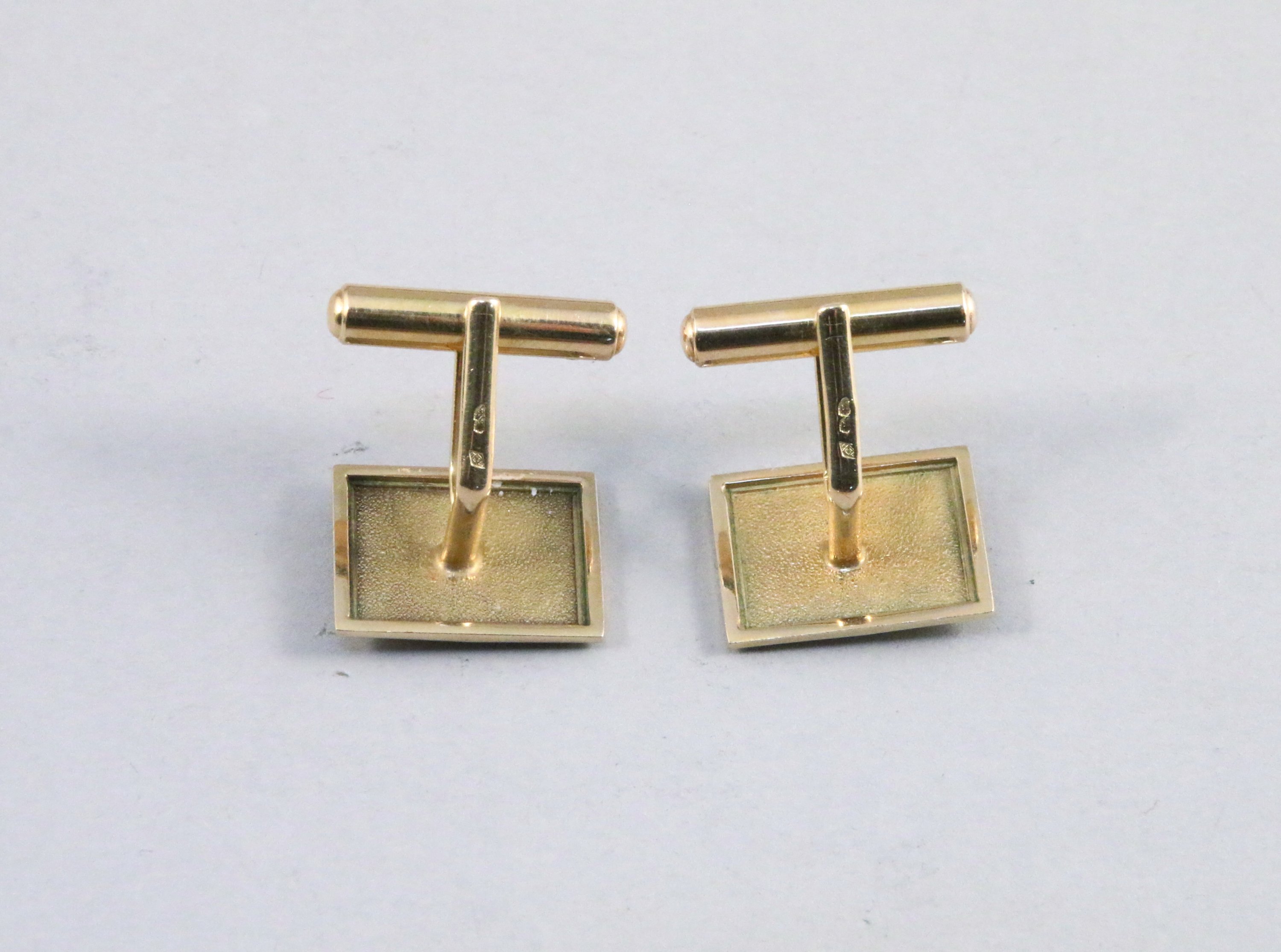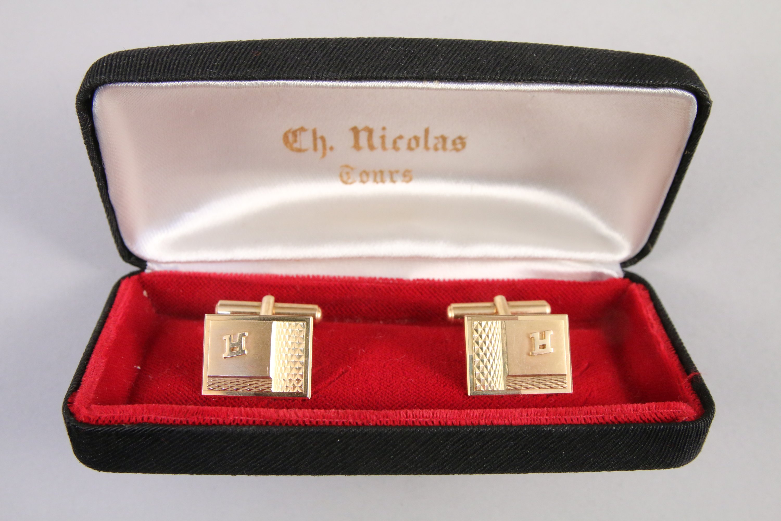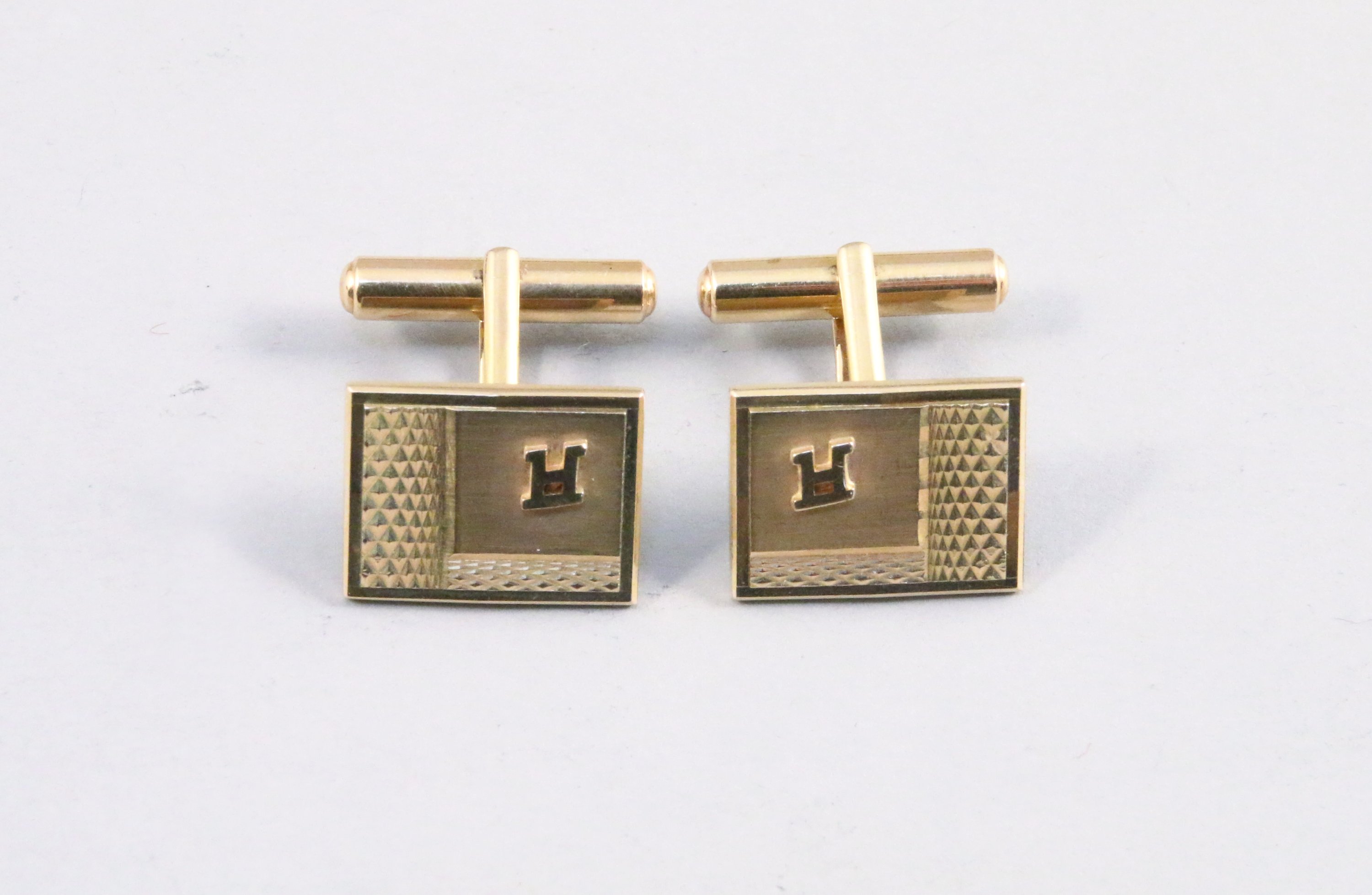 Paire de BOUTONS de MANCHETTES en or jaune 750 millièmes, monogrammés "A" dans un cartouches de motifs géométriques illusionnistes. Fermoir en or articulé.