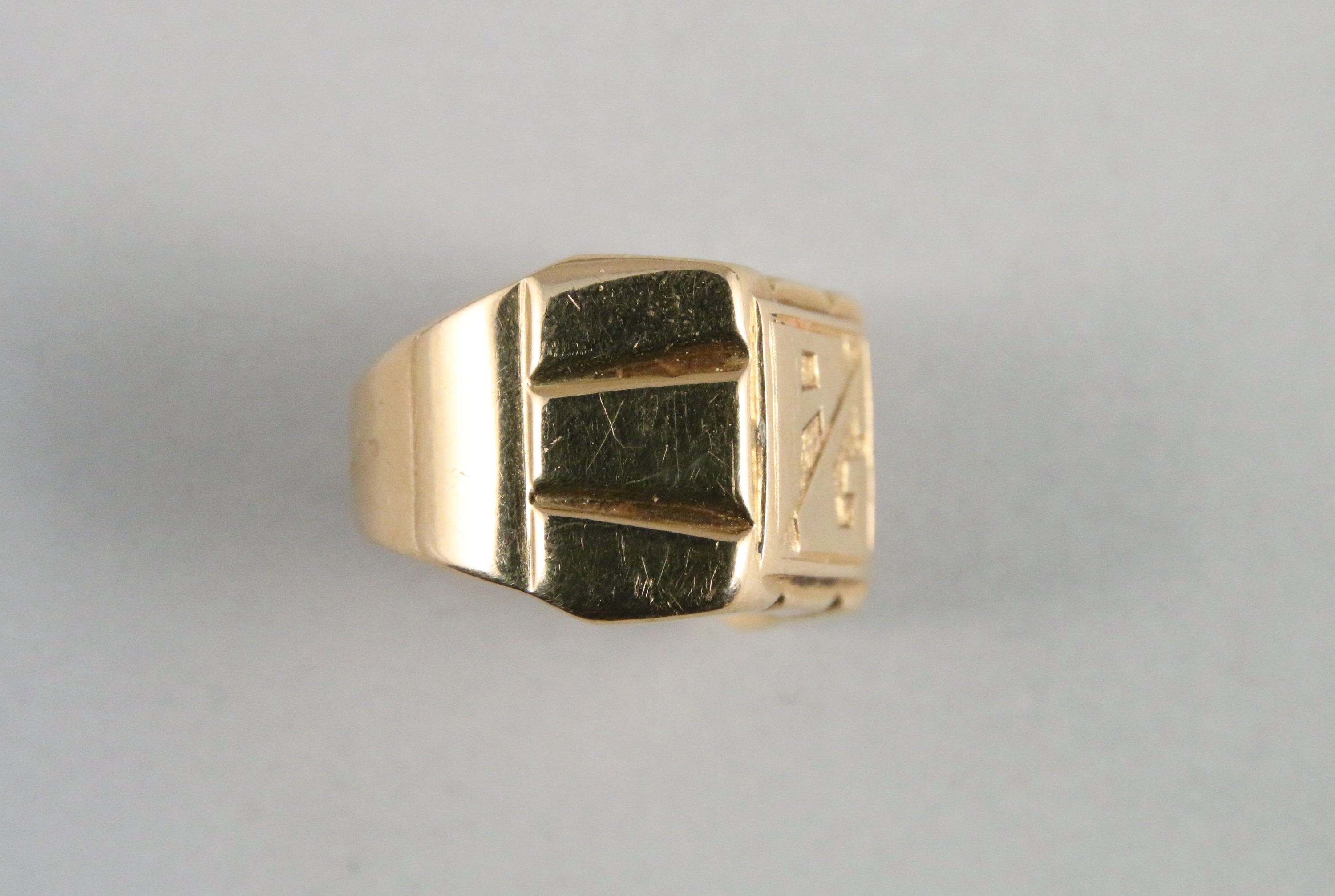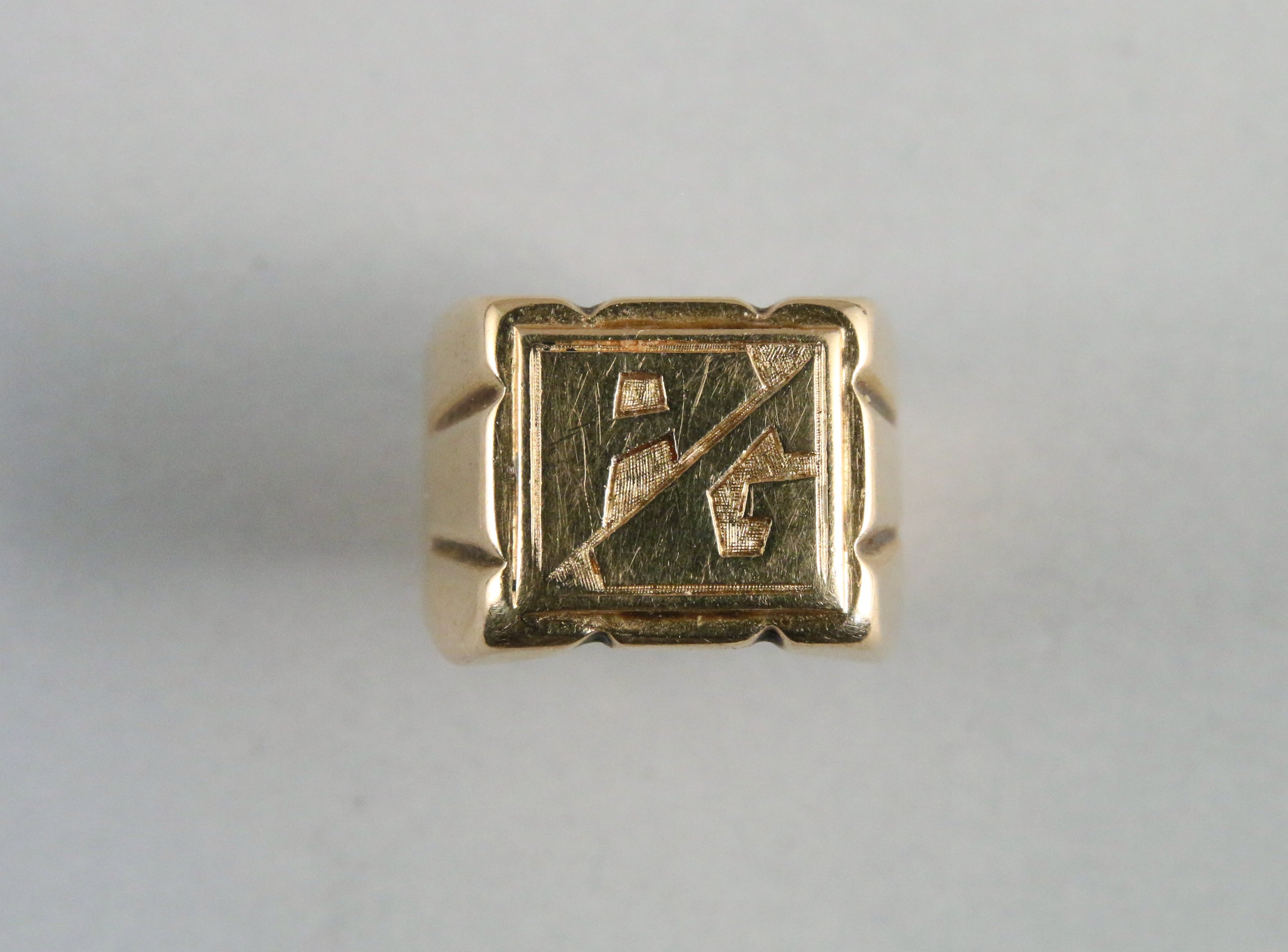 BAGUE CHEVALIÈRE d'HOMME en or jaune 750 millièmes, le chaton gravé "AG".
