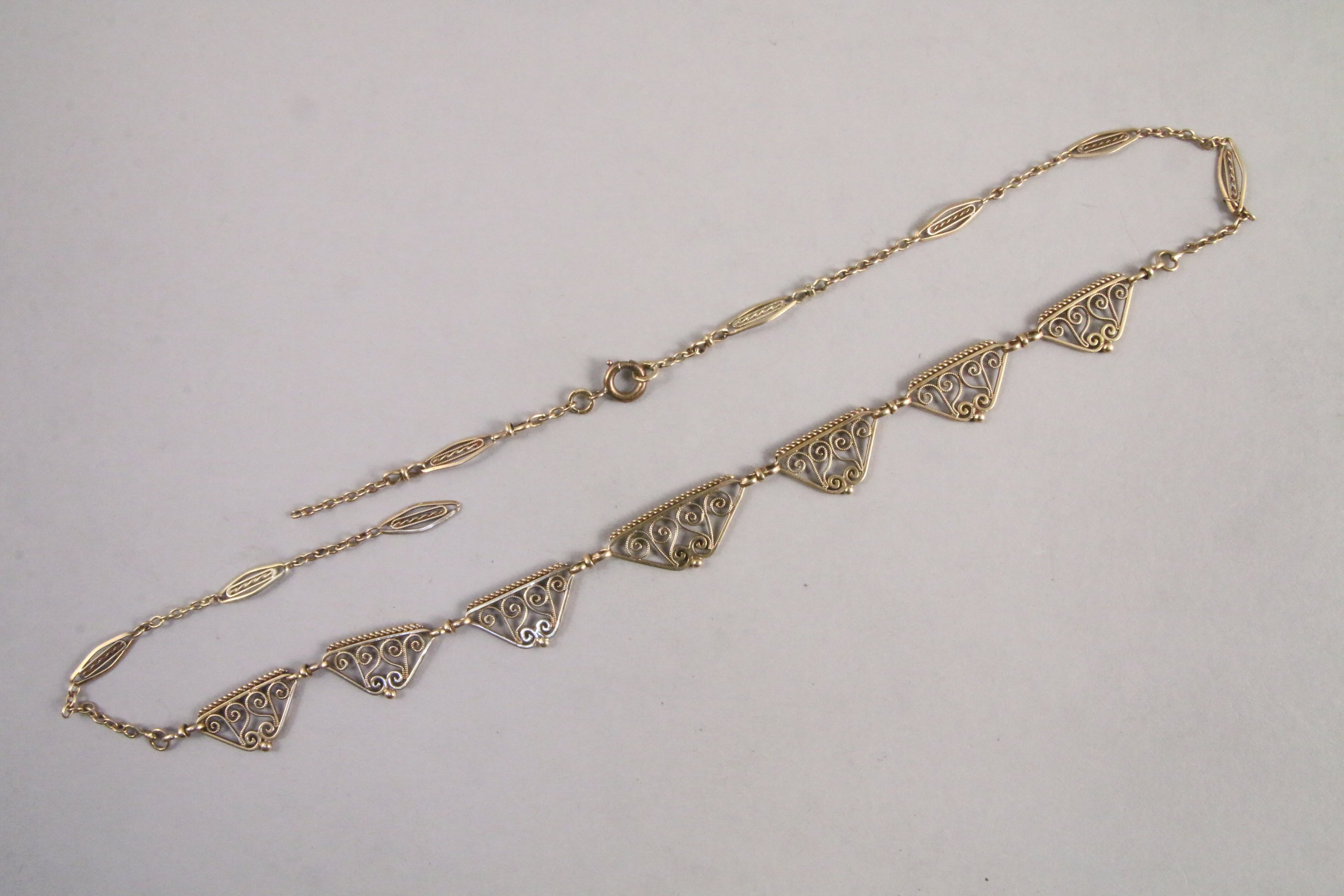 JOINT : COLLIER ARTICULÉ en or jaune 750 millièmes composé de sept motifs réticulés et de six perles filigrannées. Long. 47 cm. Poids 10,5 g. Accidenté.