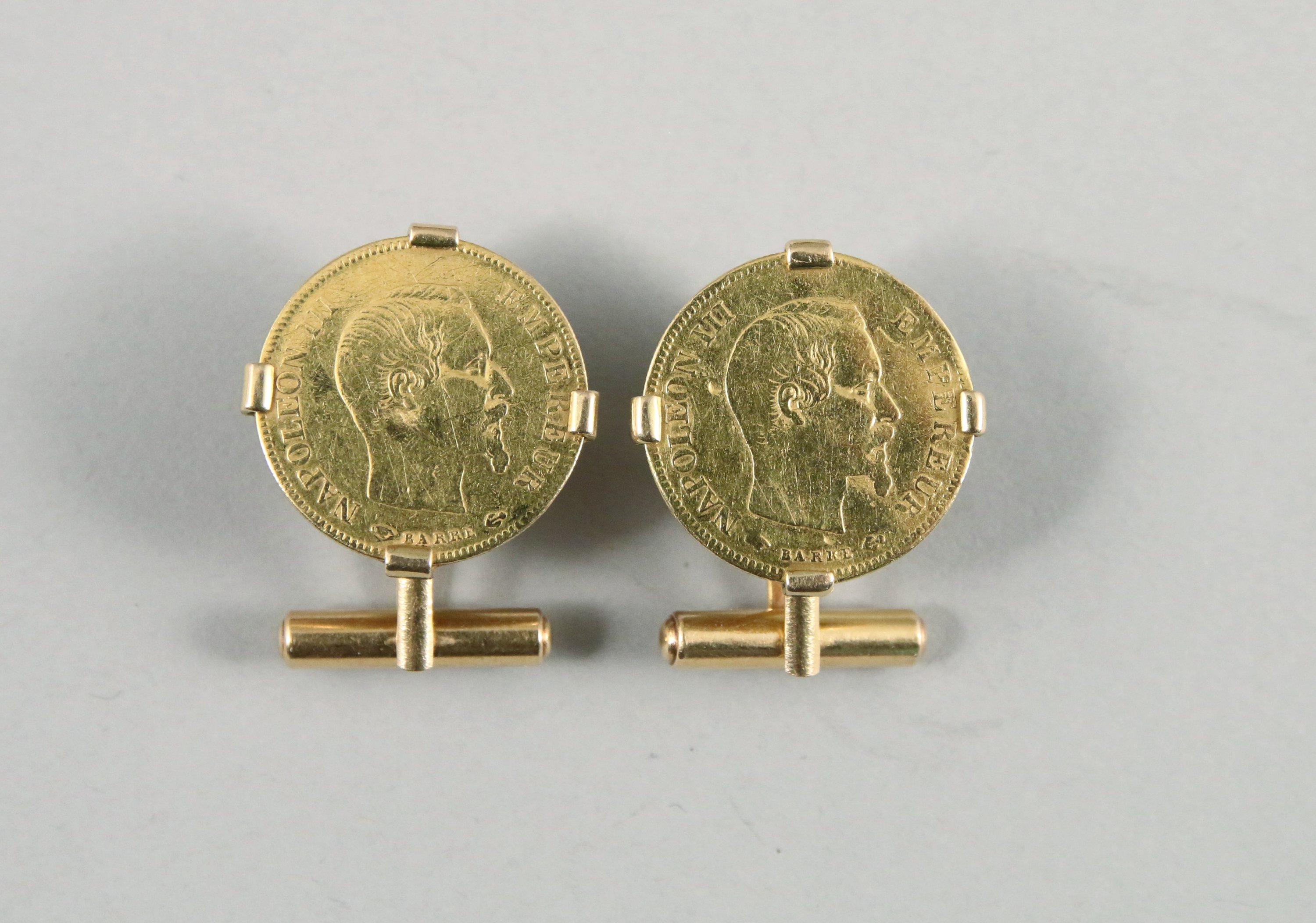 Paire de BOUTONS de MANCHETTES en or jaune 750 millième, chacun orné d'une pièce de 10 FRANC OR au profil de Napoléon III tête nue (1857).