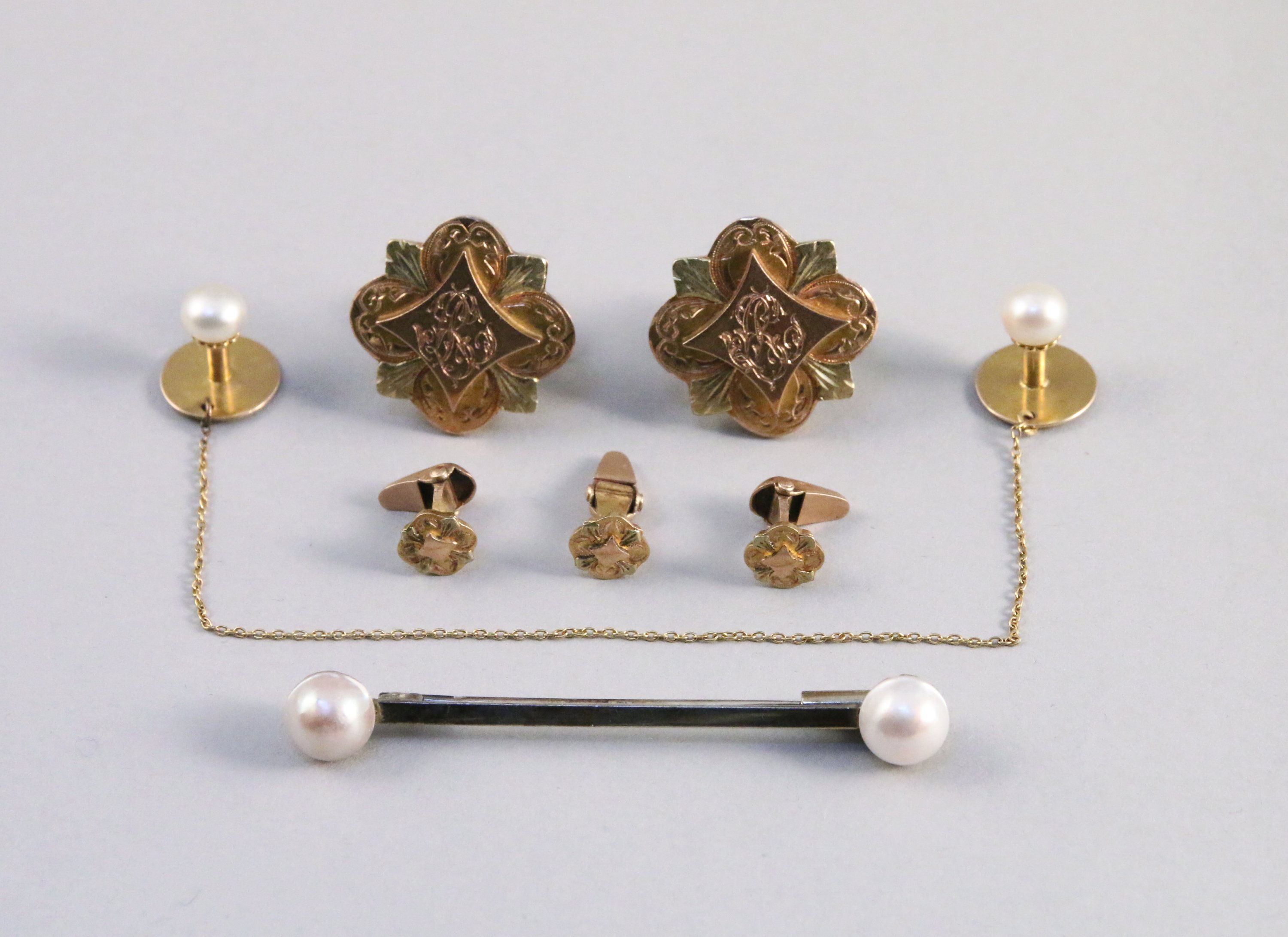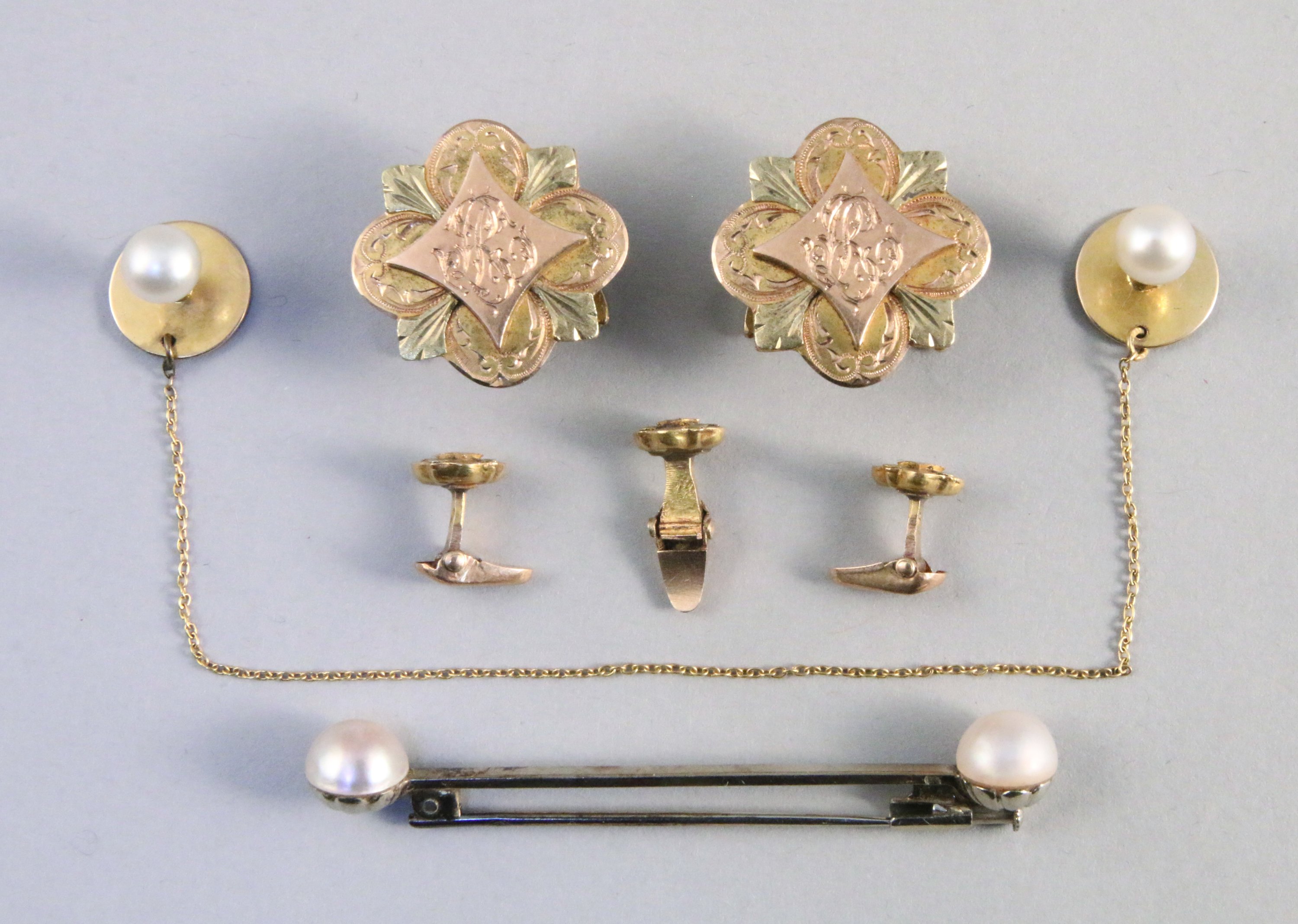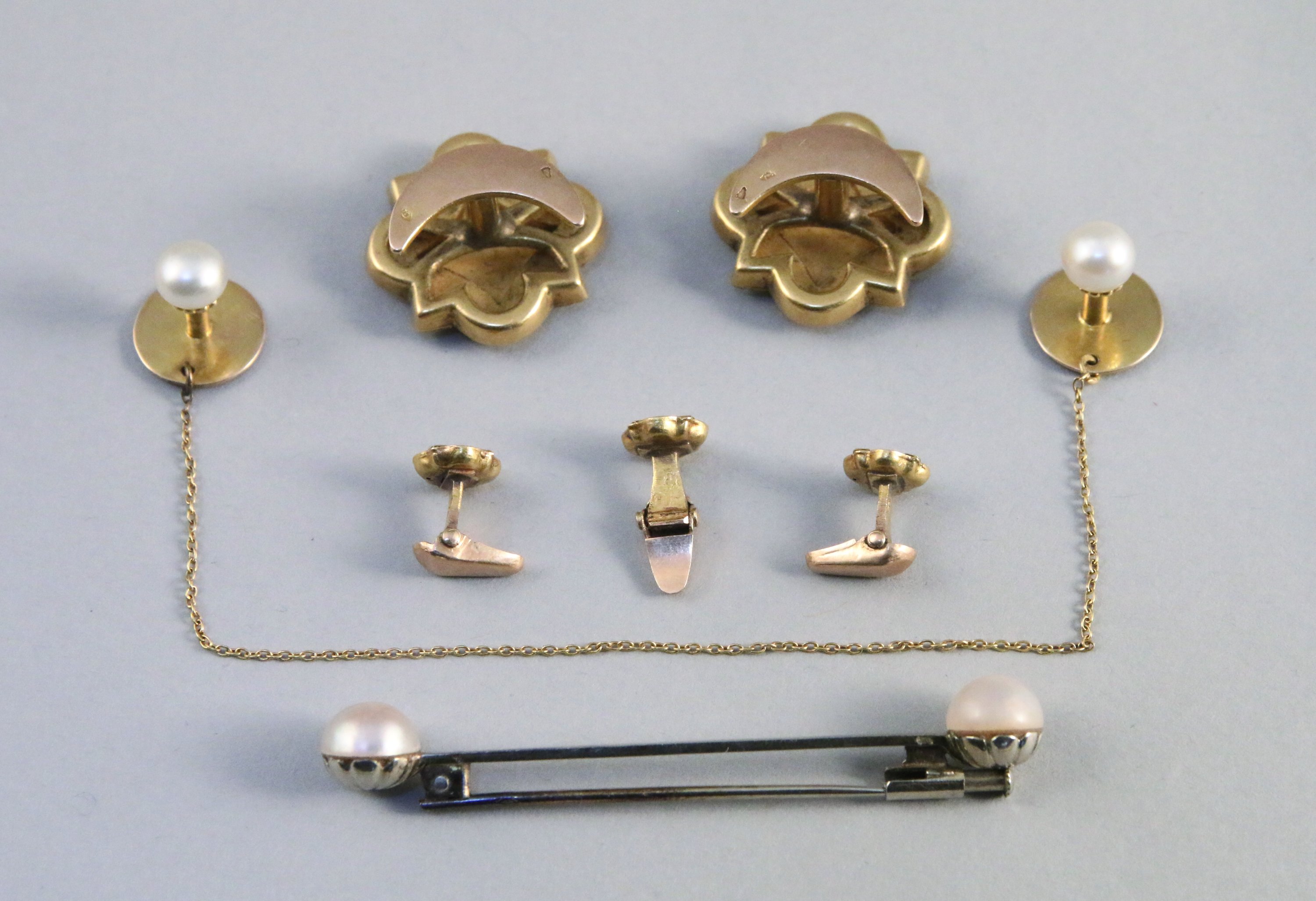 Paire de BOUTONS de COLS en or jaune orné d'une perle et réunis par une chaînette ainsi qu'une BROCHE BARETTE en or onrée de deux demi perles. (6,5 g).