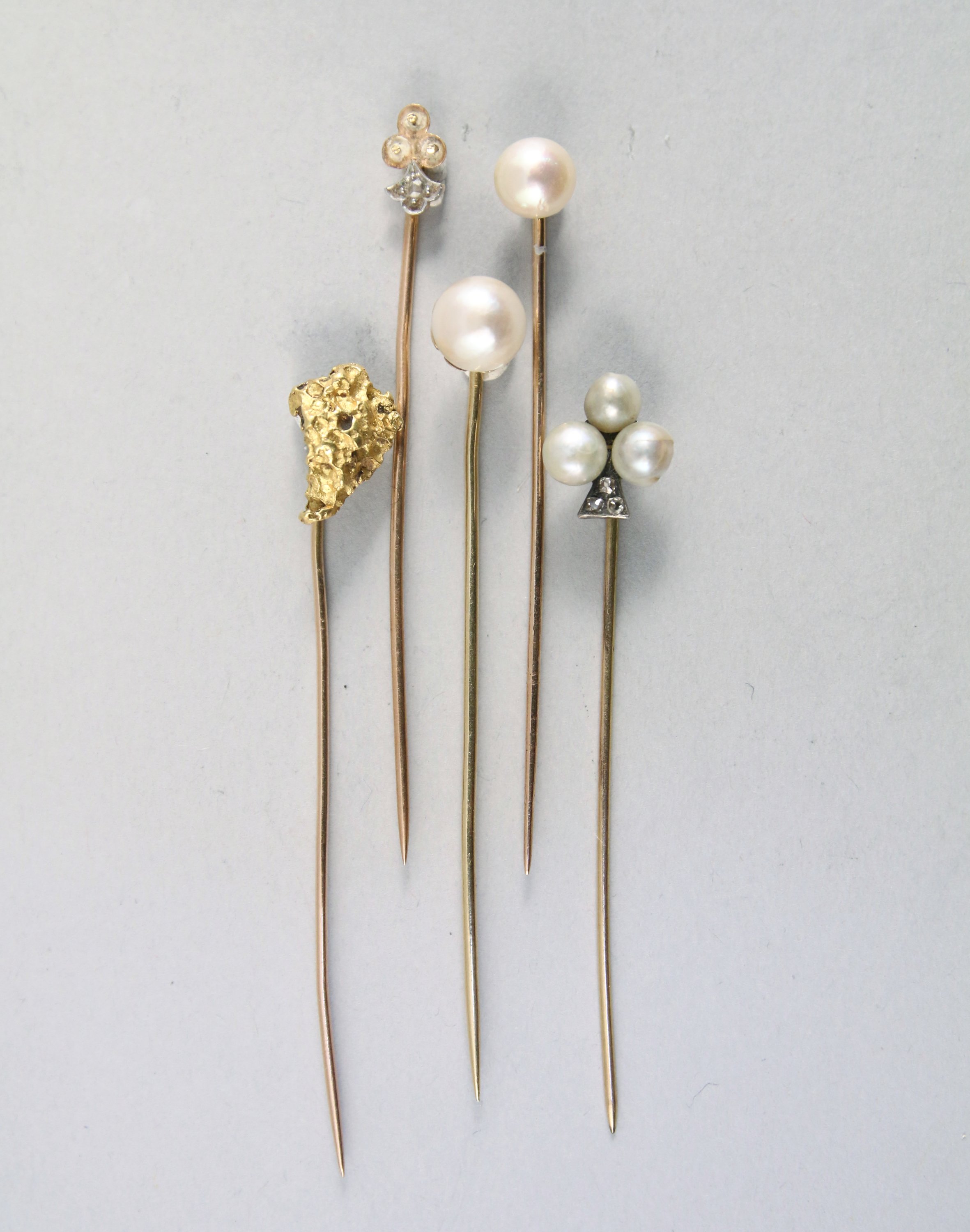 CINQ ÉPINGLES de CRAVATE en or jaune 750 milièmes. DEUX épingles ornée d'une perle de culture, UNE ornée d'une pépite, UNE ornée de trois perles formant un trèfle, UNE figurant un trèfle (manque les perles).