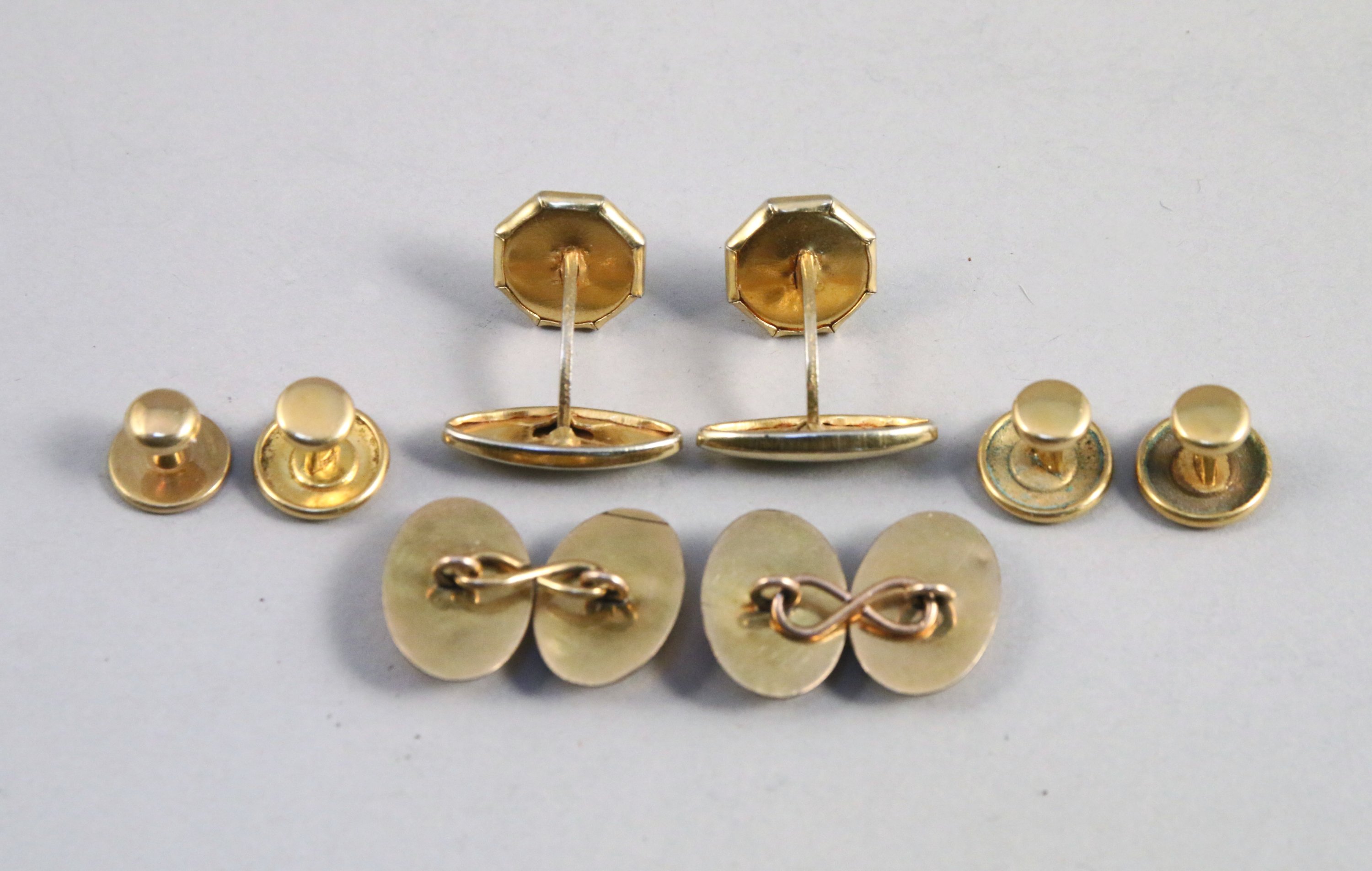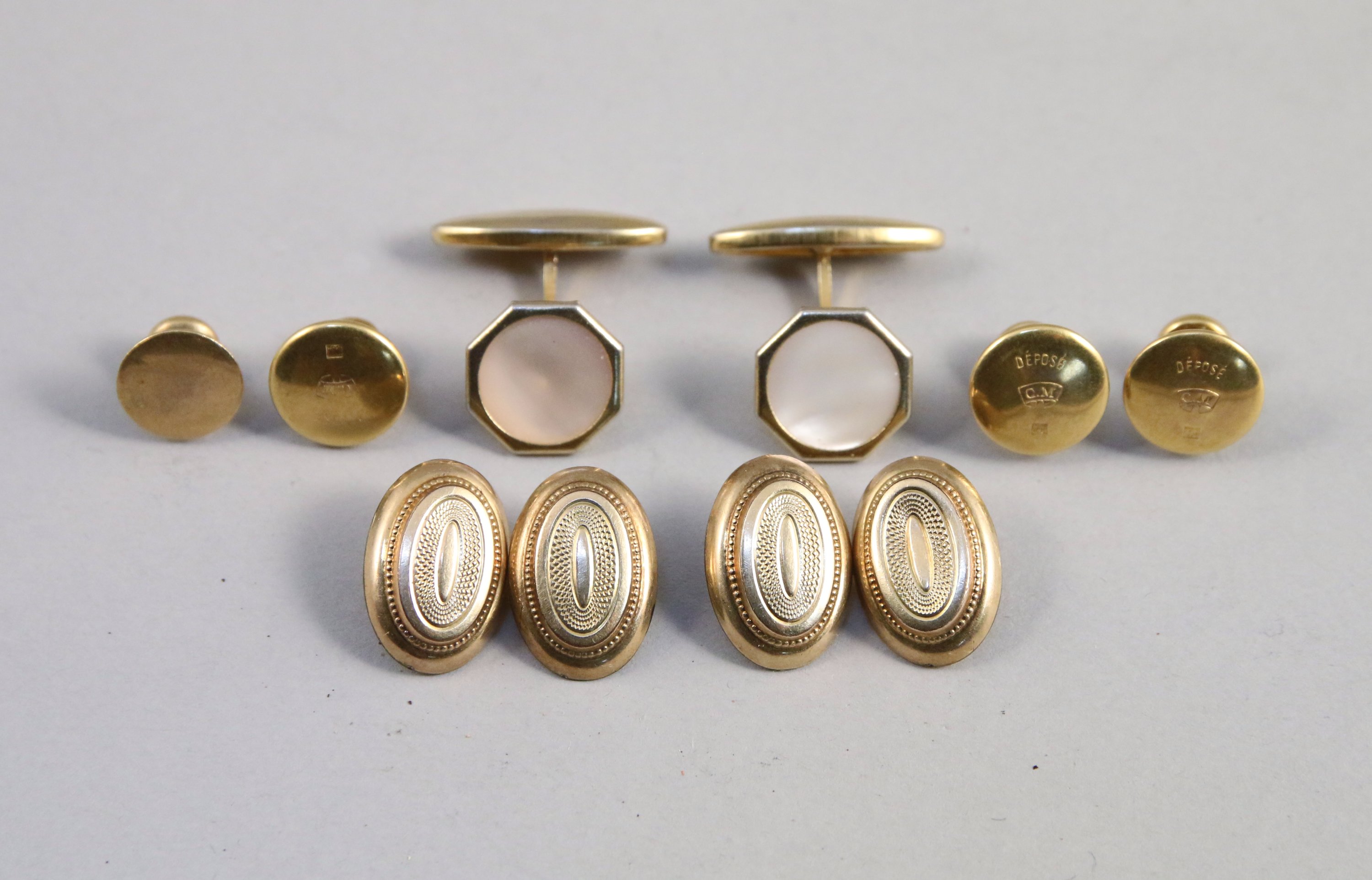 JOINT : 2 PAIRES de BOUTONS de MANCHETTES plaqué or, l'une ornée de nacre; et 4 boutons de col plaqués or.