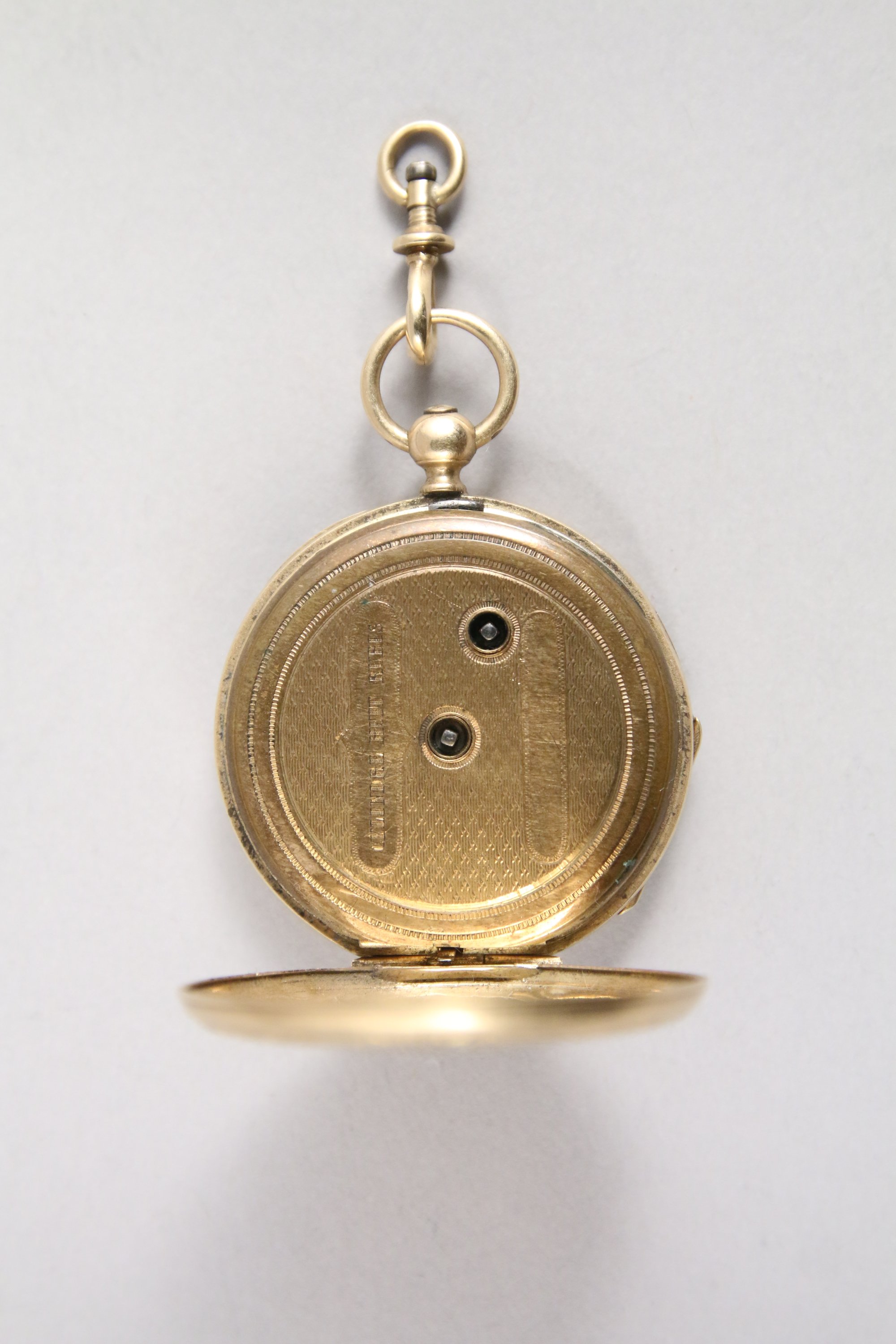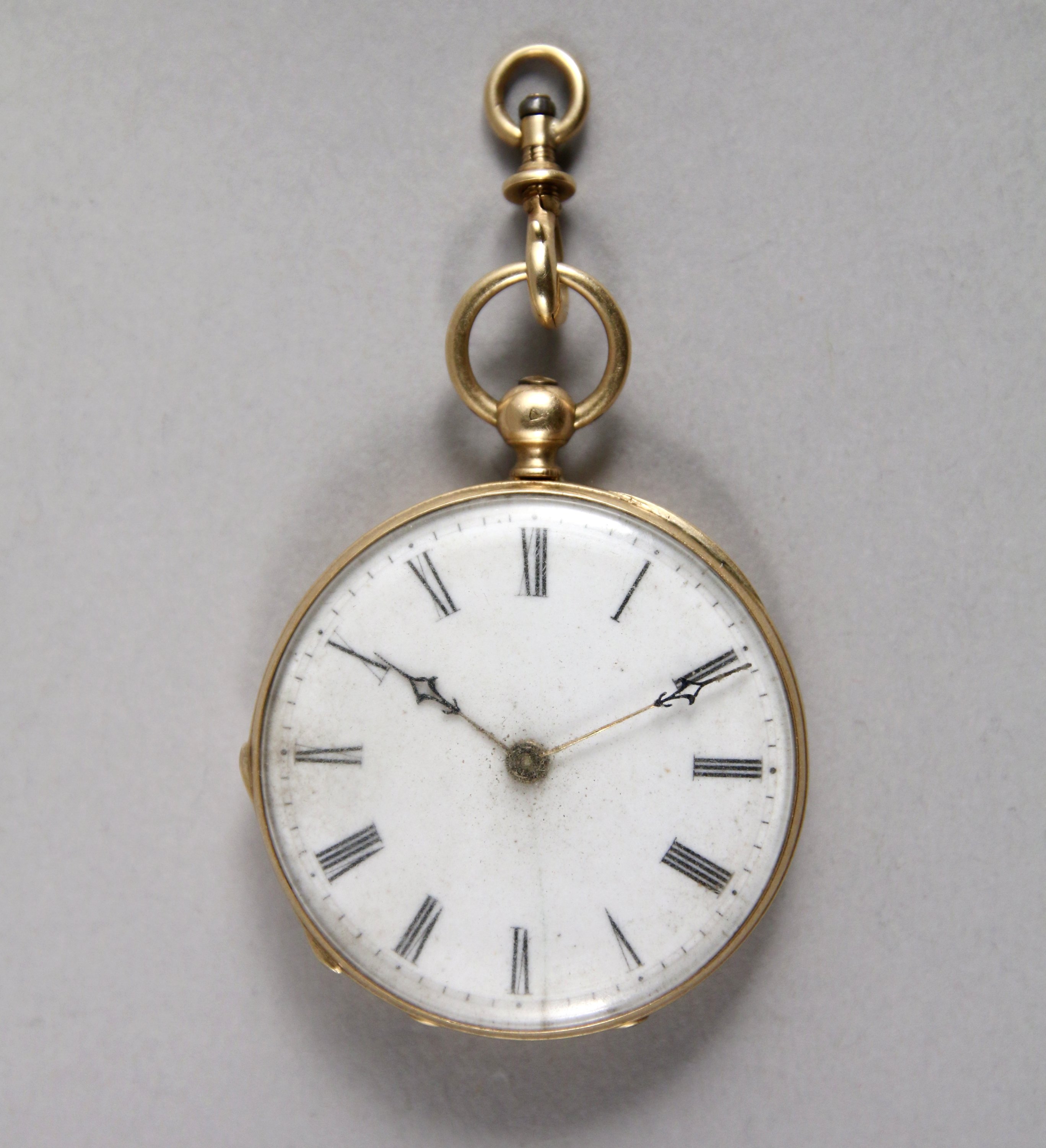 MONTRE de POCHE à clef en or jaune. Le cadran circulaire émaillé blanc figure les heures en chiffres romains autour d'un chemin de fer. Gravé au dos d'un cartouche laissé nu.