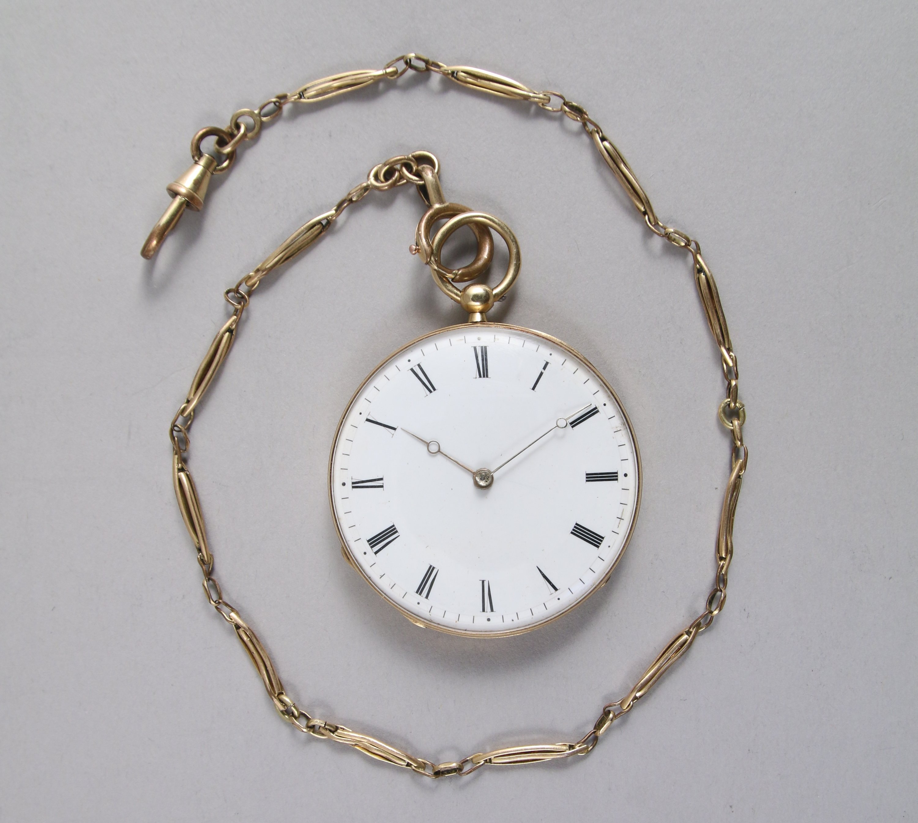 Avec une chaine en métal doré, manque la clef permettant de régler l'heure.