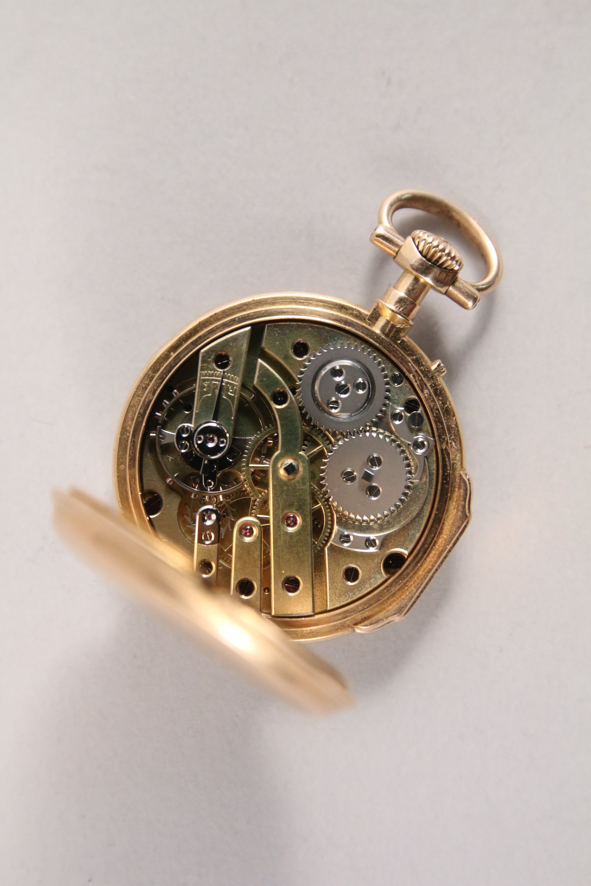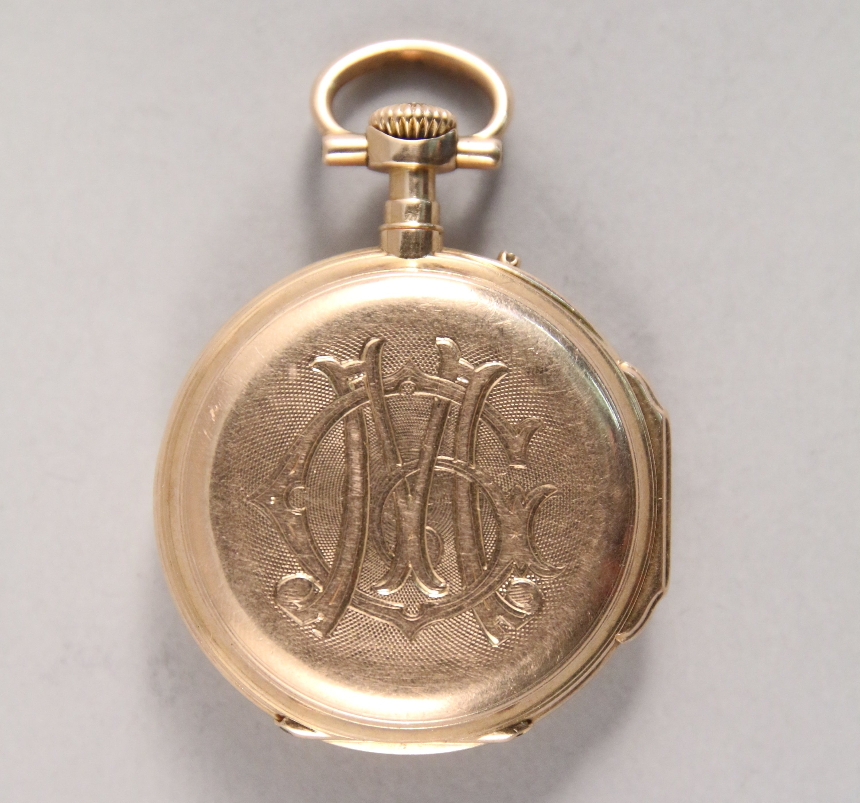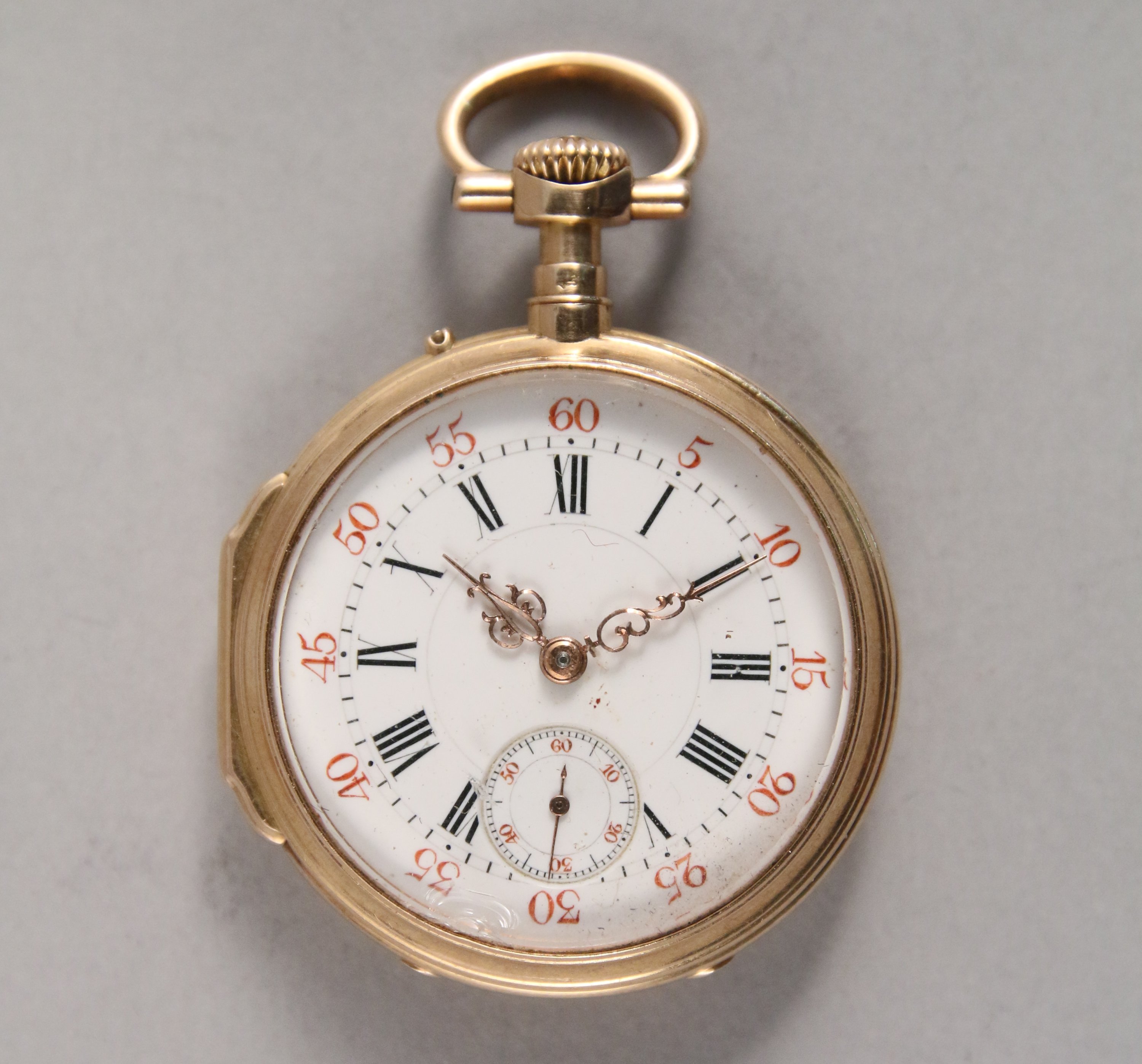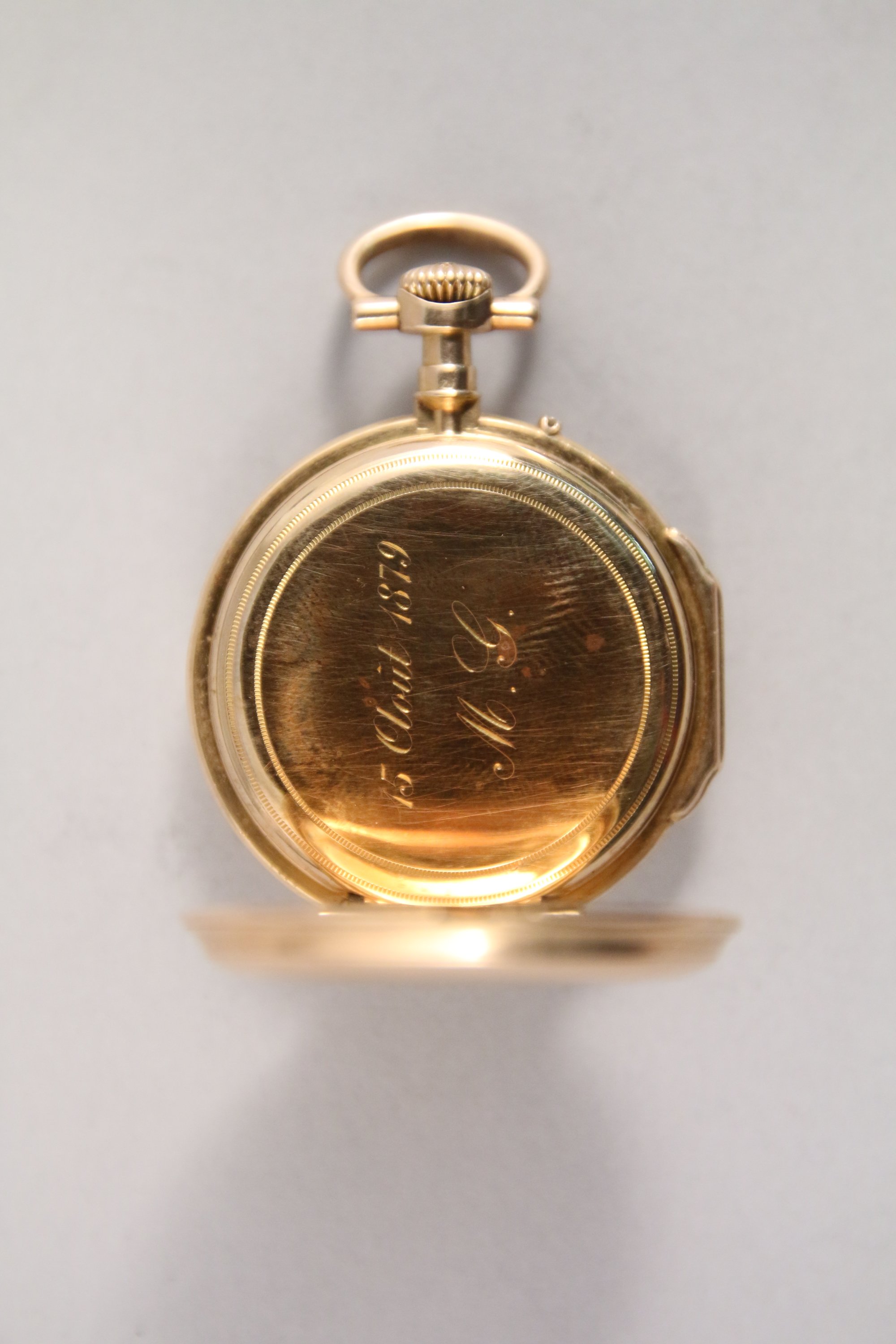 MONTRE de GOUSSET en or jaune 750 milièmes, à double cadrans émaillés, le petit gradué à 6 heures avec la trotteuse des secondes , le grand gradué pour les minutes, les heures en chiffres romains et chaque période de 5 minutes en chiffres arabes rouge. La cuvette monogrammée GM. Cache poussière en or gravé "15 Août1879 / M.G".