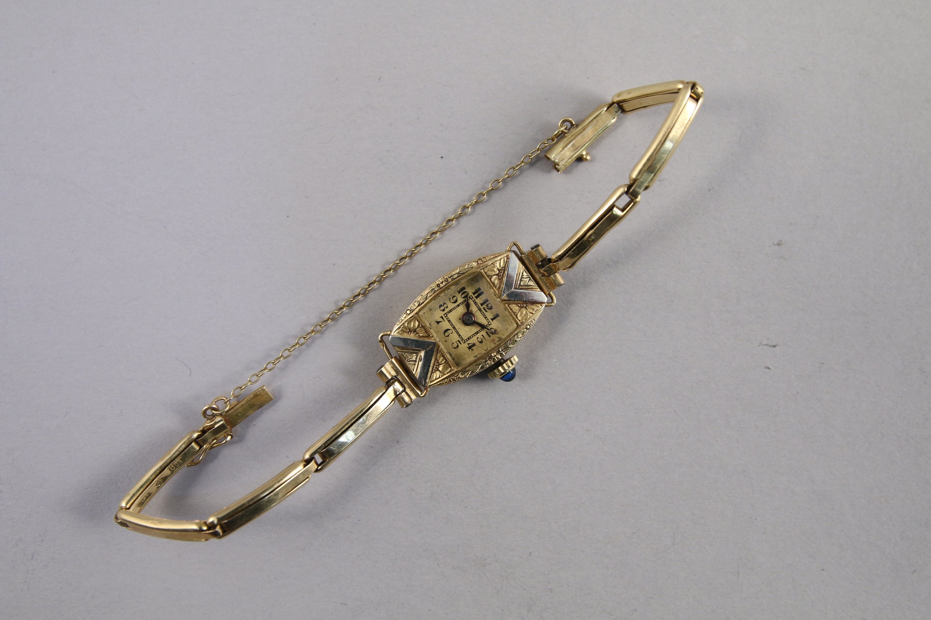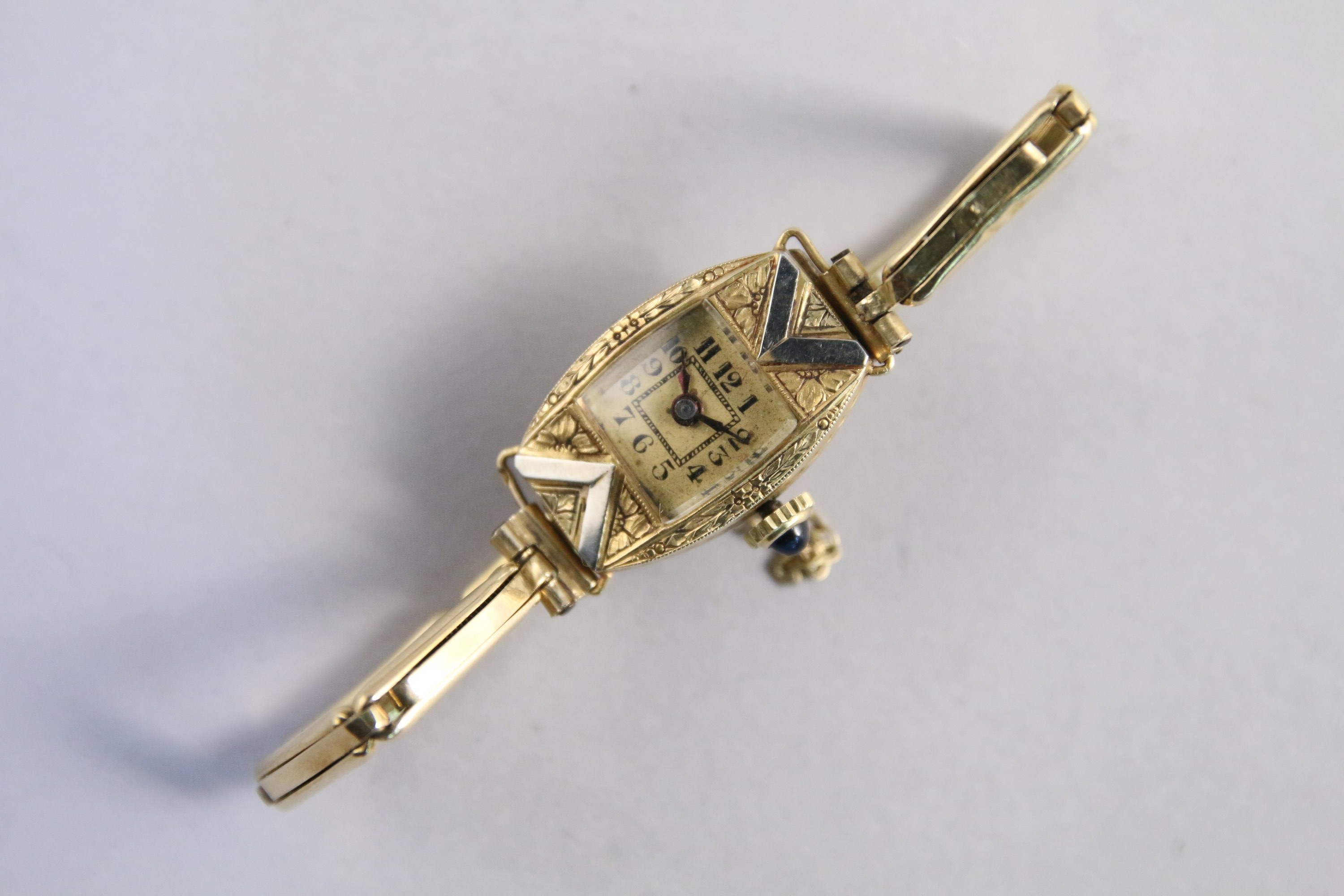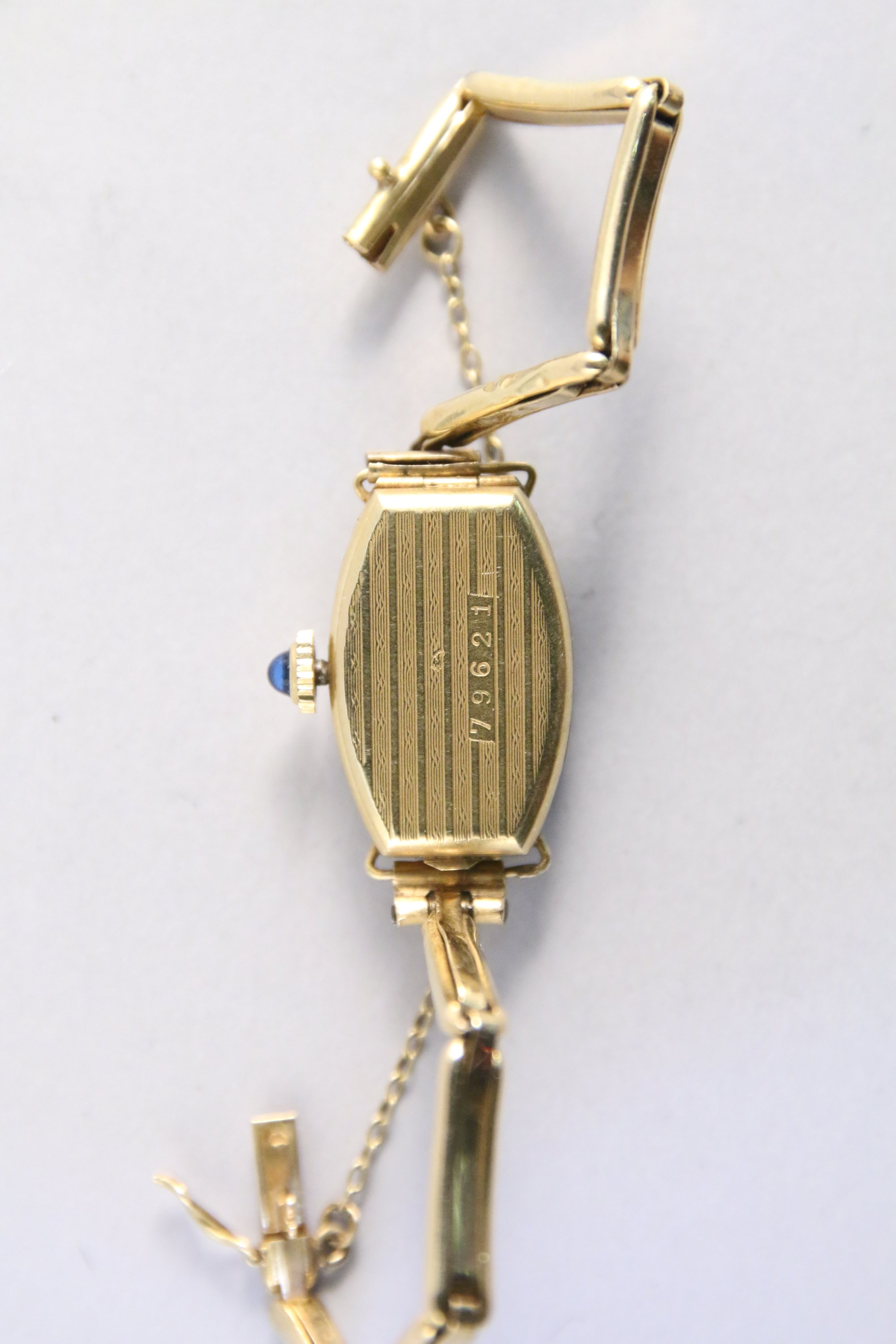 Petite MONTRE BRACELET de DAME en or jaune 750 millièmes. Le boitier de forme rectangulaire, remontoir à trois heures orné d'une pierre bleue (saphir ?), le cadran avec les heures en chiffre arabes. État de marche.