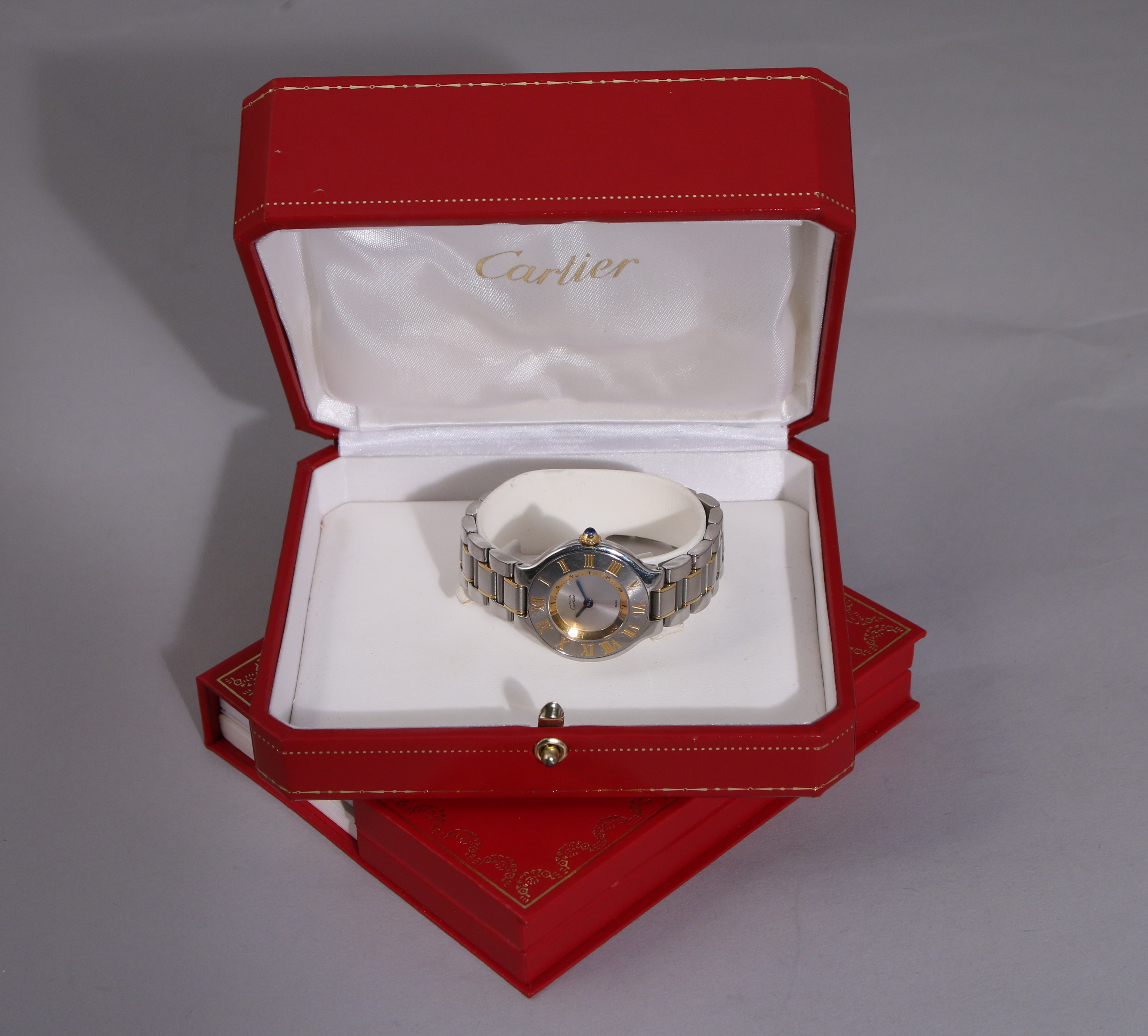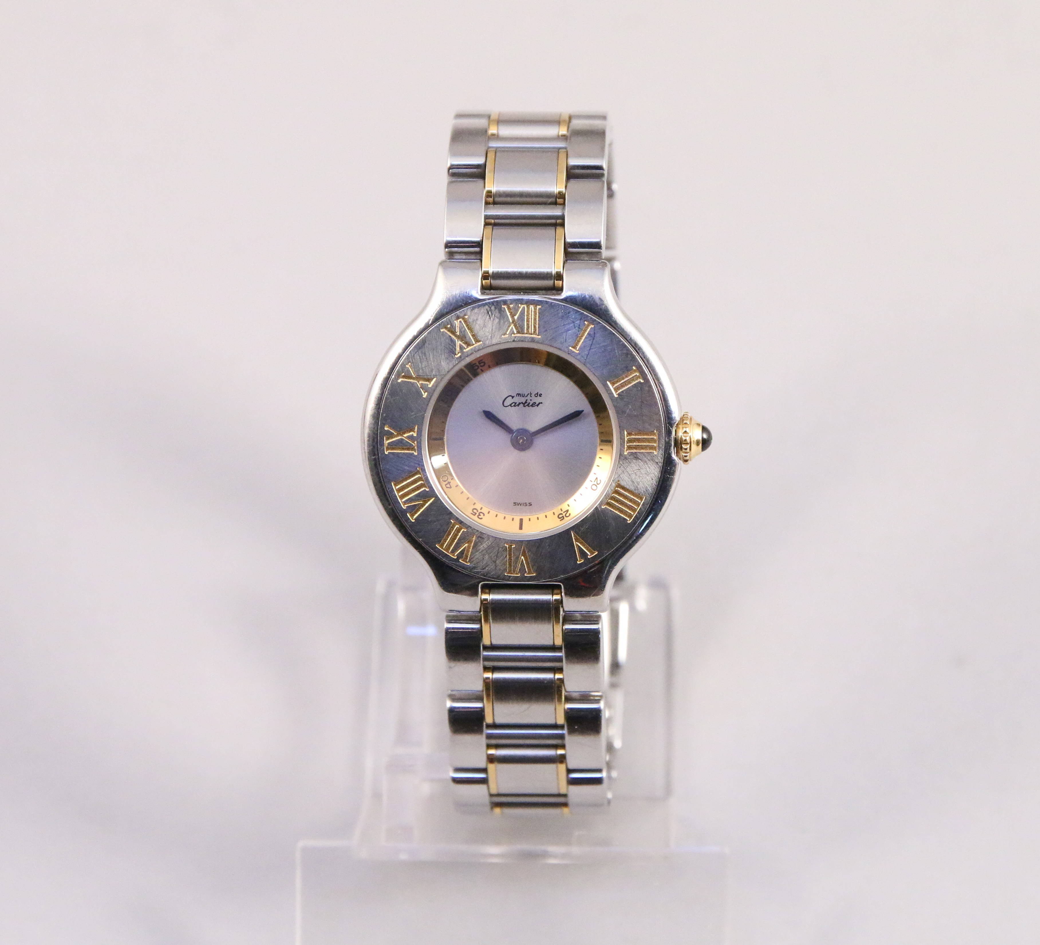 CARTIER. MONTRE BRACELET de DAME en acier, la lunette gravée des heures en chiffres romains, le cadran siglé le "must de Cartier". Bracelet en acier à boucle ardillon. Mouvement à quartz.