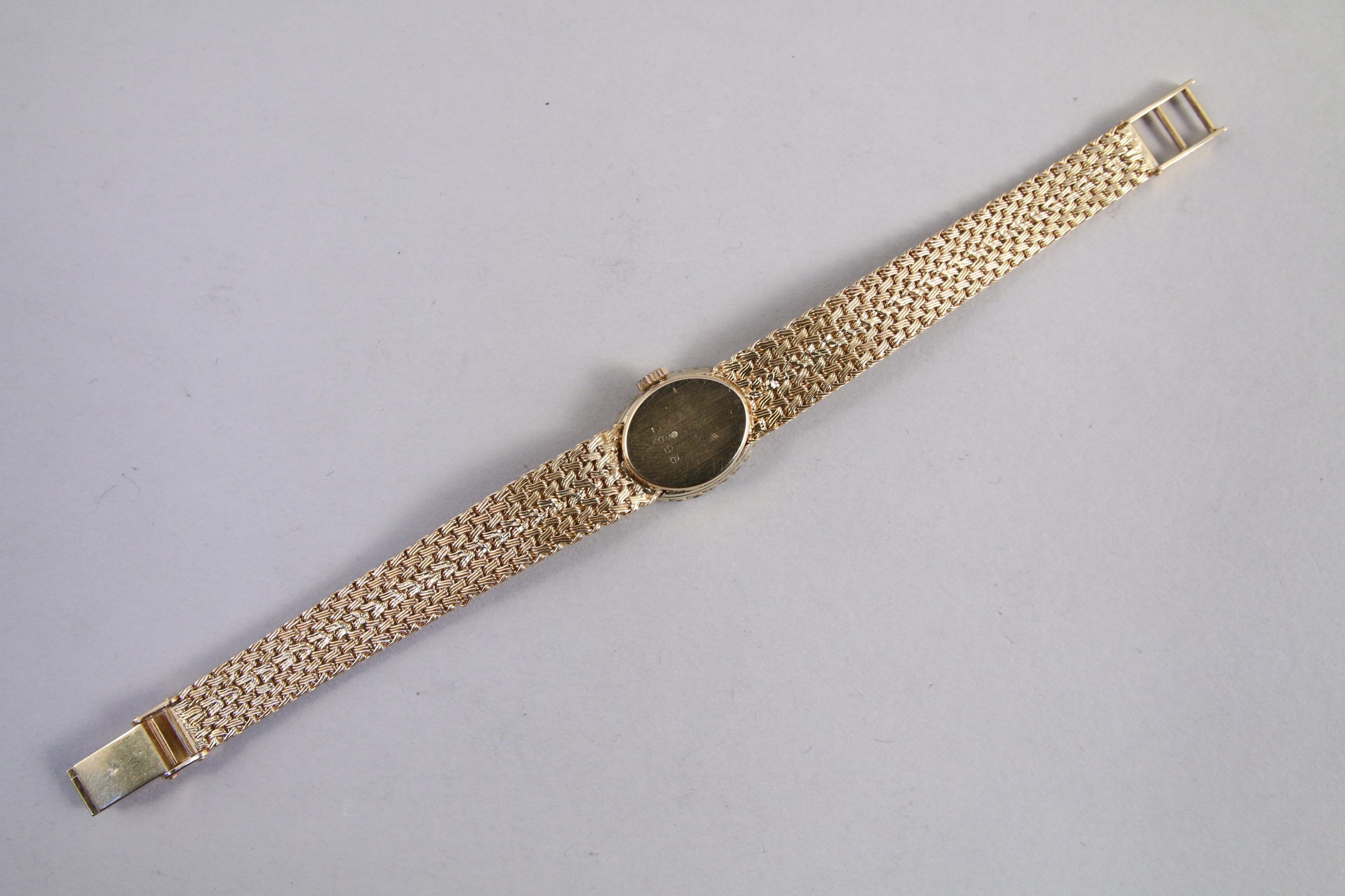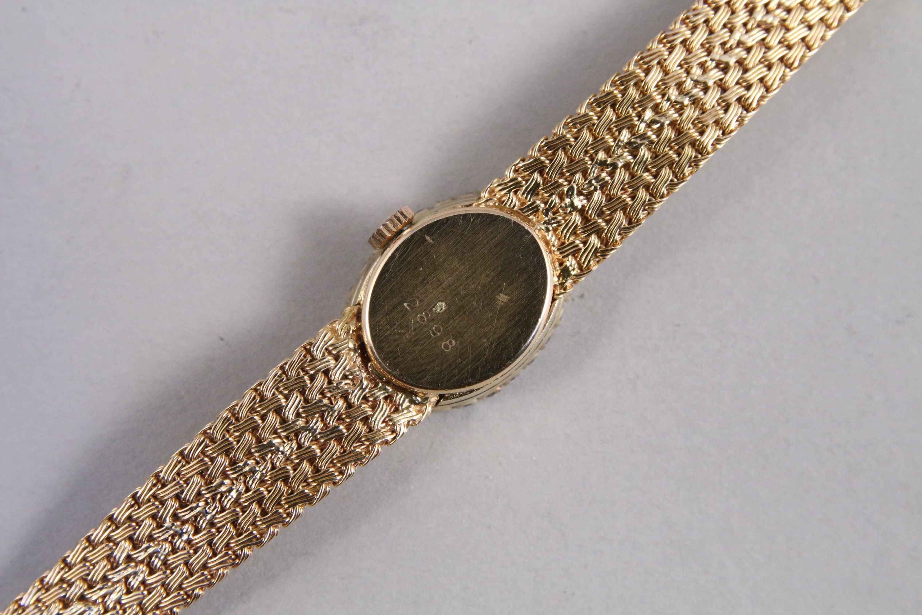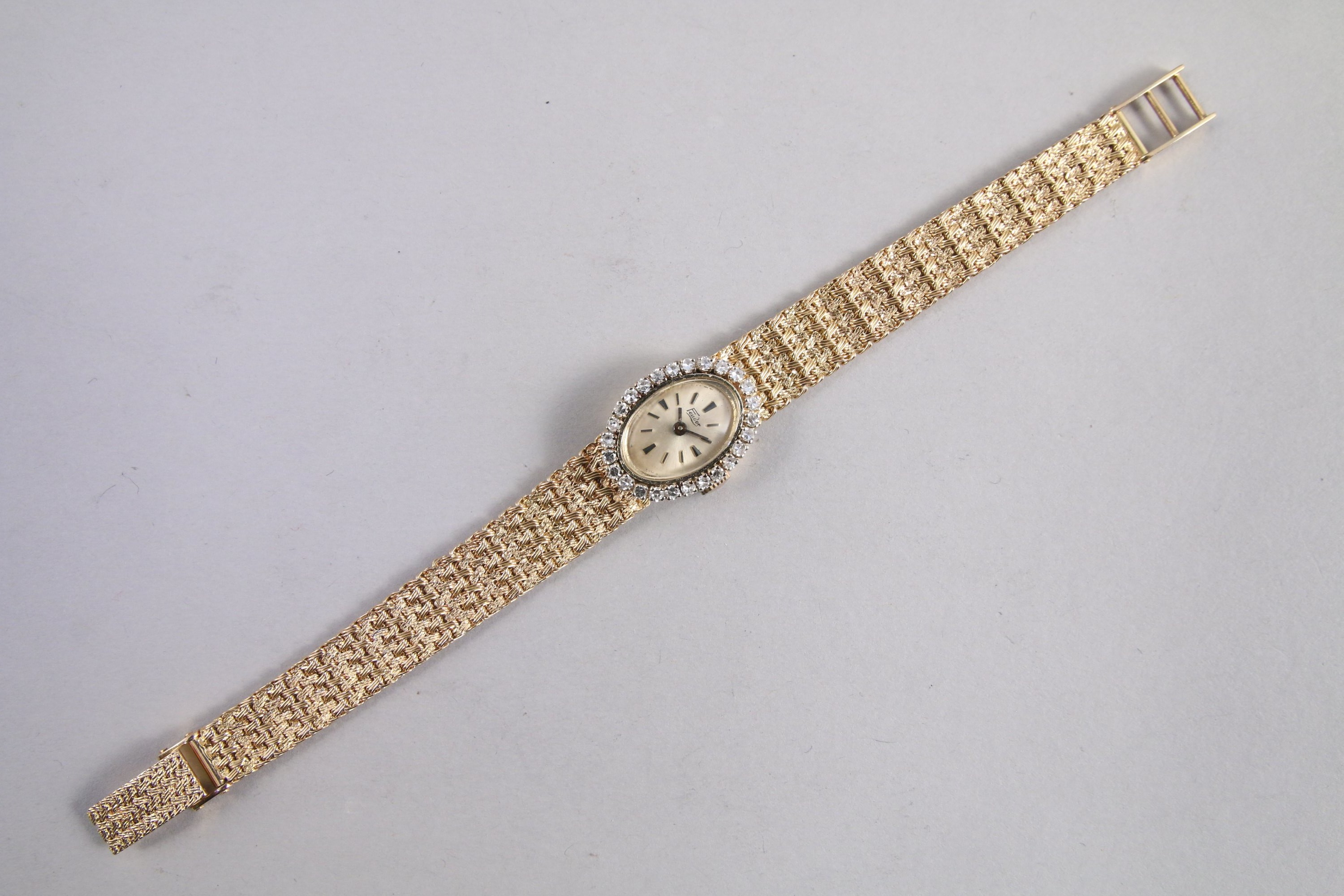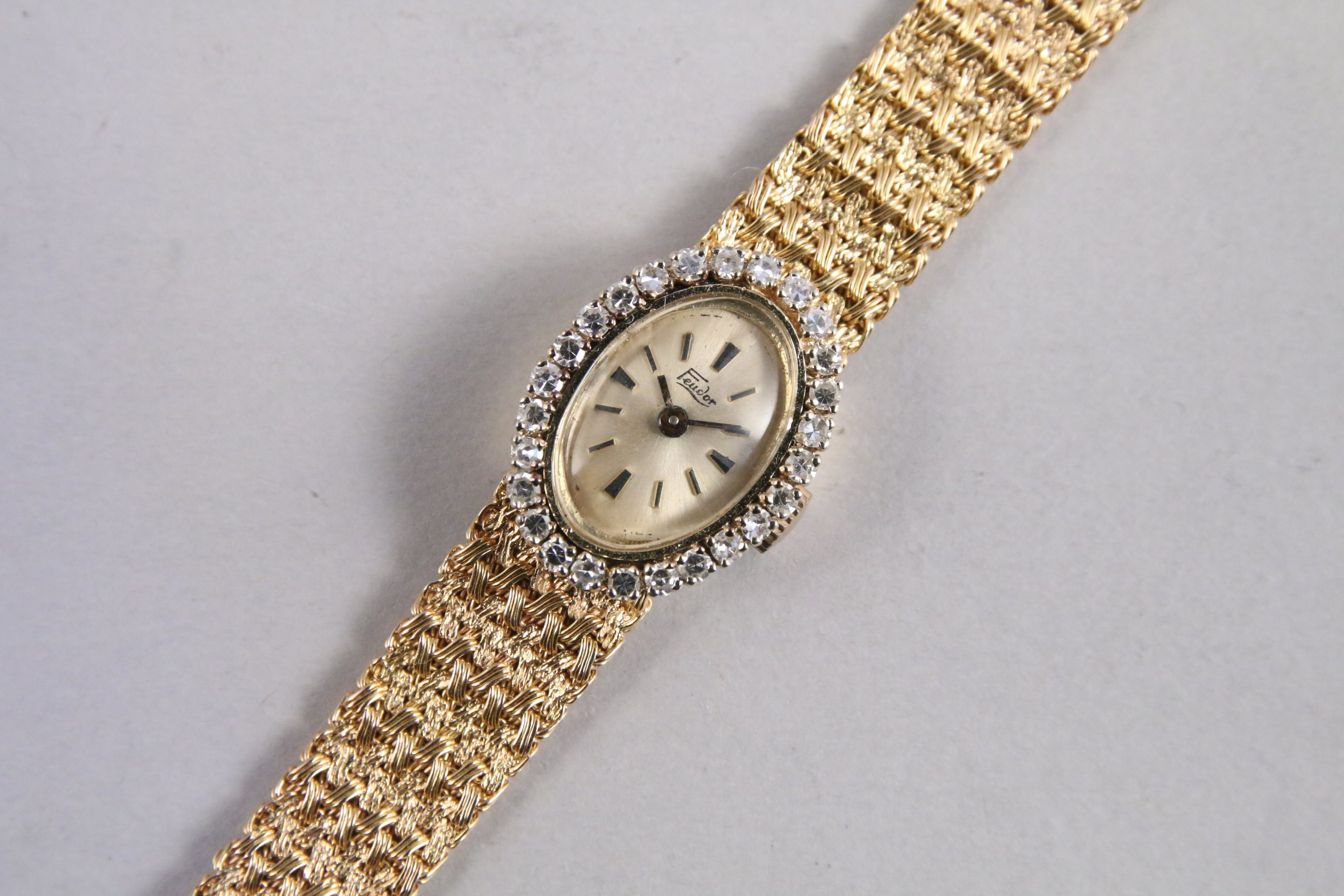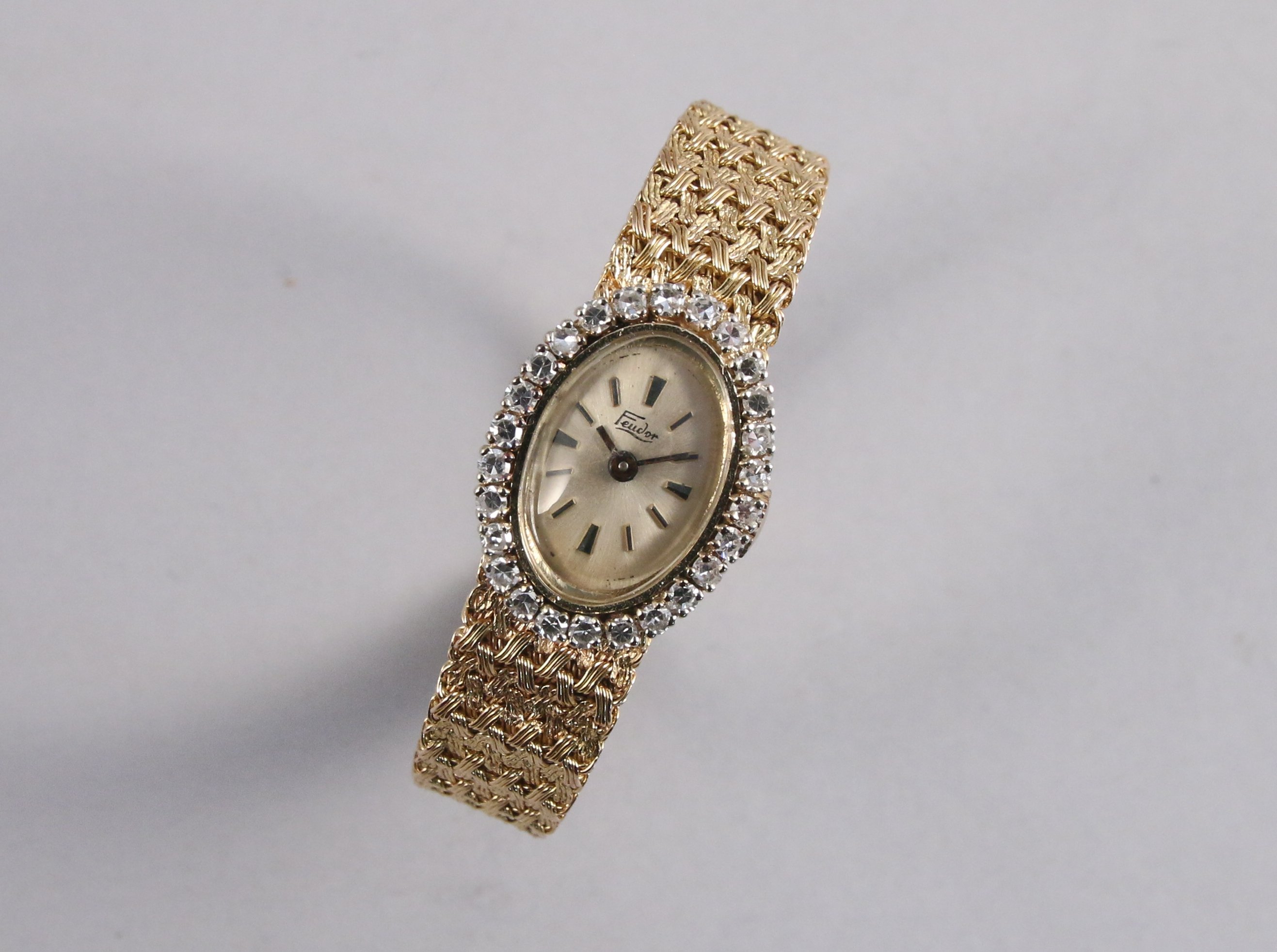 FEUDOR. MONTRE BRACELET de DAME en or jaune 750 milièmes. le cadran de forme ovale gradué pour le sheures. la lunette ornée de 26 DIAMANTS. Remontoir à trois heures. Mouvement changé pour un mouvemnt à Quartz. Le bracelen en or jaune 750 milièmes en mailles souple tressées.