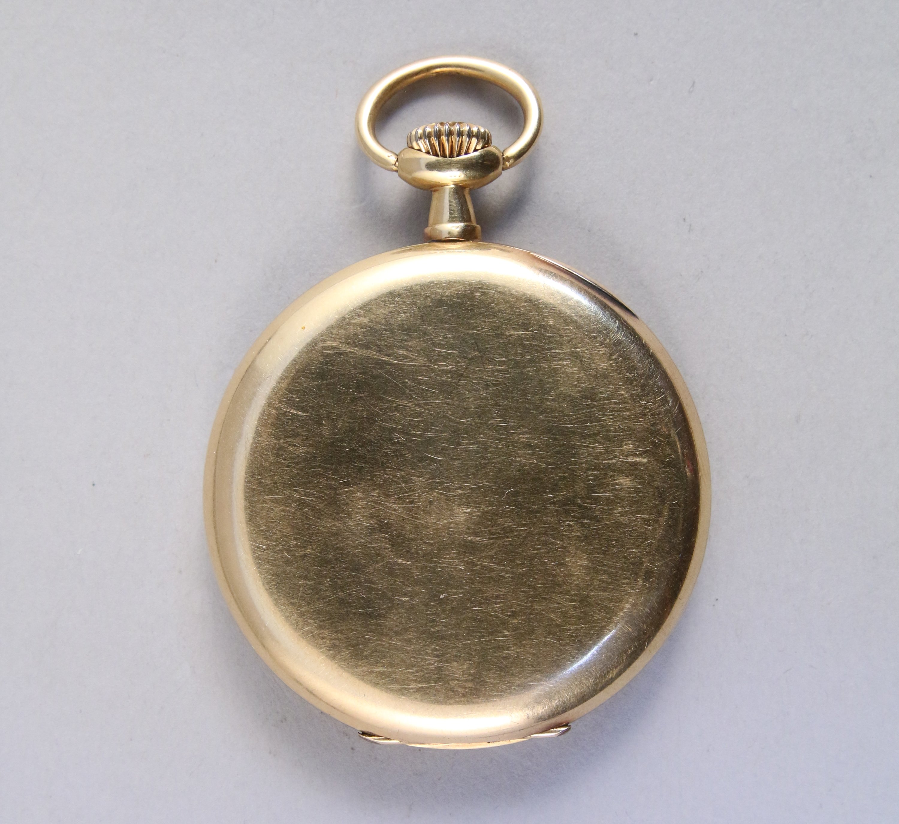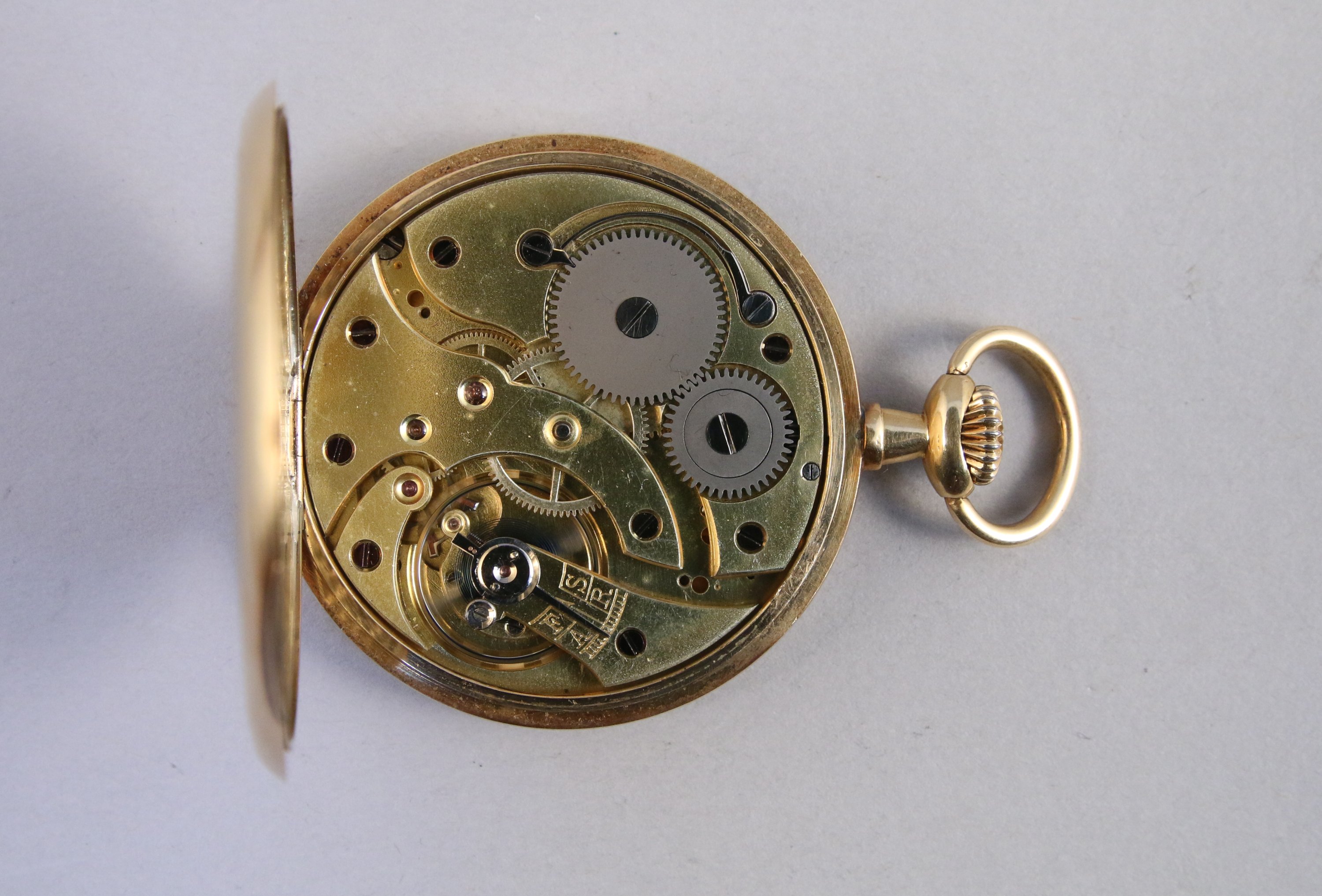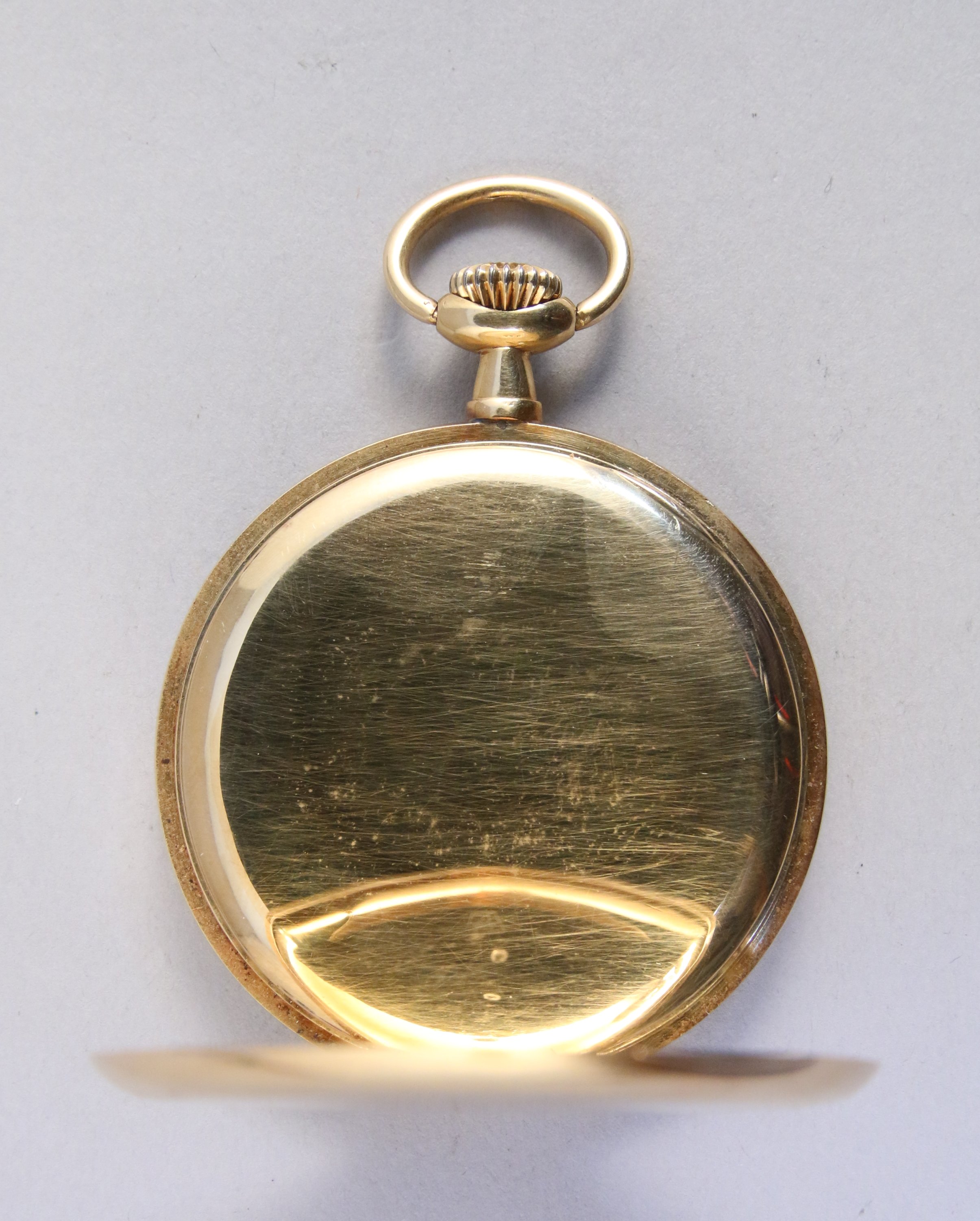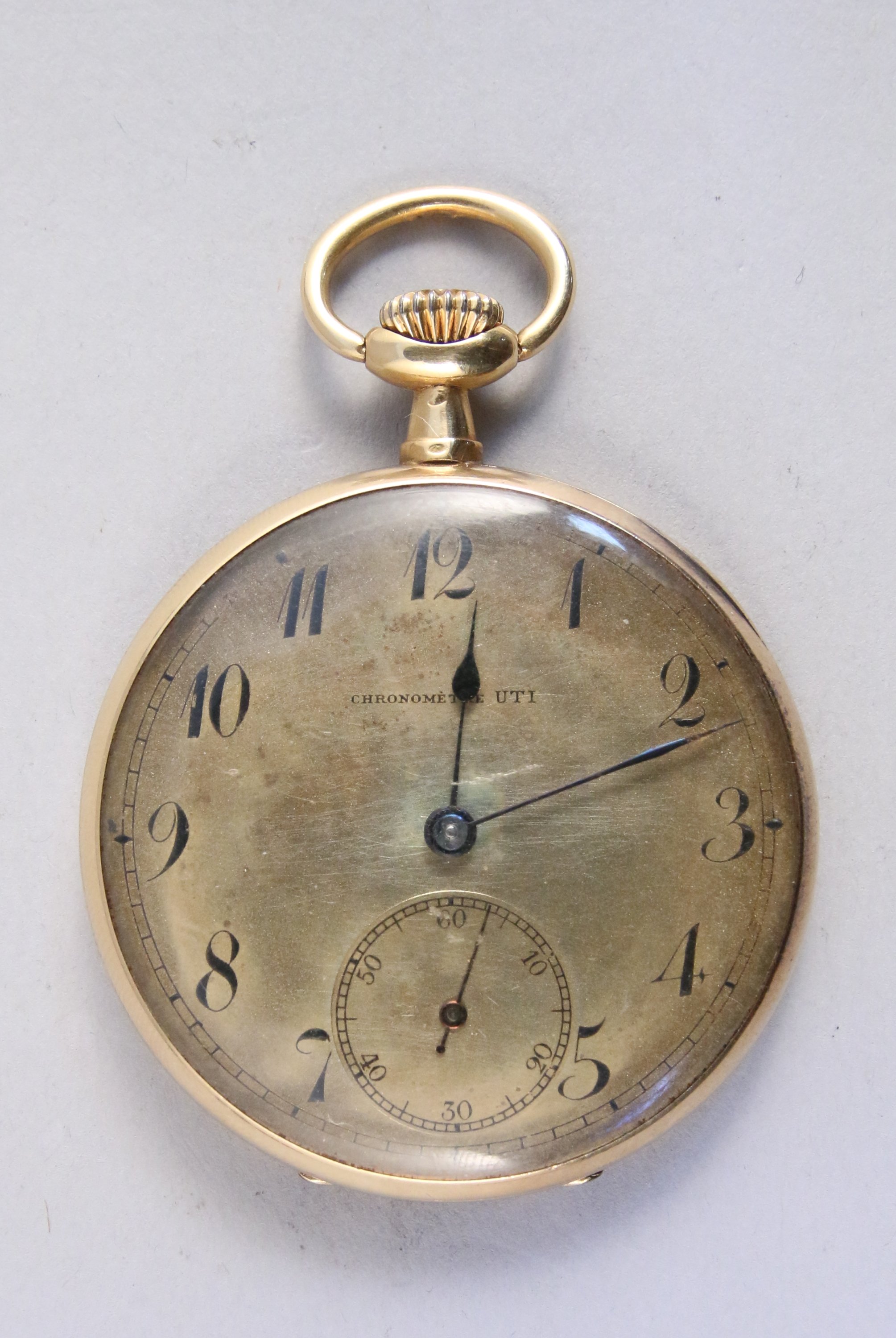 MONTRE de GOUSSET en or jaune 750 milièmes. Le cadran gradué pour les minutes avec les heures en chiffres arabes. Trotteuse des secondes à 6 heures. Béliraire et remontoire à 12 heures. Cache poussière en or. Le boitier uni. cadran signé Chronomètre UTI.