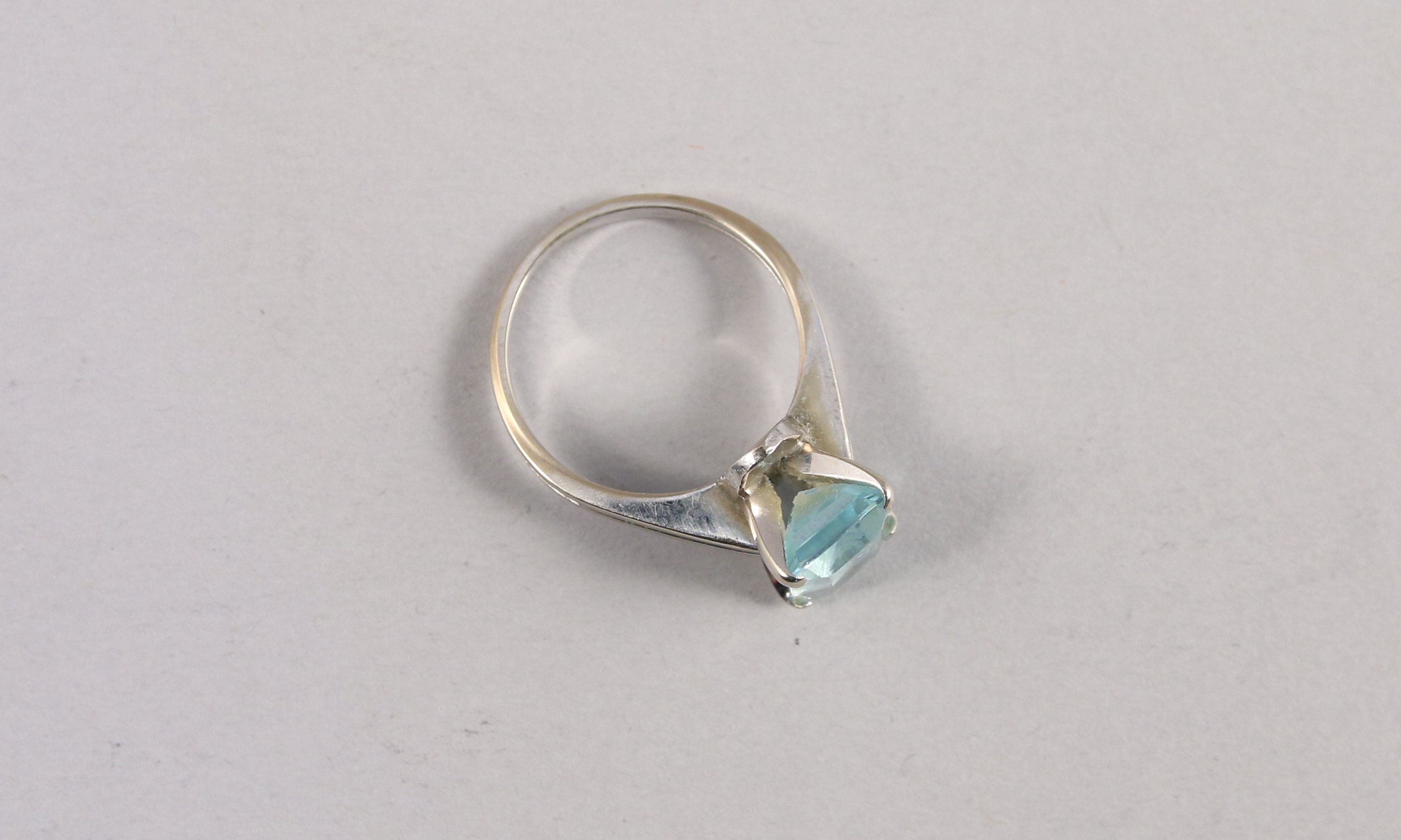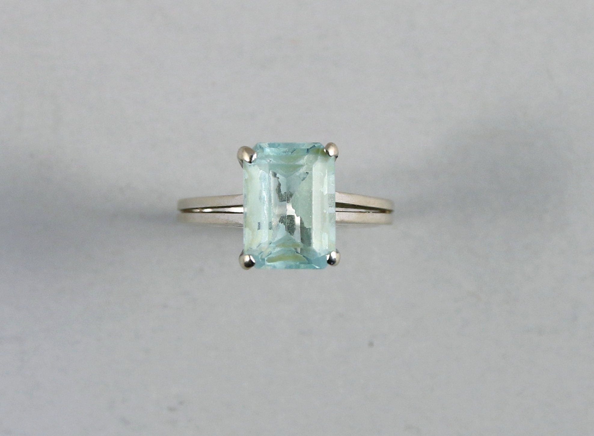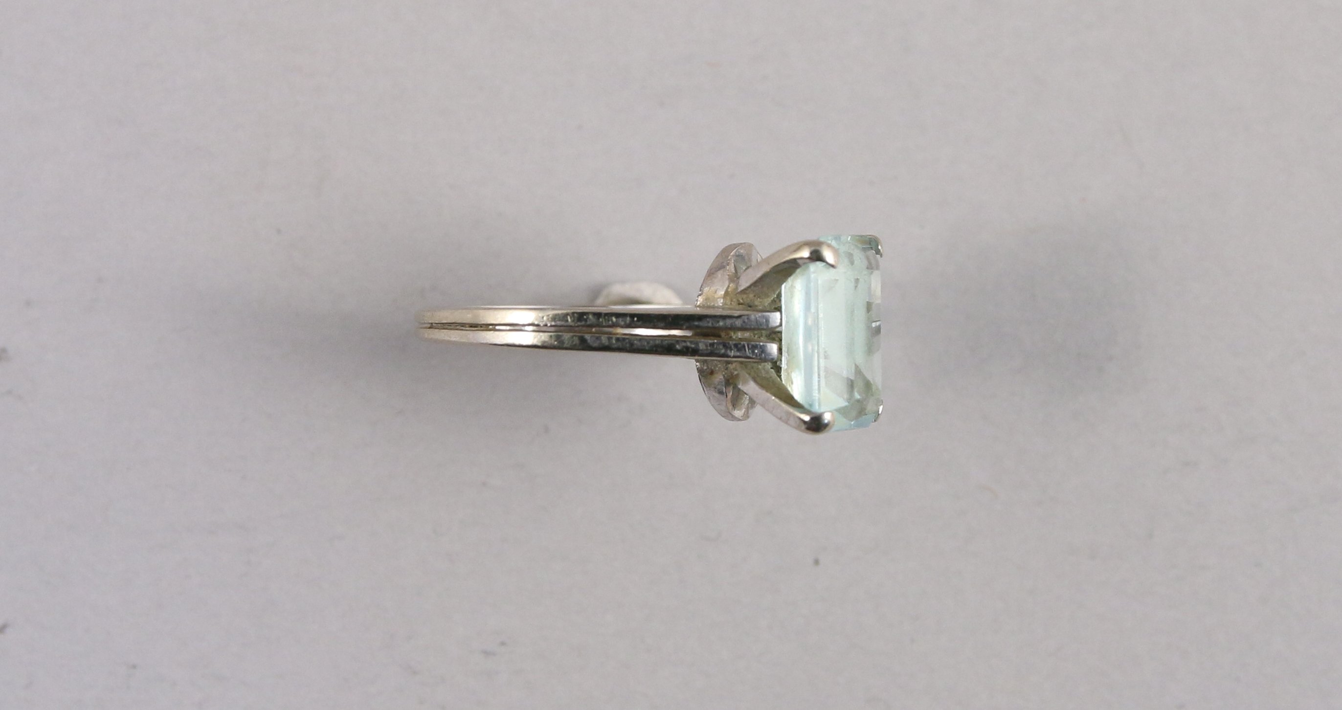 BAGUE en or blanc 750 milièmes ou platine orné d'une AIGUE MARINE de taille baguette.