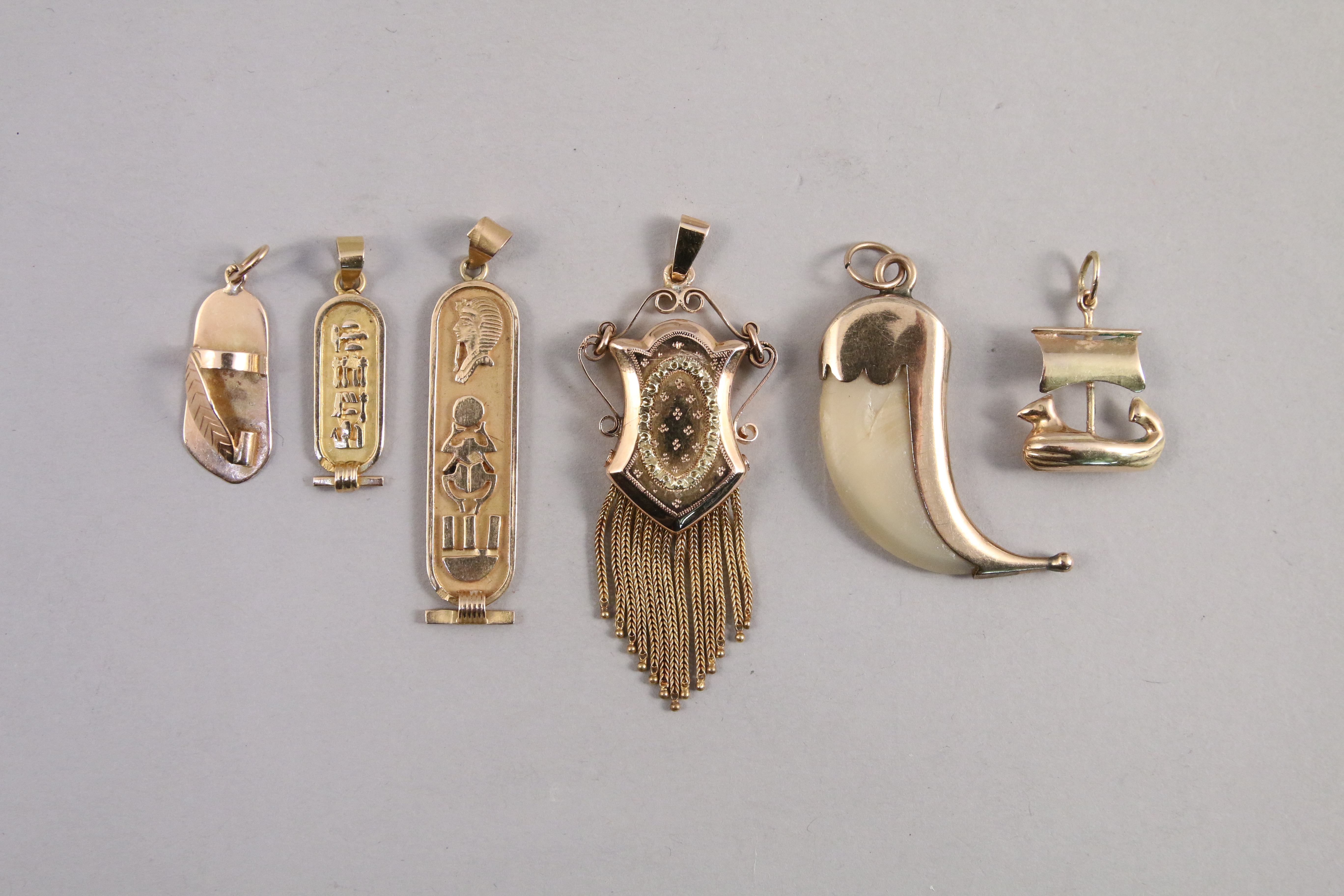 - quatre pendentifs (deux cartouches, un médaillon, une sandale) en or 750 millièmes (poids brut : 13,8 g)