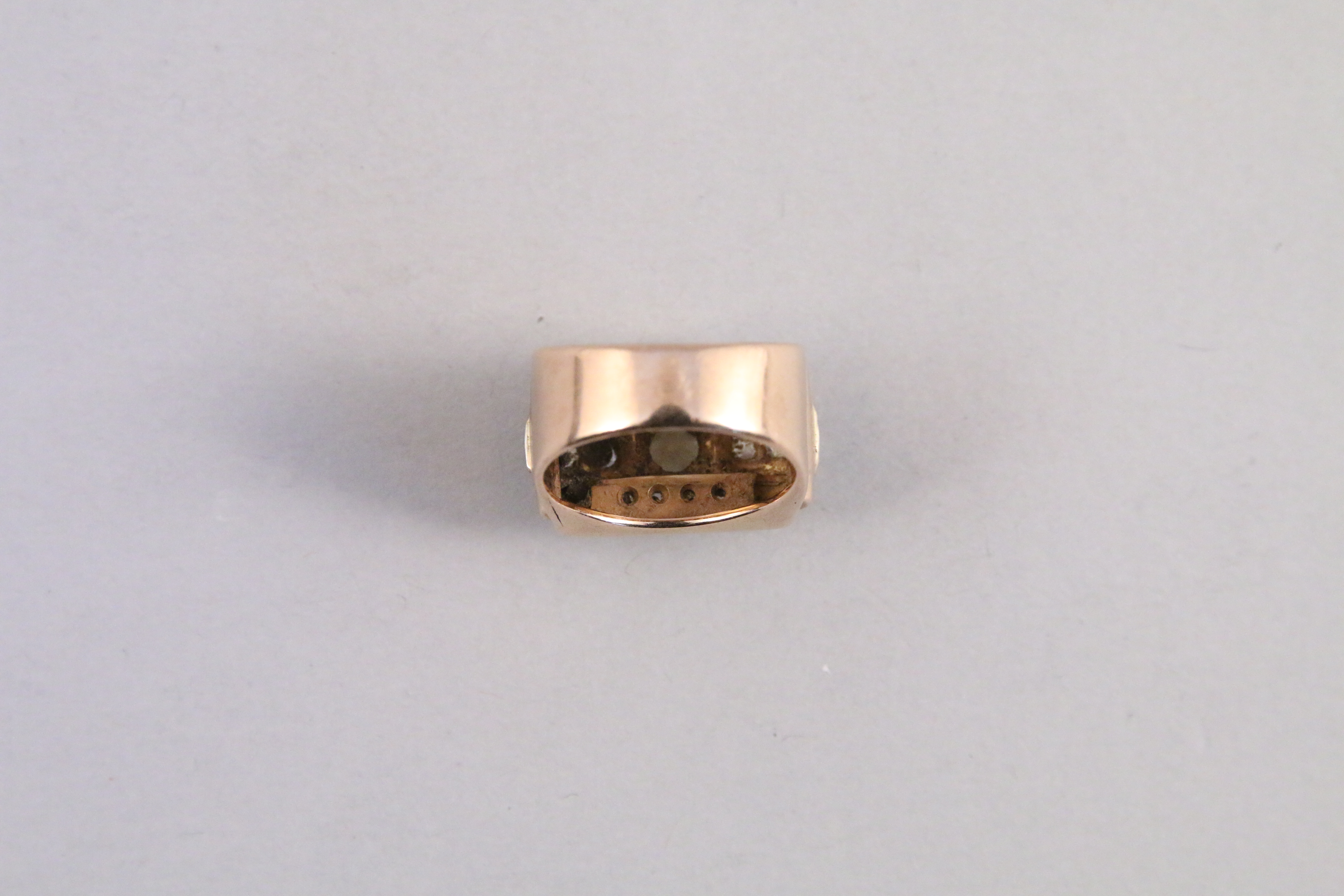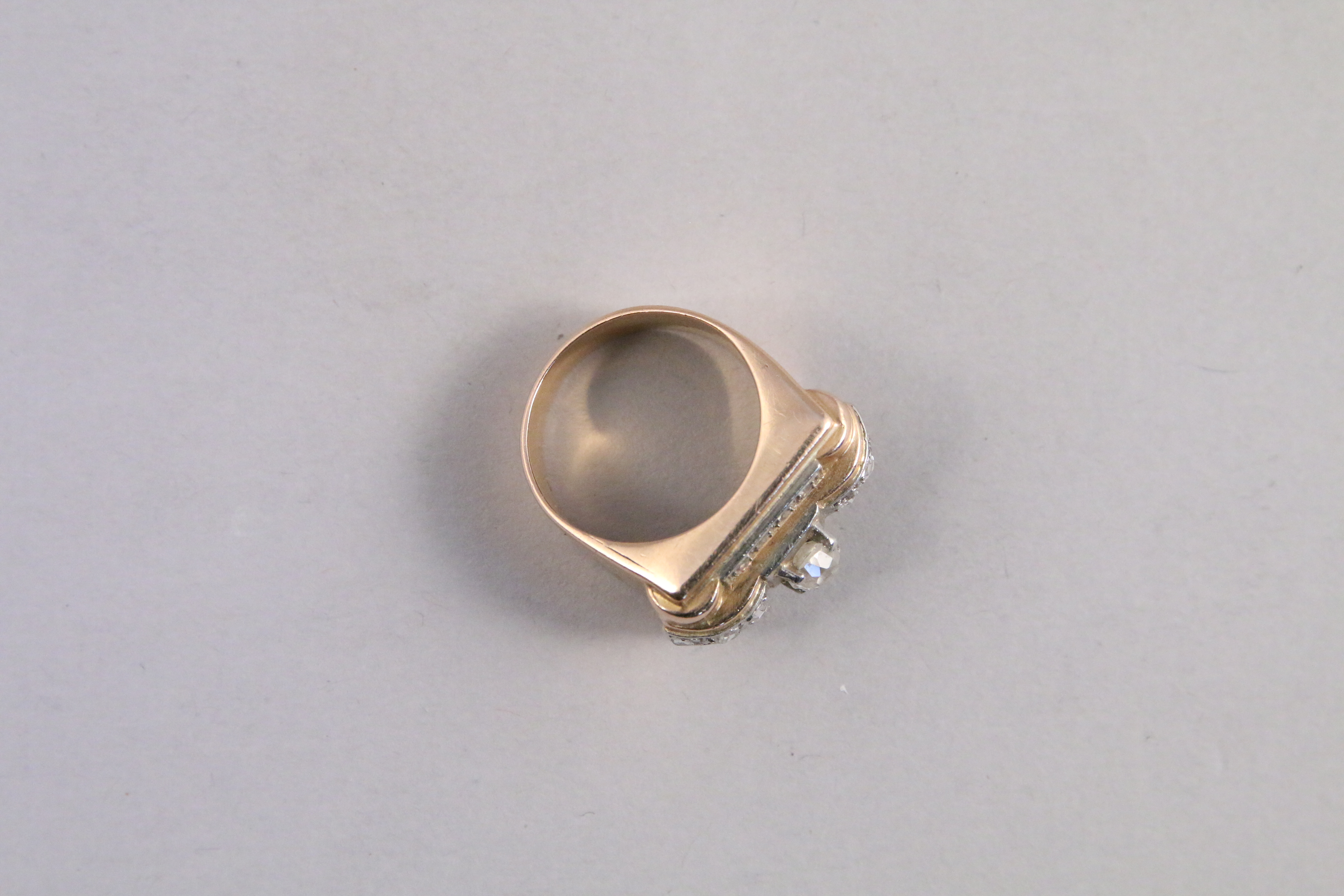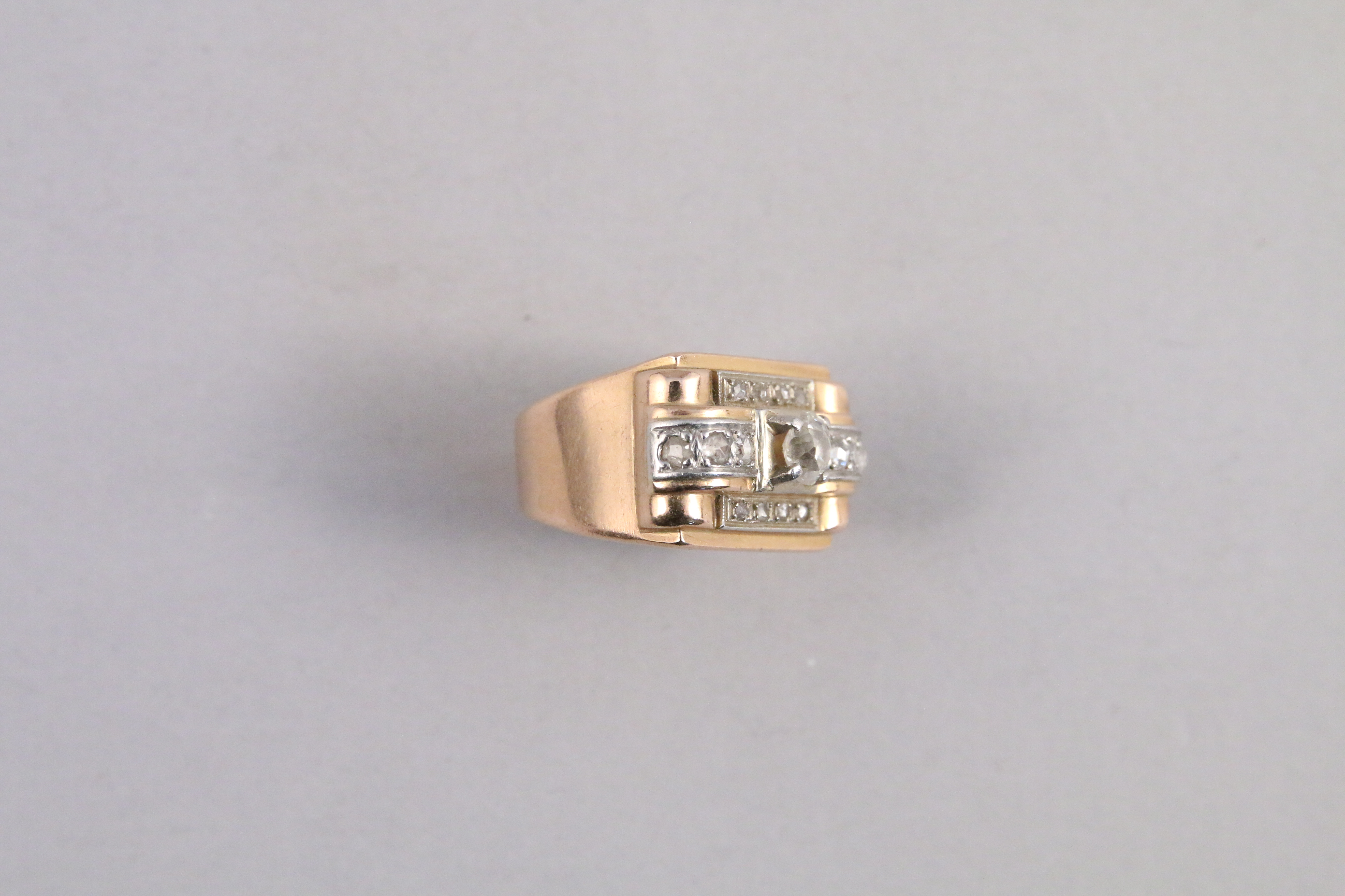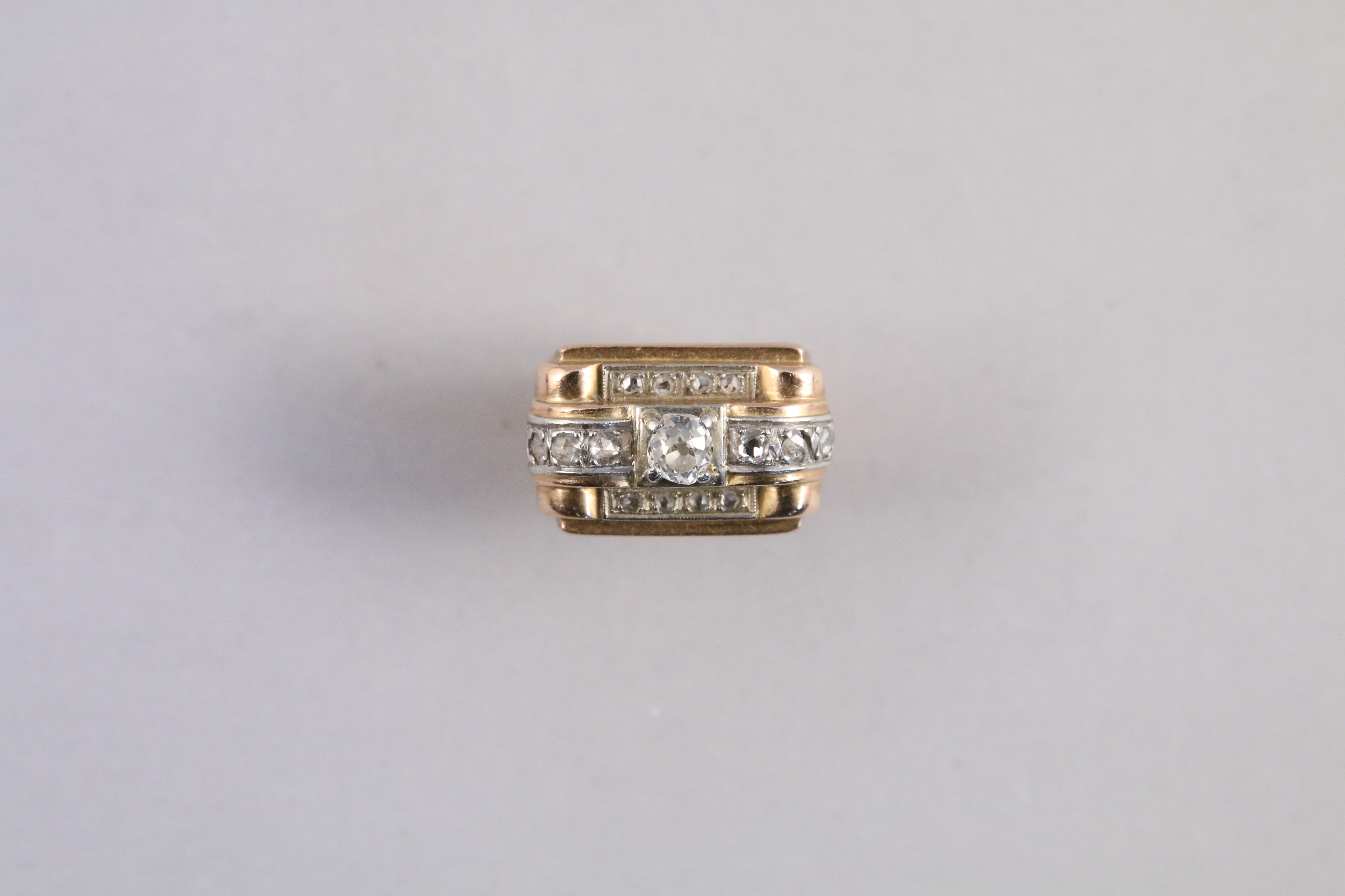 Bague en or jaune 750 millièmes et platine 850 millièmes, de forme géométrique, ornée de diamants taillés en rose, celui du centre plus important de forme coussin et de taille ancienne.