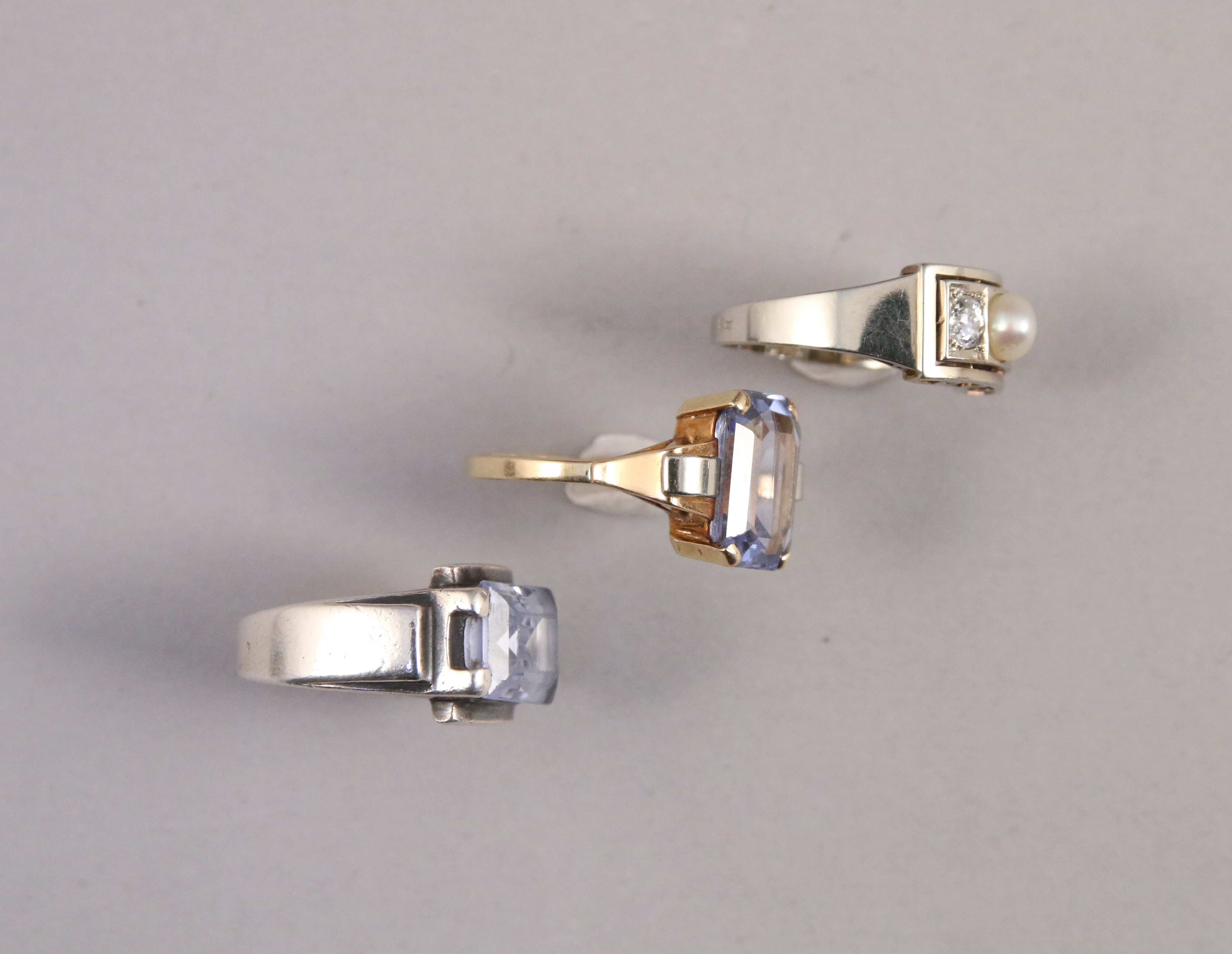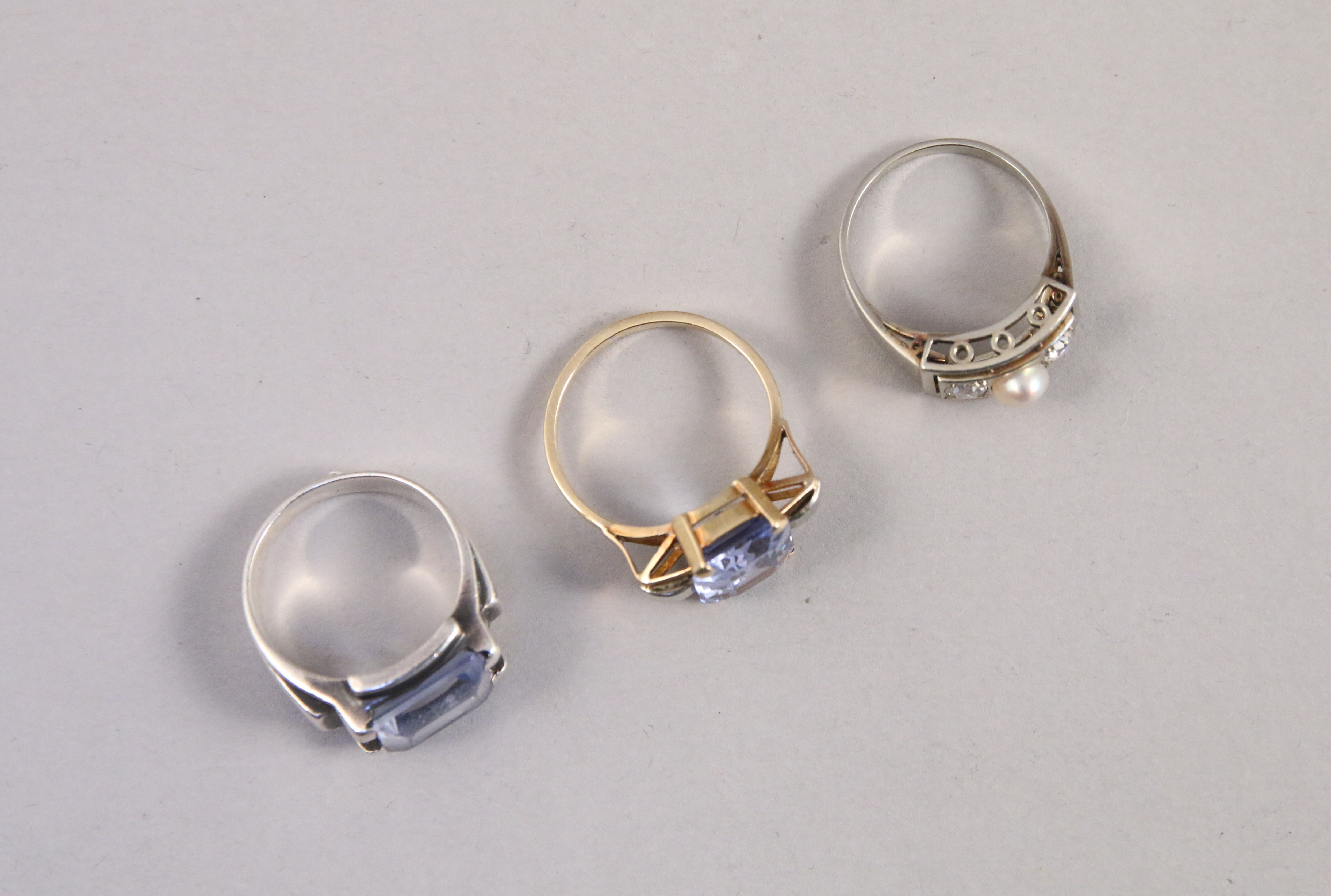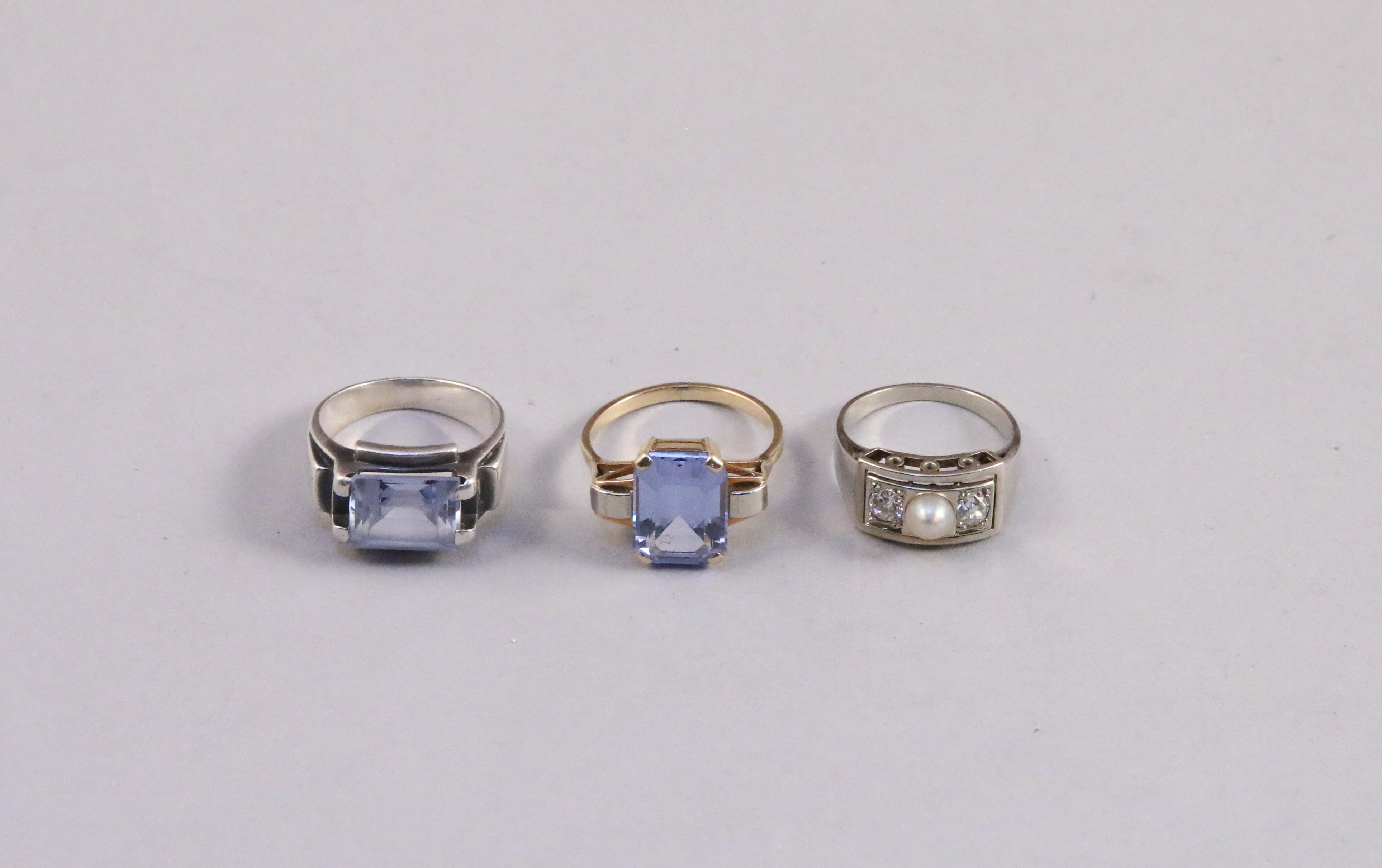 TROIS BAGUES en or blanc et jaune 750 millièmes ou platine, deux ornées d'une AIGUE-MARINE et la troisième ornée d'une PERLE dans un entourage de deux DIAMANTS;