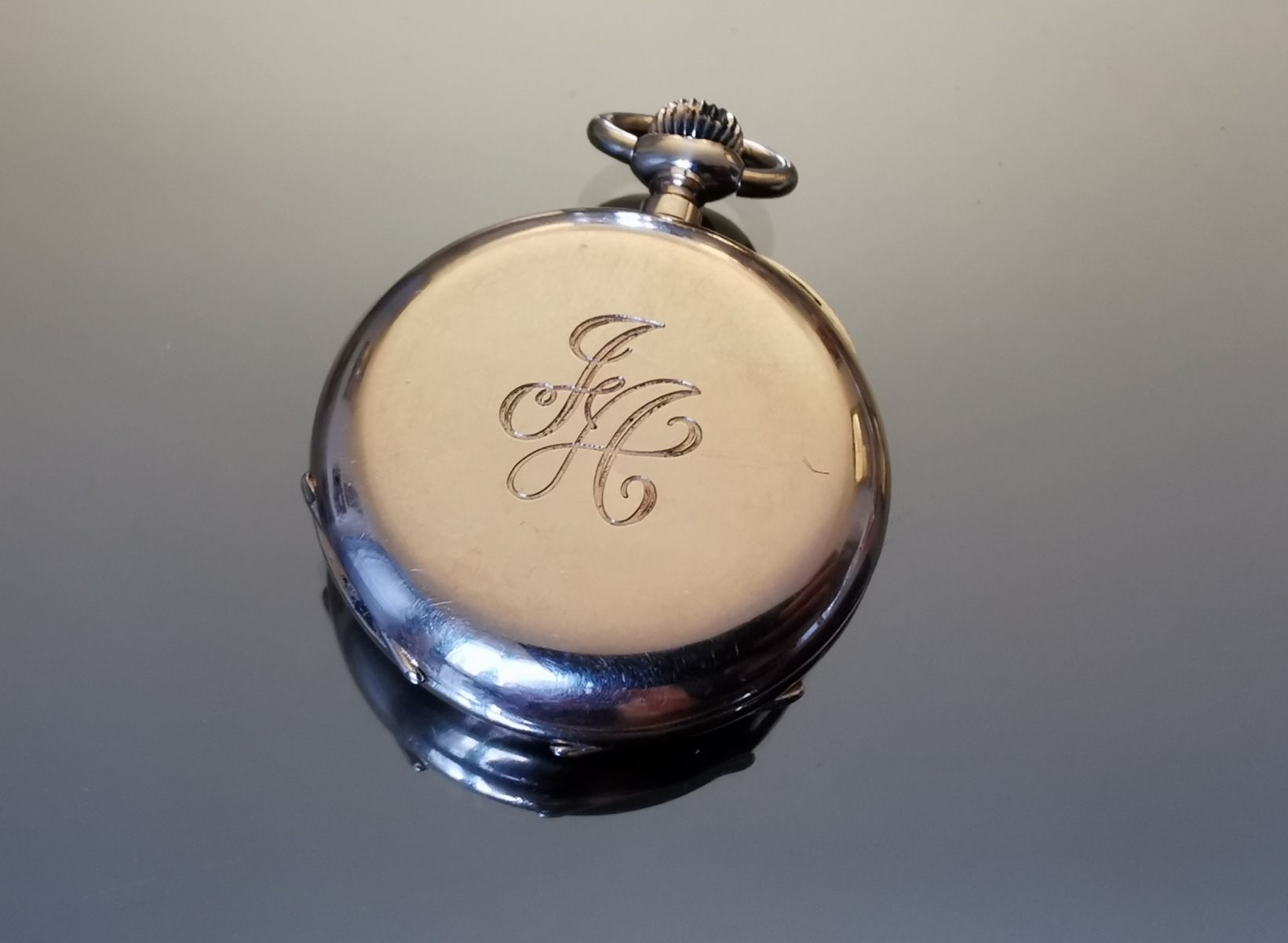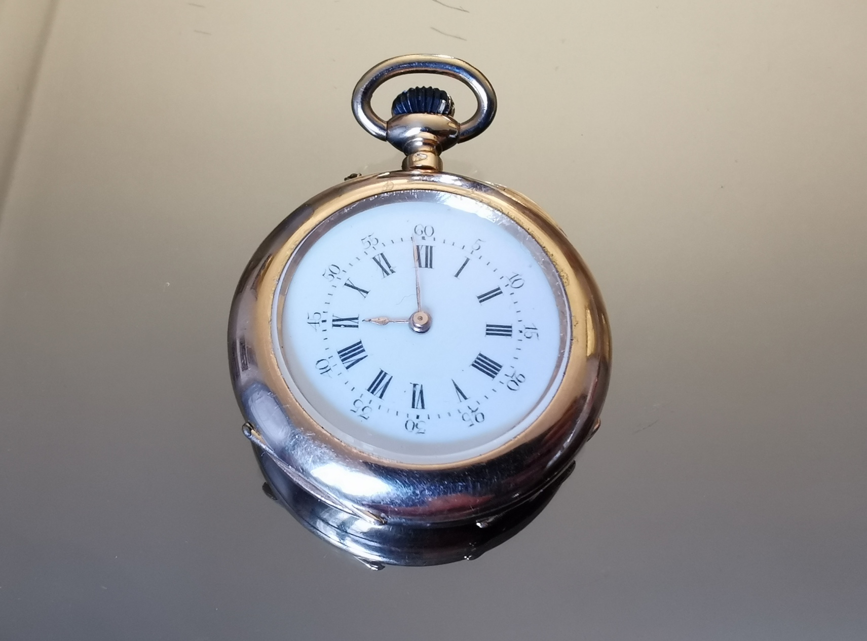 MONTRE de COL en or jaune 750 milièmes. Le boitiier lisse monogrammé JA. Cadran émaillé avec chemin de fer pour les minutes, les heures en chiffres arabes. Aiguilles en or. Béliaire et remontoir à midi. Cache poussière en or