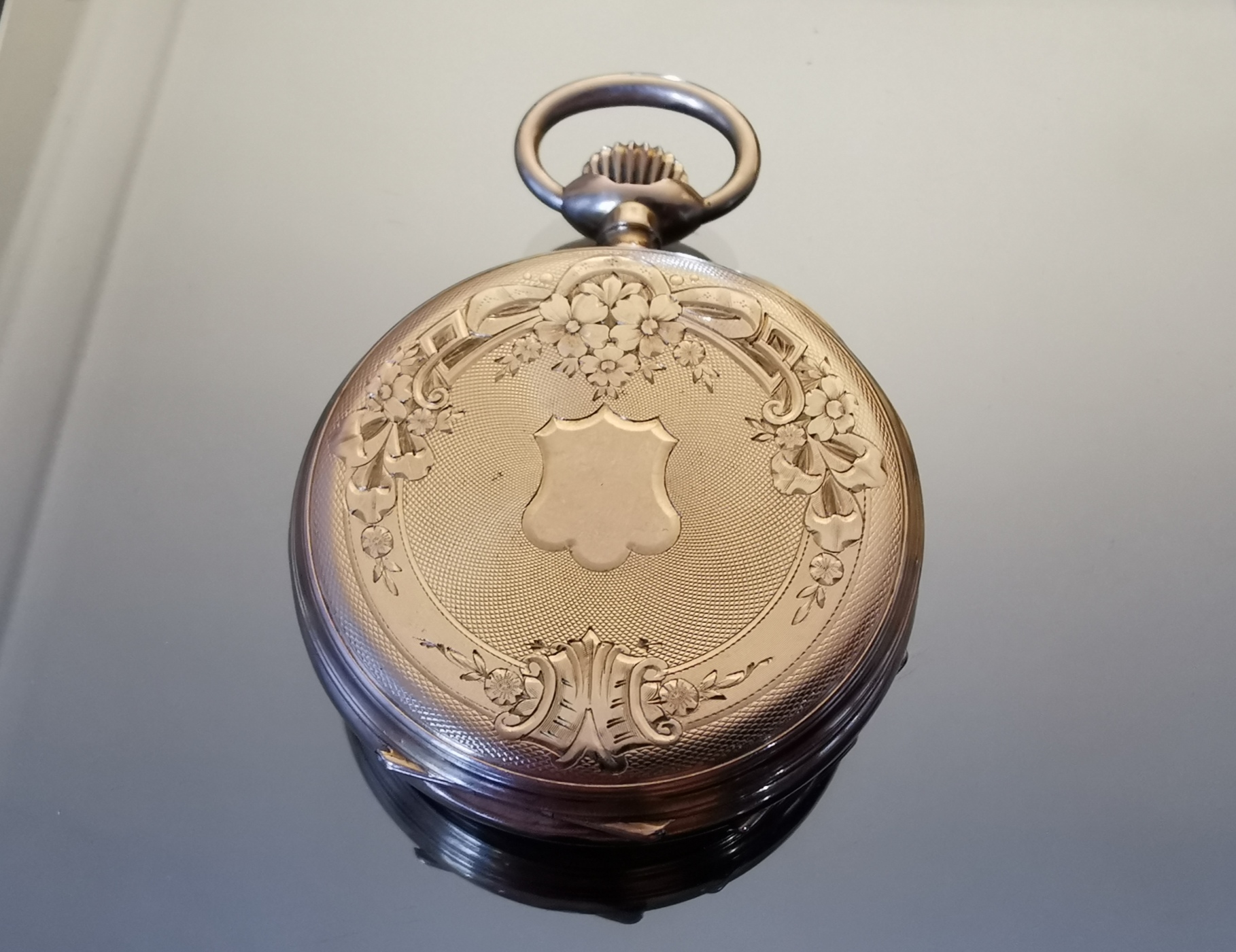 MONTRE de GOUSSET en or jaune 750 milièmes. Le boitier guilloché à décors de cuirs, de guirlandes et de rubans. Le cadran émaillé avec chemin de fer de sminutes, les heures en chiffres romains. Cadran des secondes à six heures. Bélière et remontoir à Midi. Cache-poussière en or.