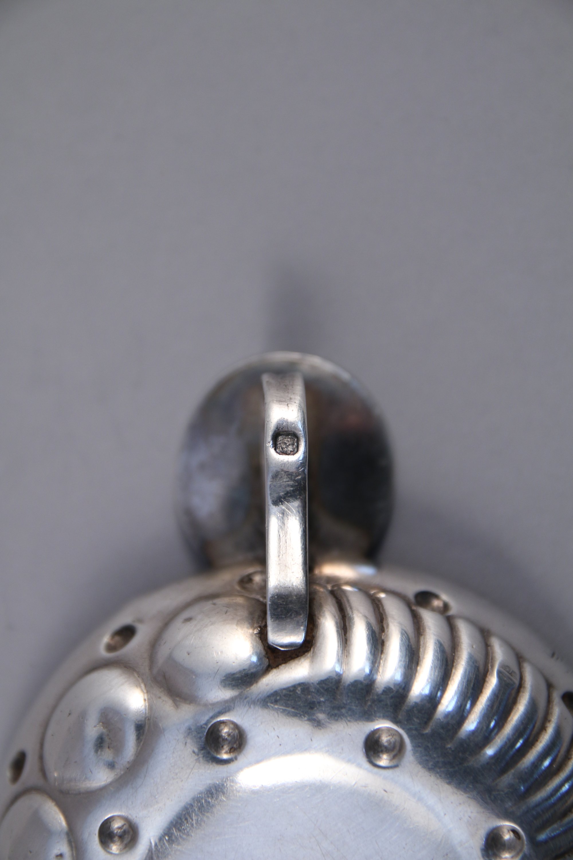 -TASTEVIN à décor de godrons, perles et cupules, Appui-pouce de forme ovale agrémenté d'une prise en anneau monogrammé "L C". Poinçon Minerve XIXe. Diam. 7,3 cm. Poids 96 g.