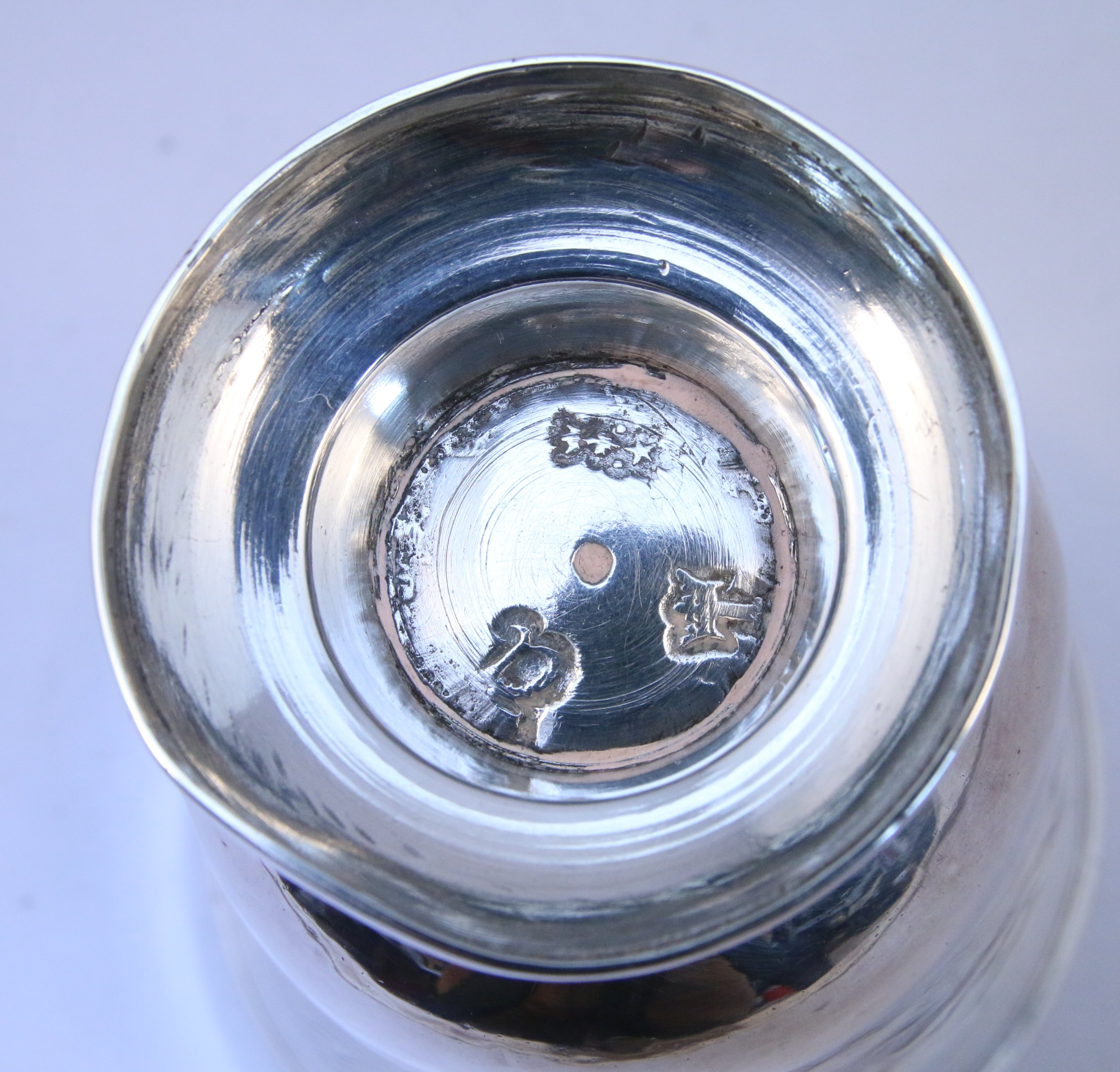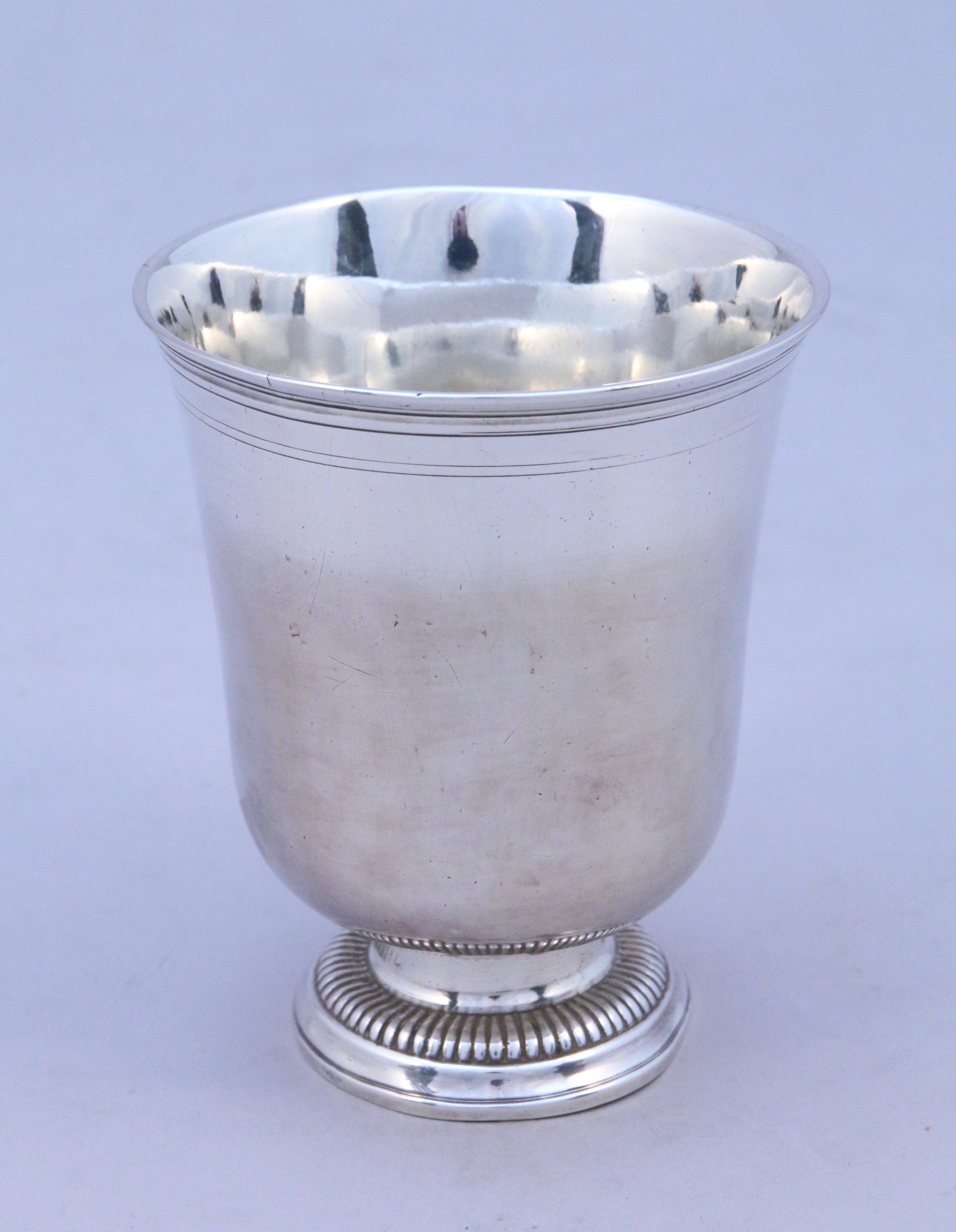 PARIS.TIMBALE TULIPE en argent uni reposant sur un piédouche orné d'une frise de godrons. Le col souligné de filets gravé des lettres "FD".
