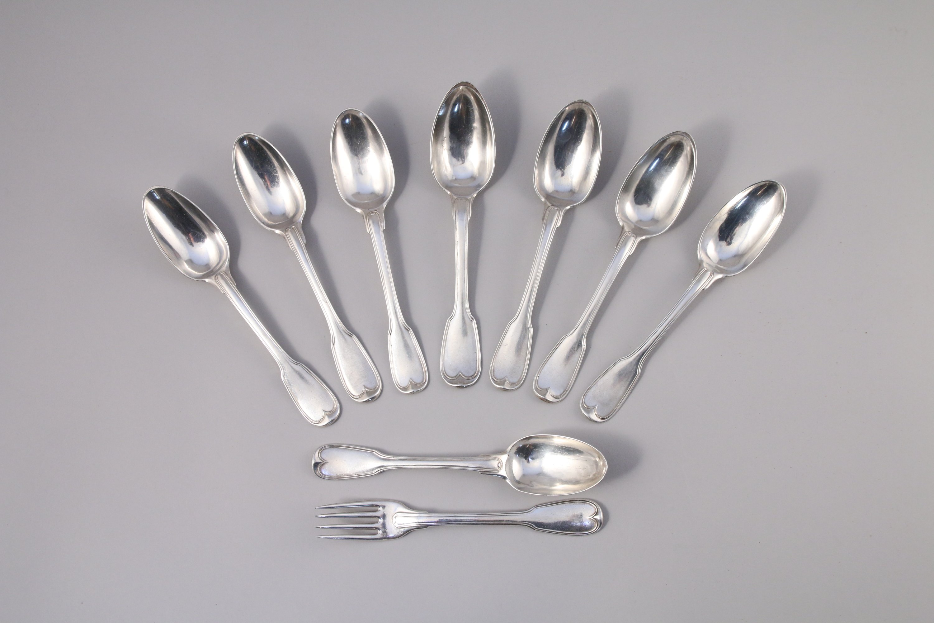 PARIS. HUIT CUILLÈRES et UNE FOURCHETTE DE TABLE, en argent, modèle à filets-contour.