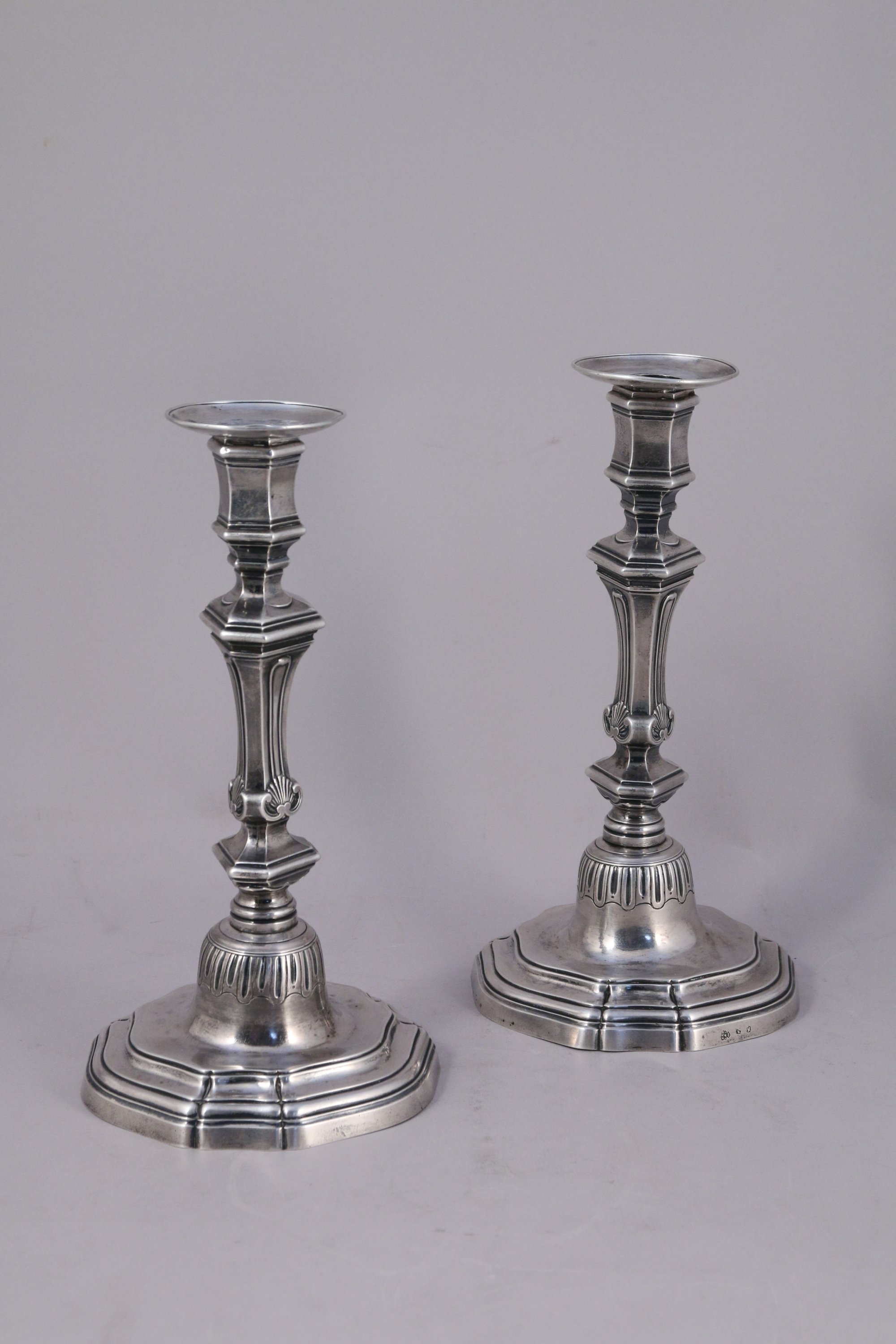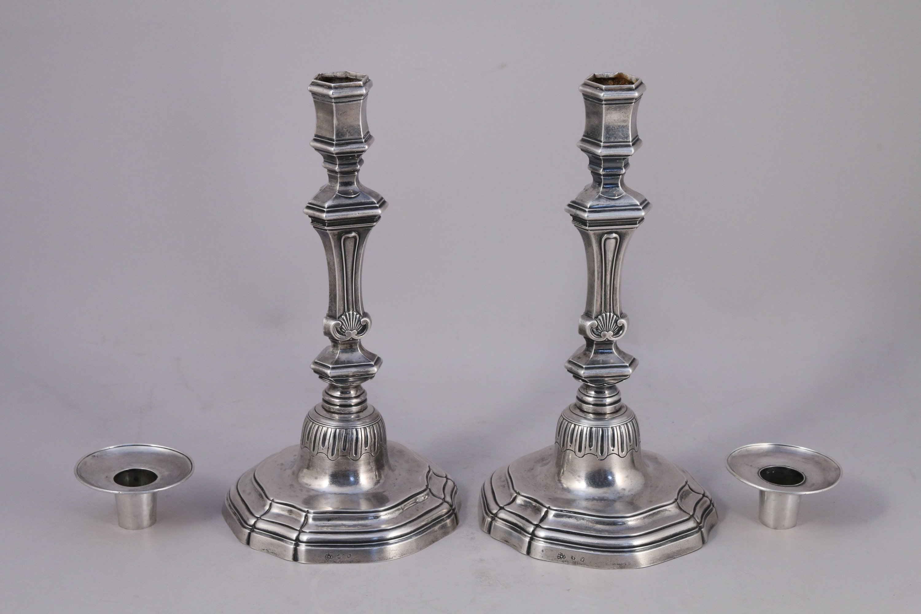AGDE ou BÉZIERS. PAIRE DE FLAMBEAUX et leurs BOBÈCHES en argent, le fût à pans ornés de trois coquilles.