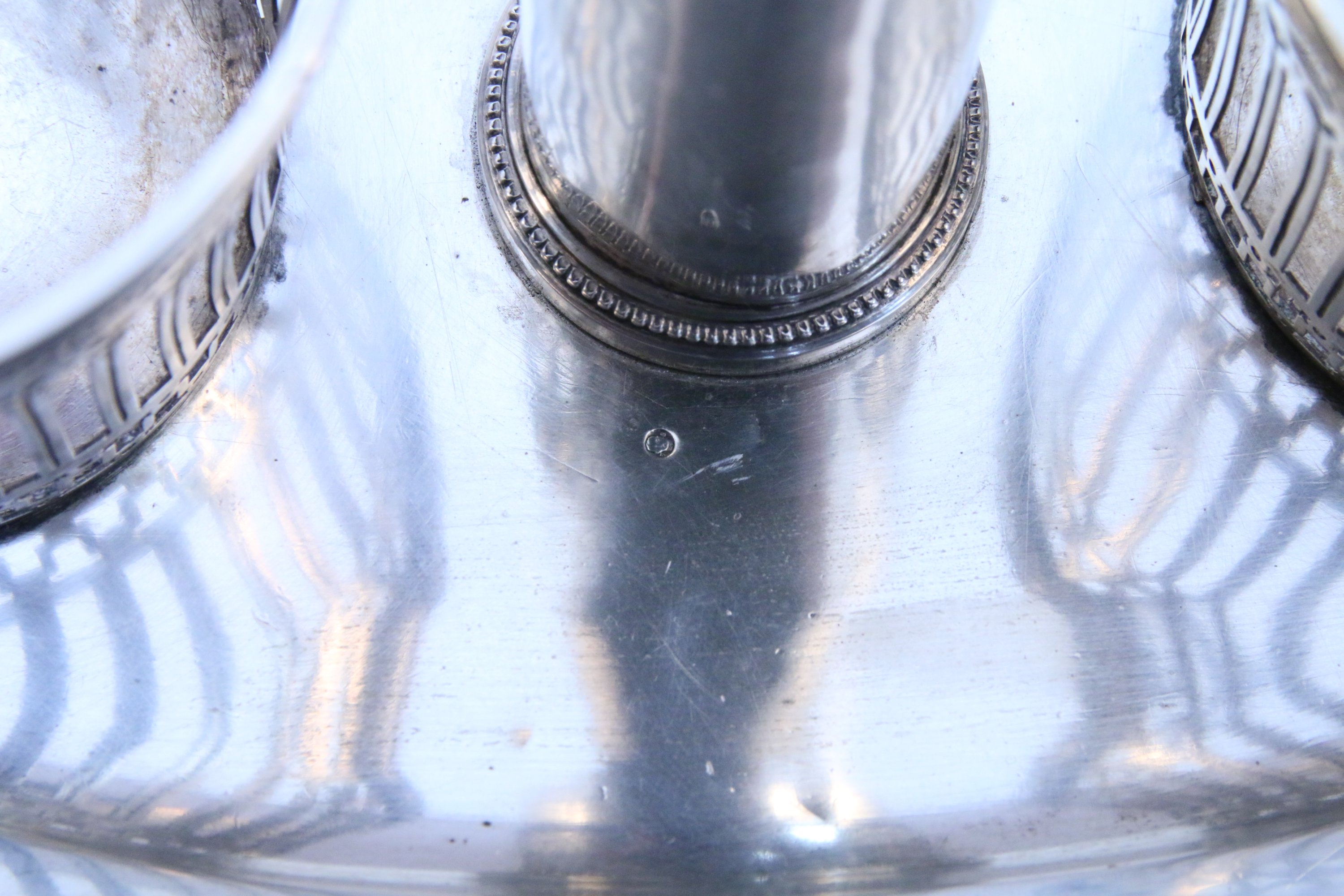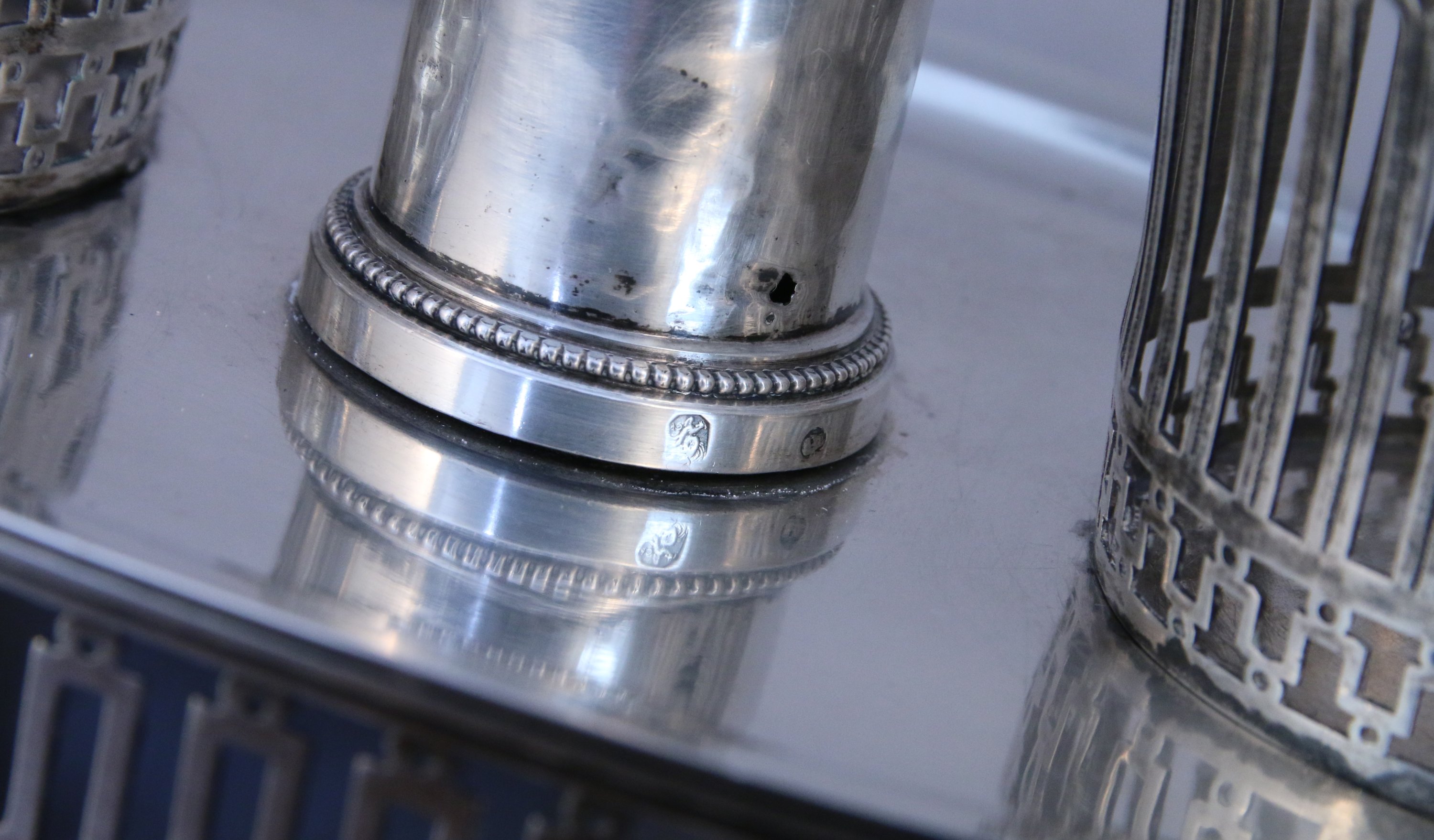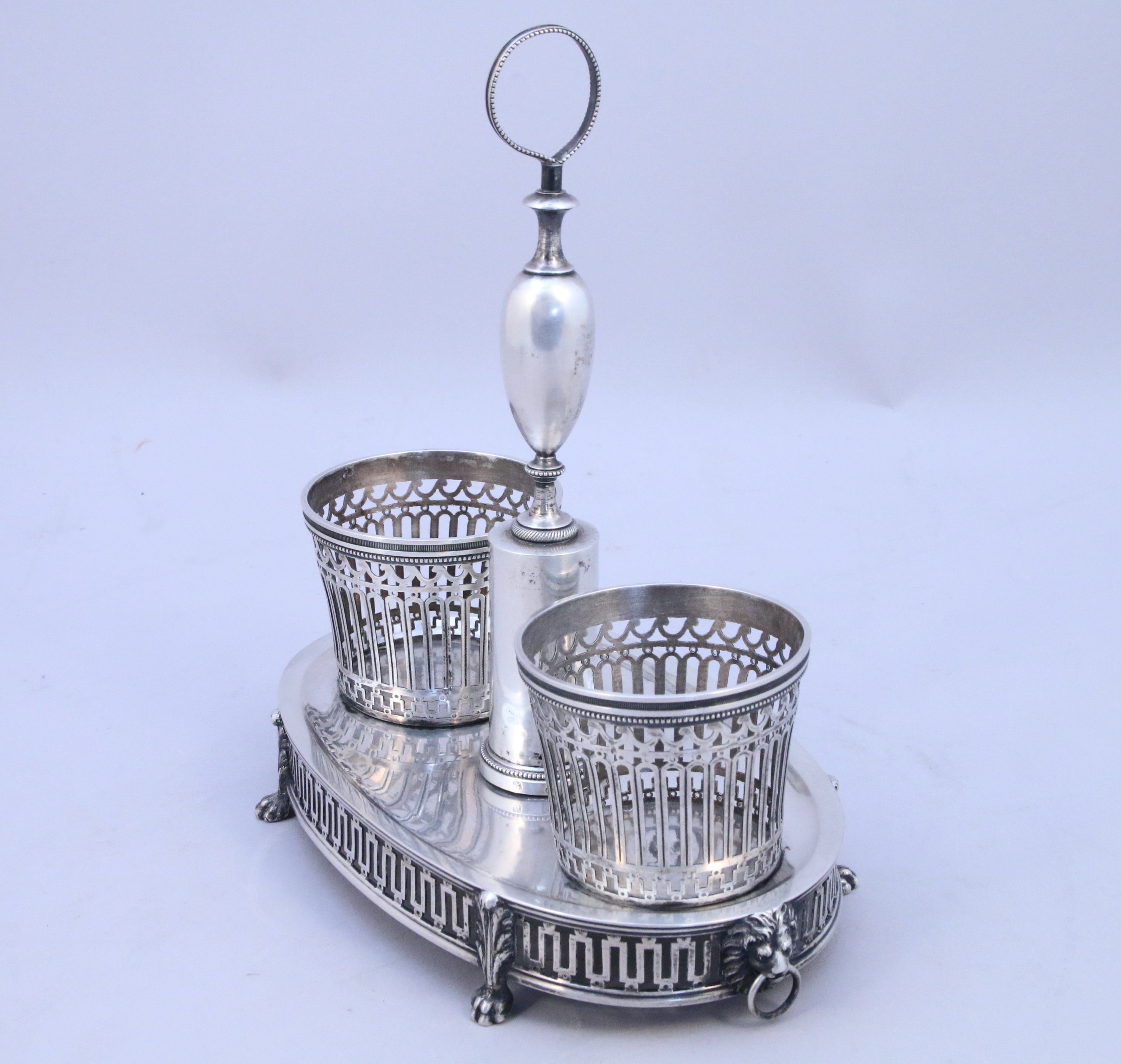 STRASBOURG. MONTURE D'HUILIER-VINAIGRIER en argent , les réceptacles figurant des paniers ajourés à décor d'un motif de vagues et canaux, la prise en forme d'urne posant sur une colonne bordée d'une frise de perles, la base oblongue à décor ajouré sur le pourtour d'un frise de grecques posant sur quatre pieds à motif de pattes de lions feuillagés. Les extrémités figurant des mufles de lions tenant dans leurs gueules un anneau mobile.