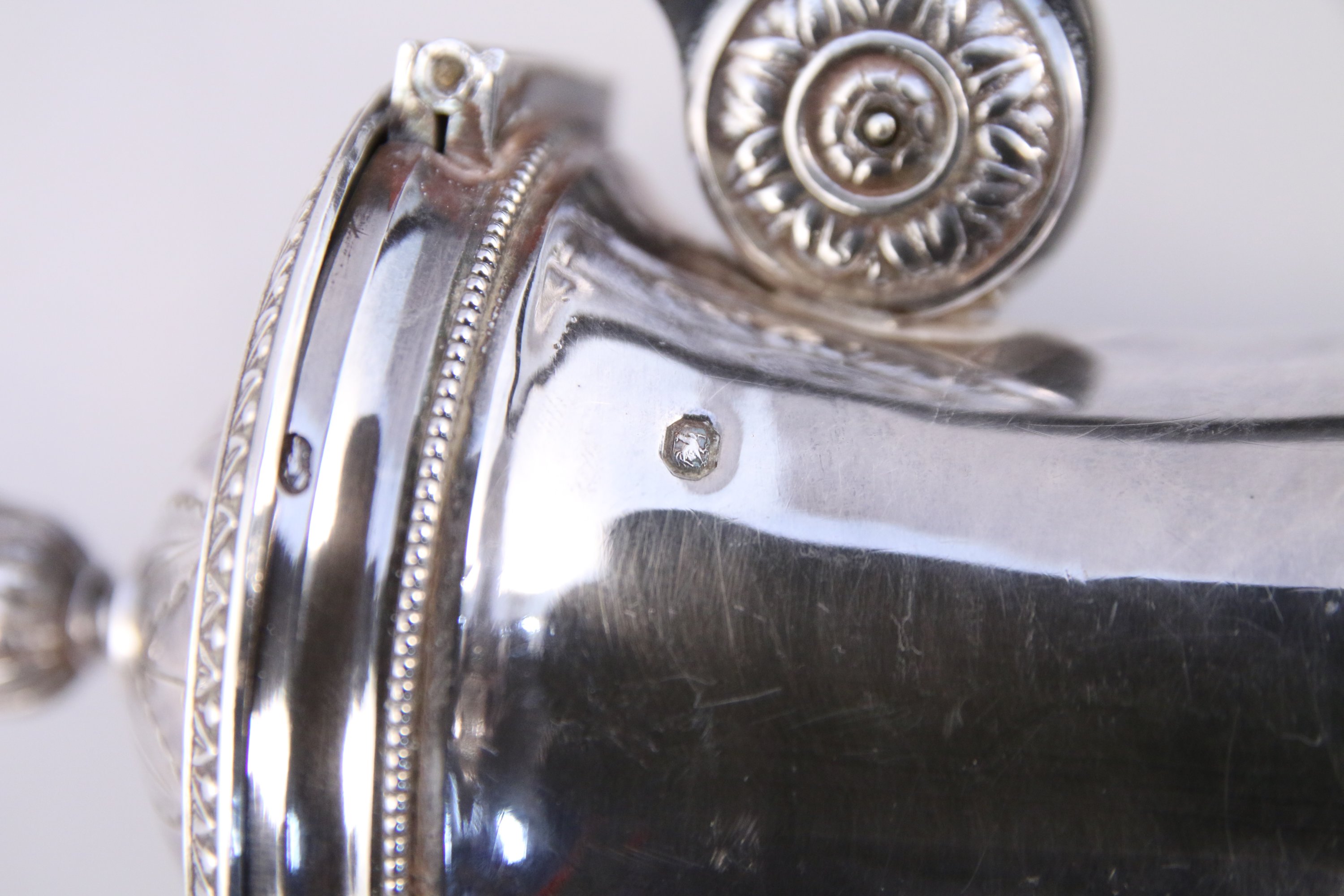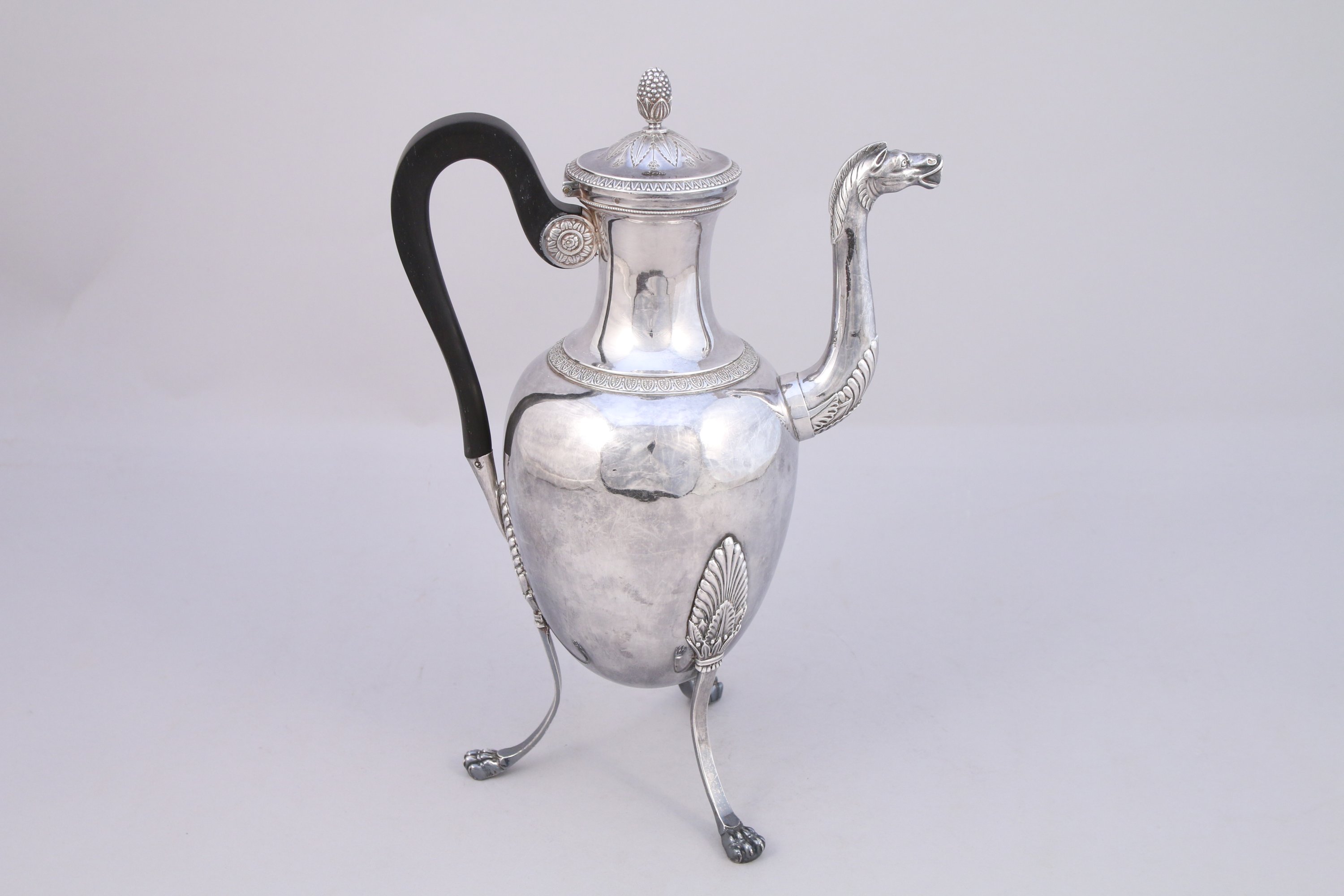 PARIS. CAFETIÈRE de forme ovoïde en argent à décor de frises d'oves et d'arces et de palmettes et raies de coeur. Couvercle à charnière à fretel en gland. Bec en tête de cheval. Anse en ébéne. Elle repose sur trois pieds en pattes de lion à larges attaches en palmettes.