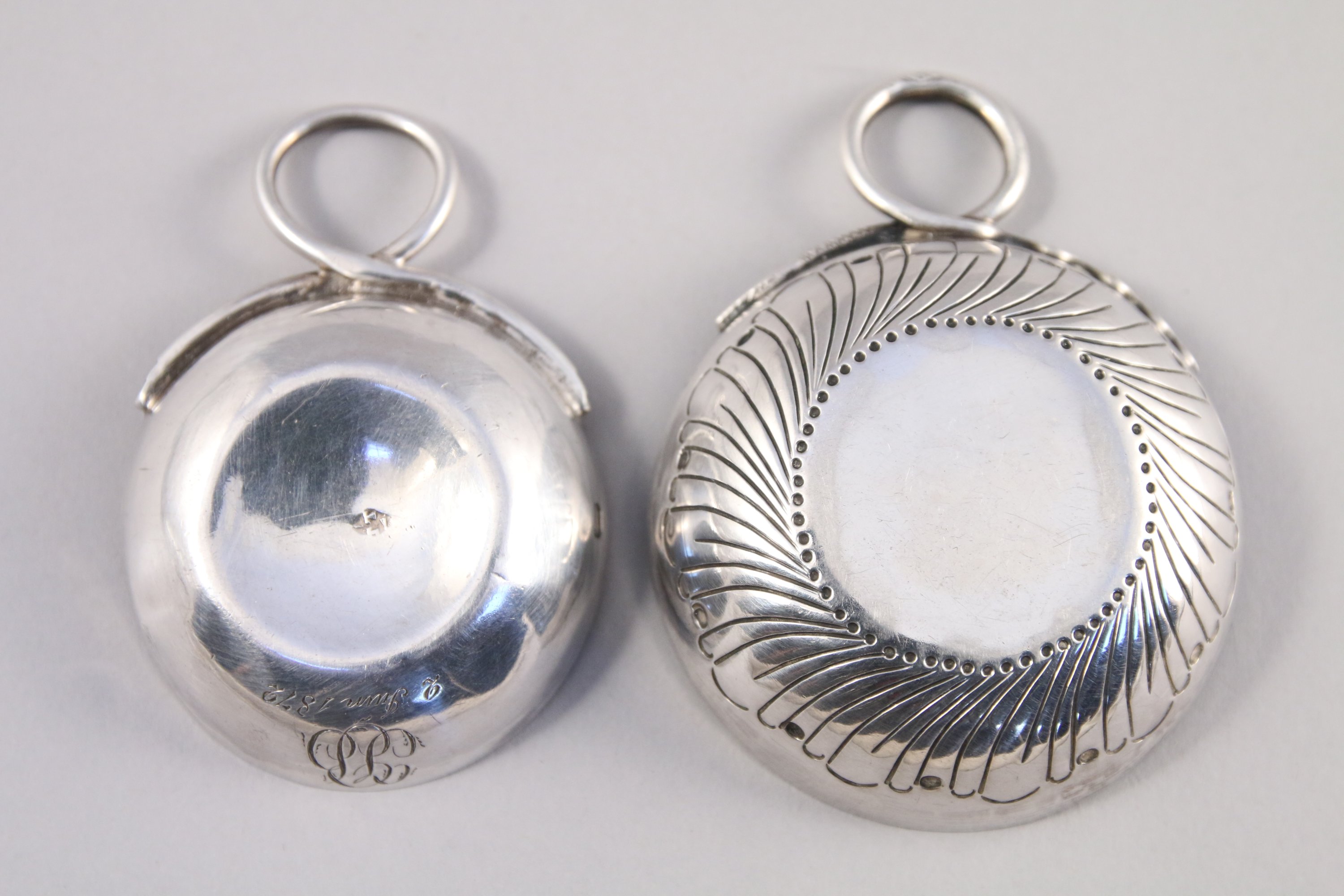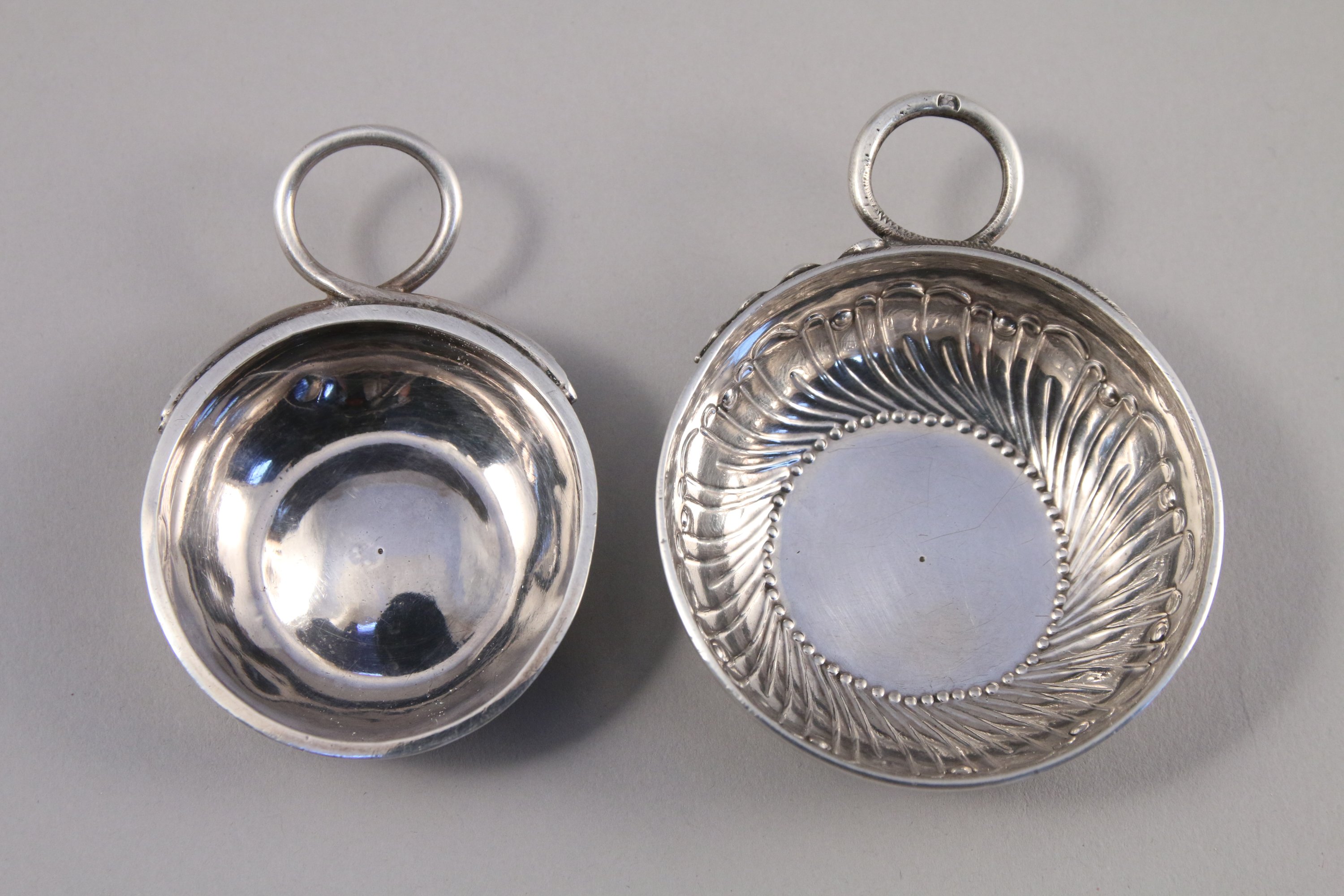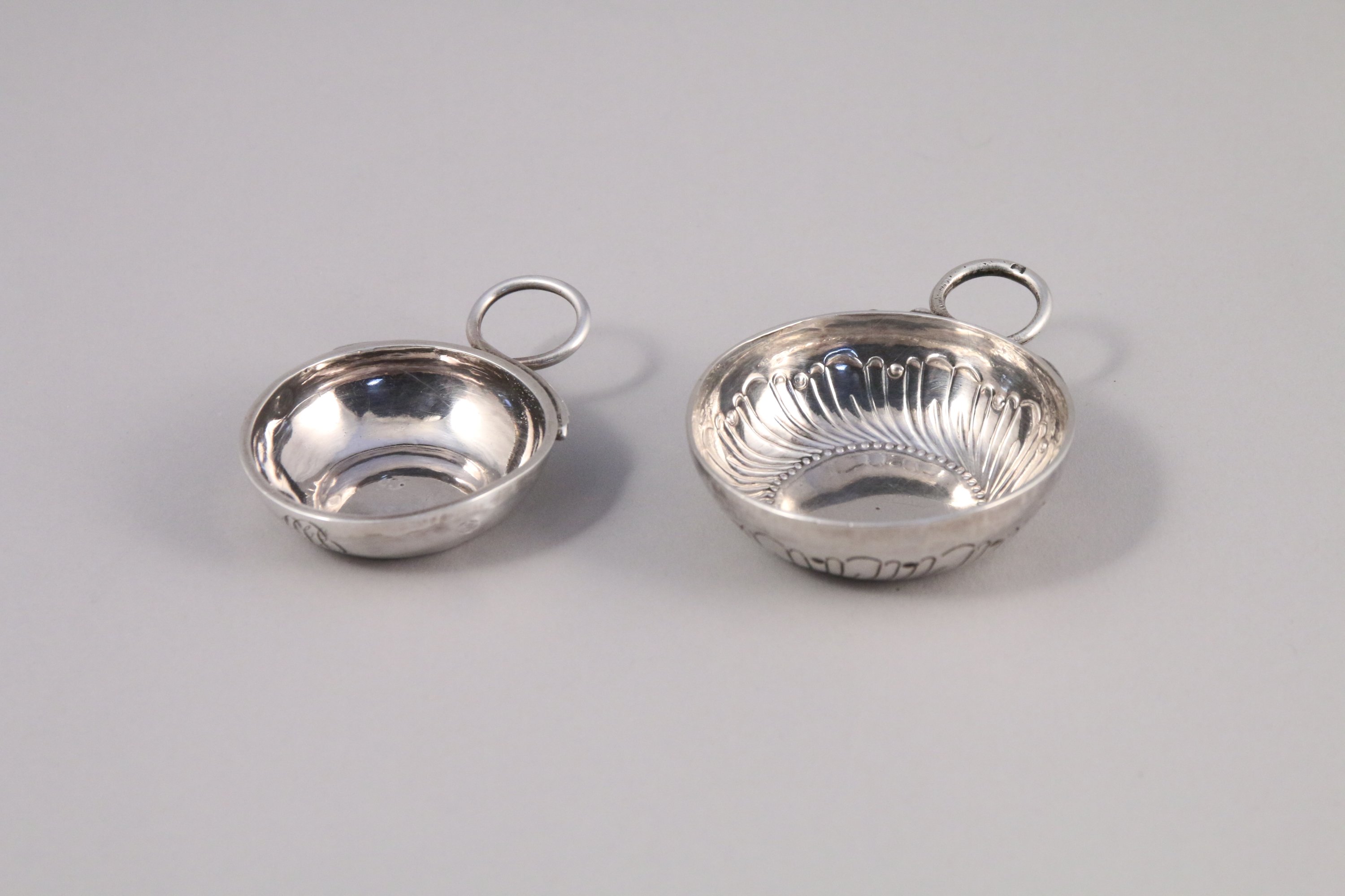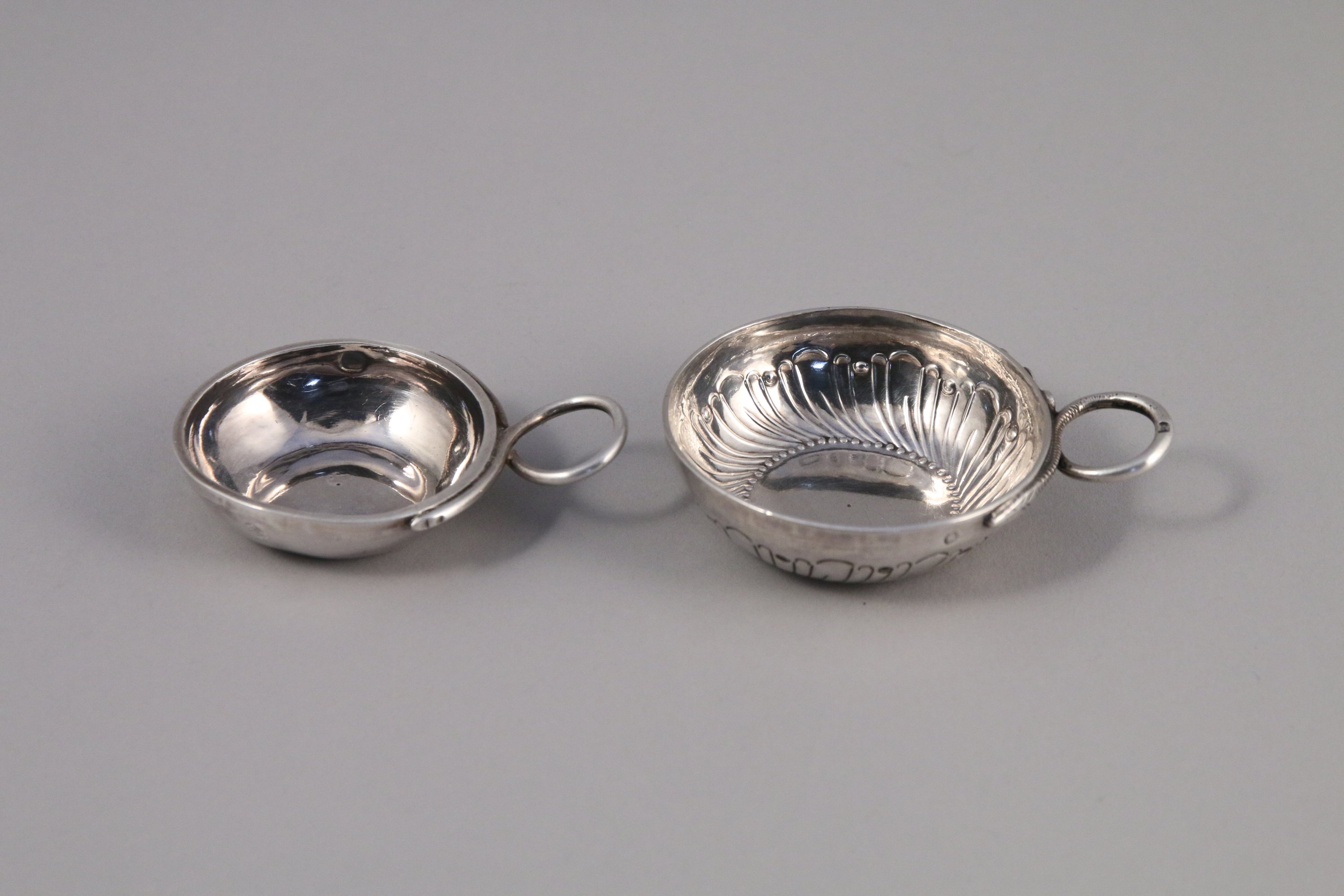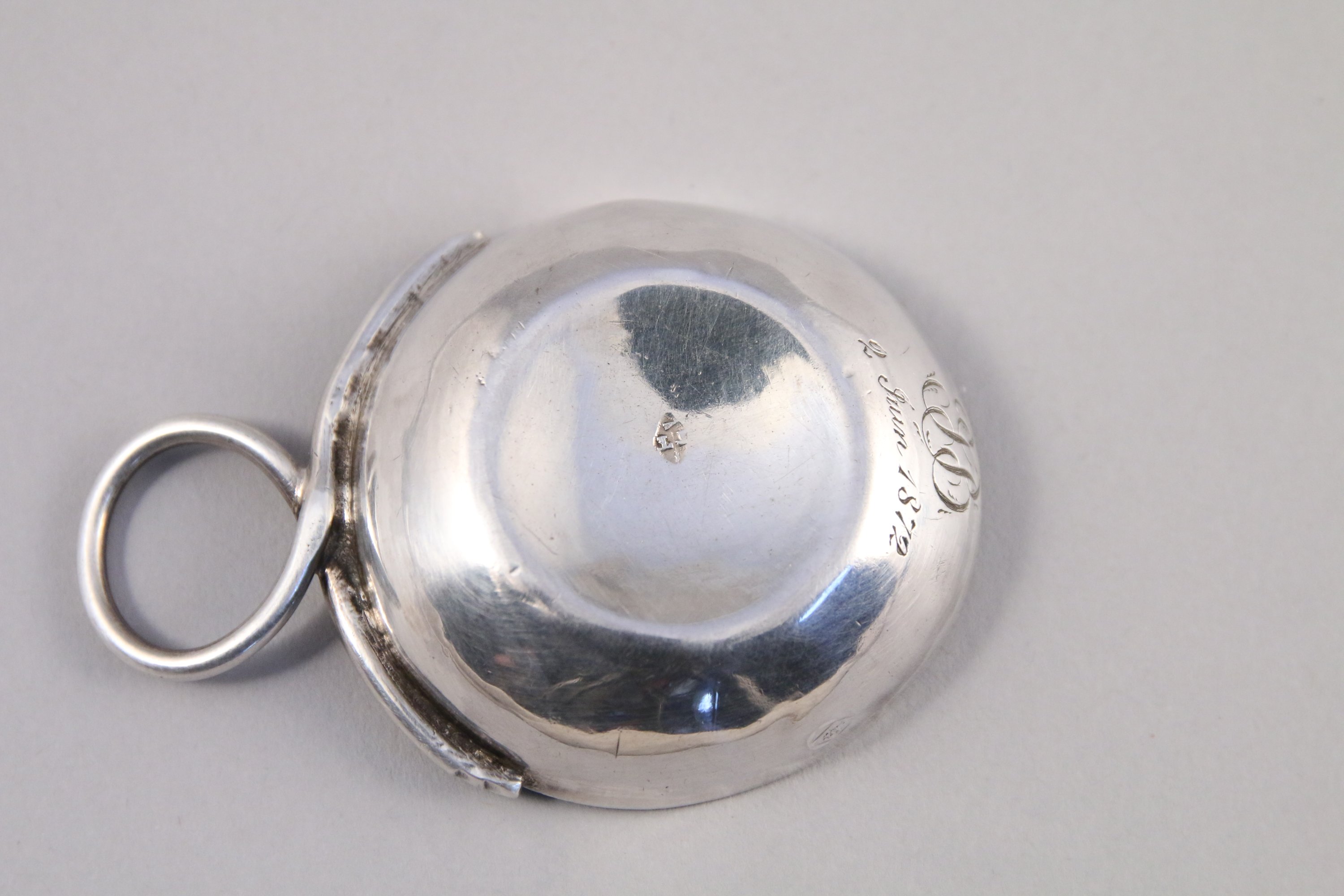 - TASTE-VIN, le corp uni gravé "JB 2 Juin 1872". Poinçon Vielllard premier titre Paris. Orfèvre: Theodor Tonnelier. Diam. 5 cm. Poids 25 g.