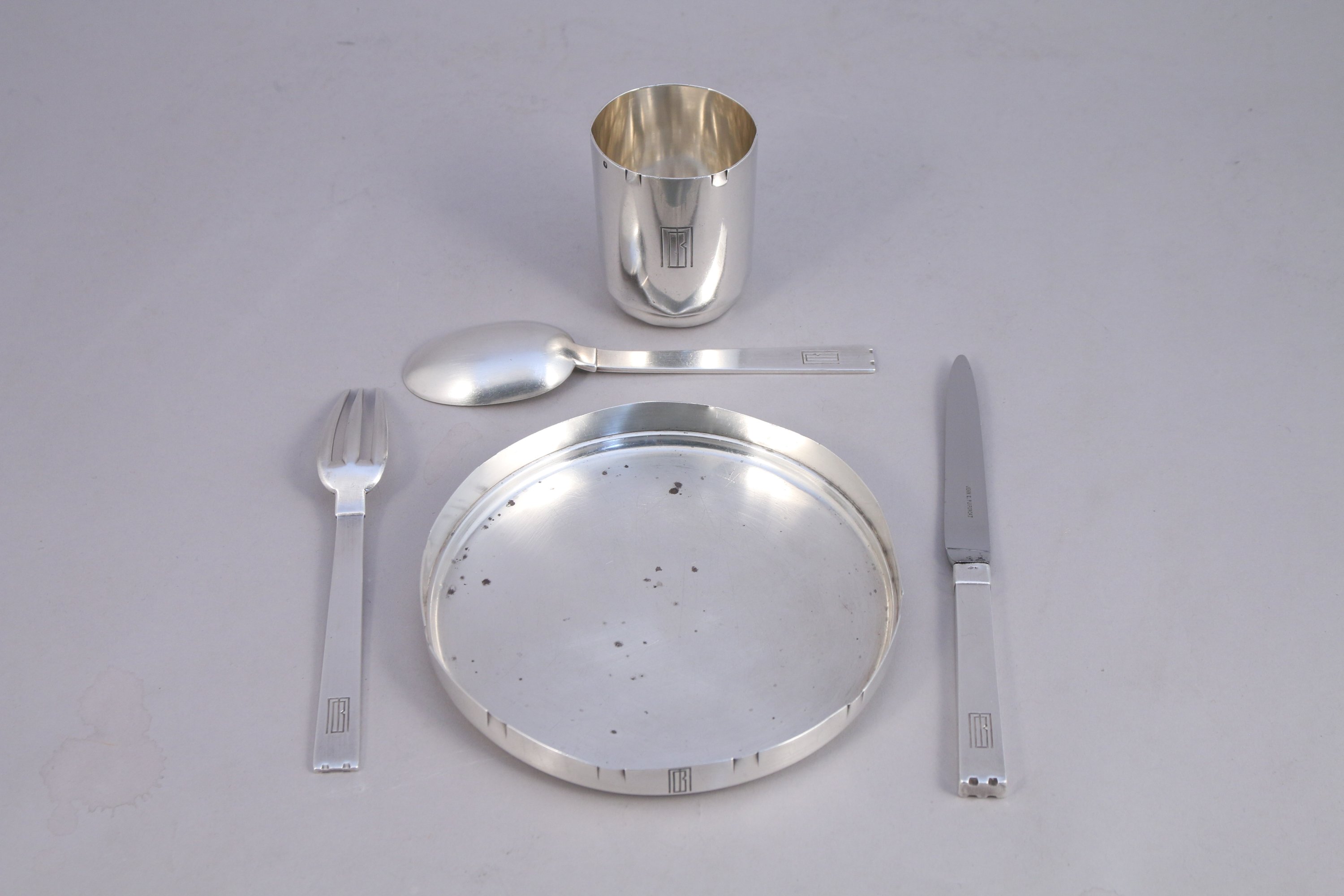 Une ASSIETTE, une TIMBALE, une CUILLER, une FOURCHETTE et un COUTEAU (le couteau en argent fourré la lame en métal). Motifs géométriques emboutis. Chaque élément portant des initiales "MB" à la graphie très géométrique.