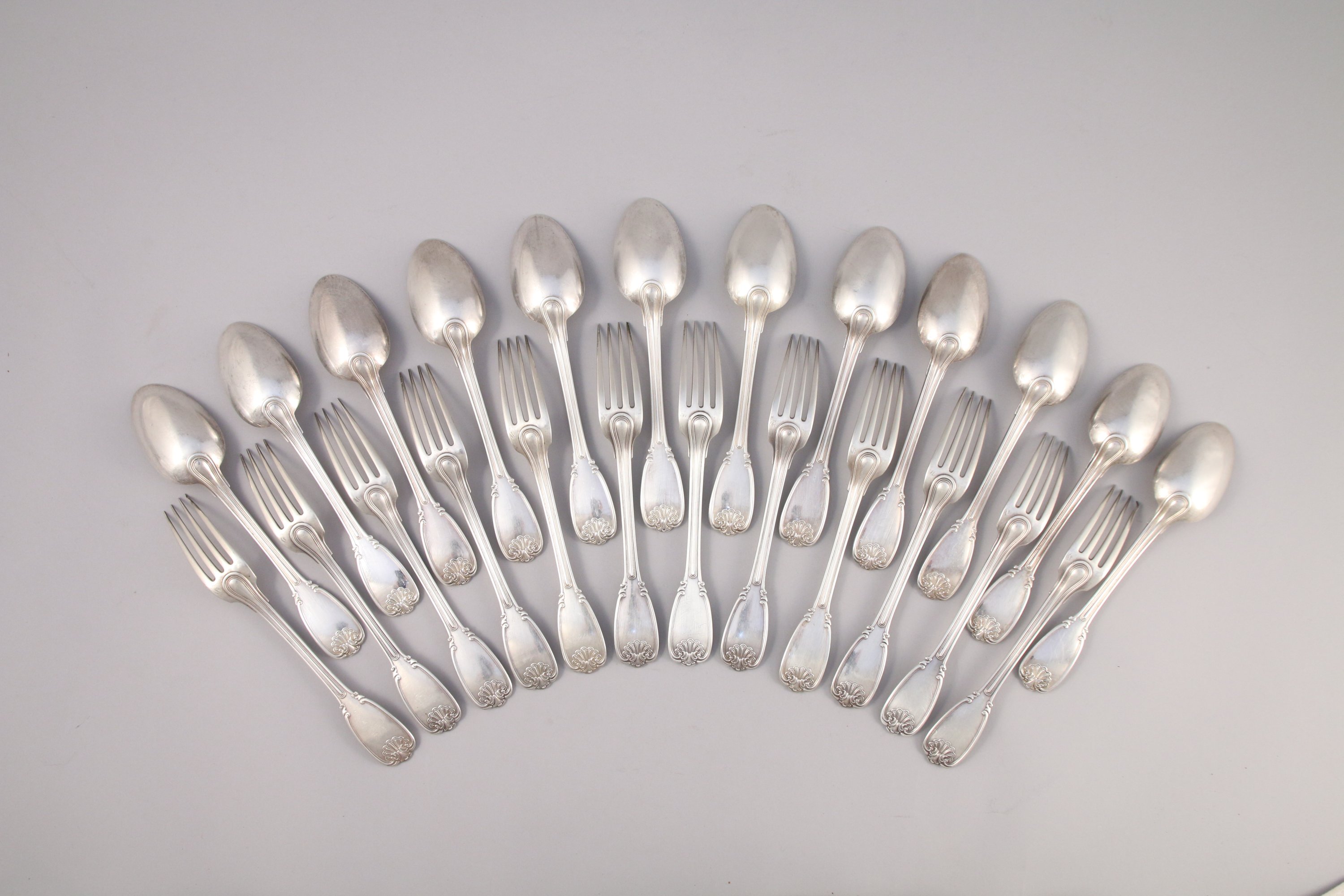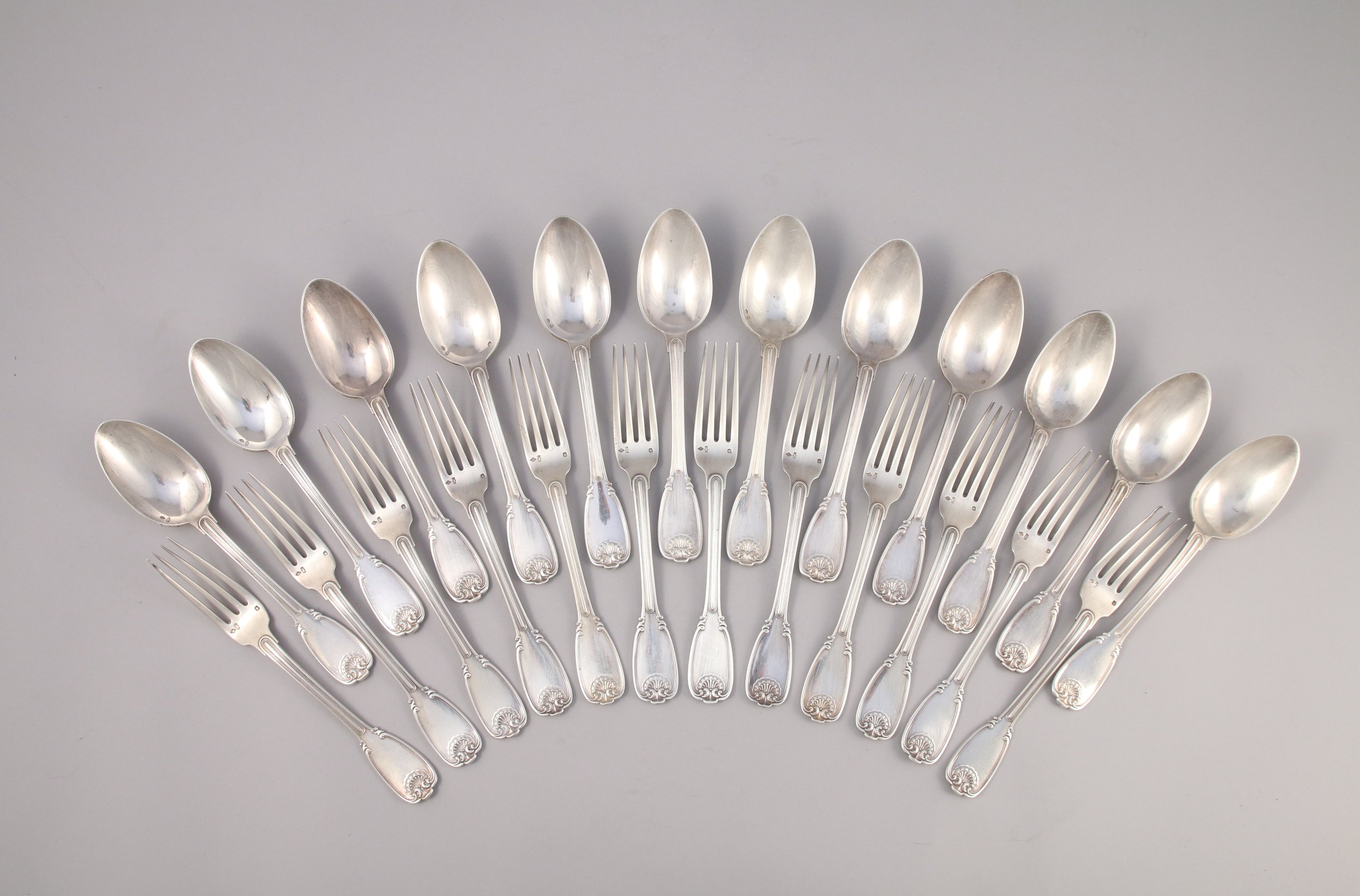 CARDEILHAC. Ménagère en argent de 64 pièces, élégant modèle à double filets, agrafe et coquille comprenant : 12 fourchettes, 12 couteaux (manque en argent fourré), 12 cuillères, 12 couteaux à fromage (manche en argent fourré), 5 petites cuillères et 11 petites fouchettes à entremet.