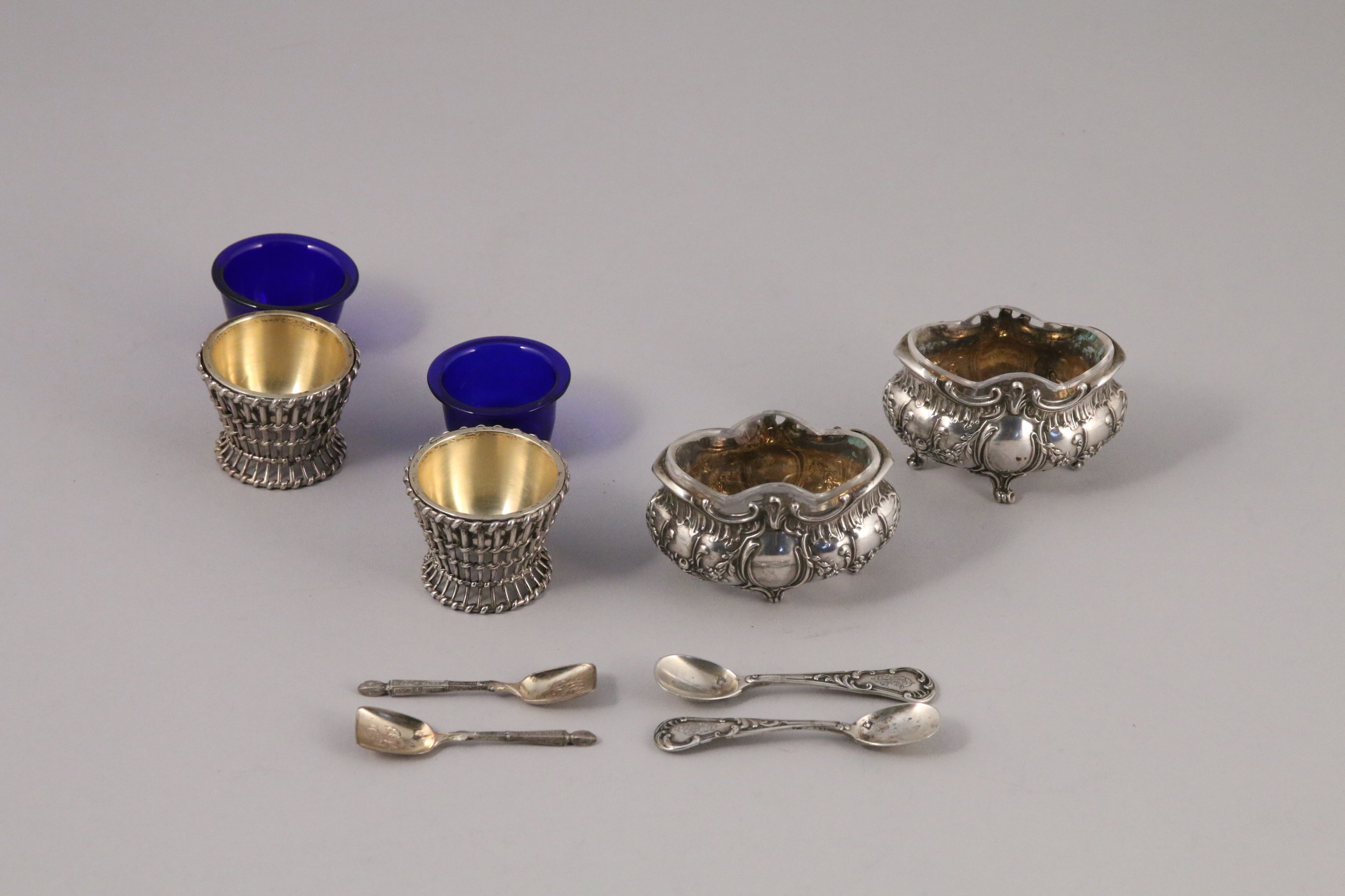 - PAIRE DE SALERONS adoptant la forme d'un panier en vannerie. Receptables amovibles en verre bleu ou coupelles intérieur vermeillé. Poids 75 g.