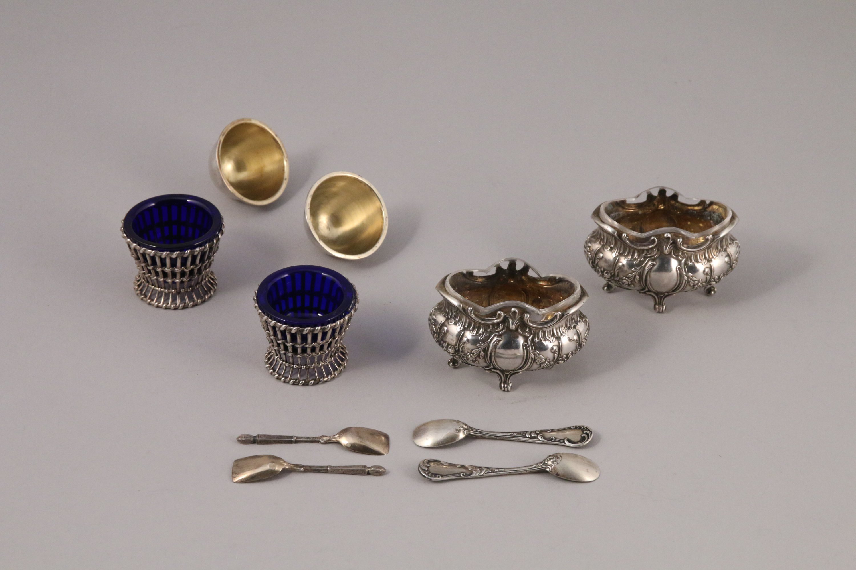 - PAIRE DE SALERONS de forme galbée et ventrue à décor de guirandes de fleurs, Intérieur vermeillé. Réceptacles en verre blanc. XIX, Style néo Louis XV. Poinçon Minerve 2nd titre. Orfèvre : Maillard Frères & Vazou (1897-1903). Poids 45 g.