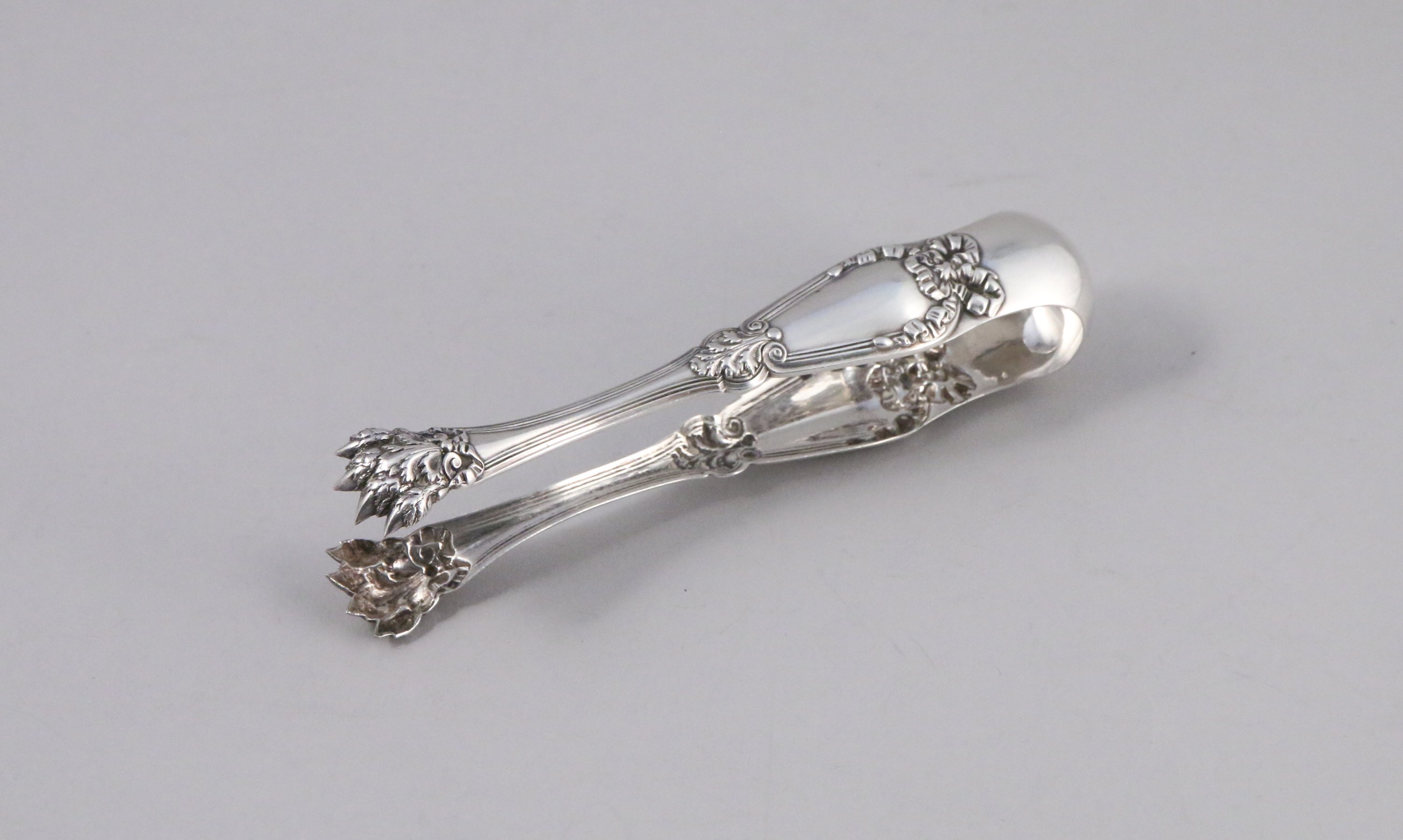 JOINT : une PINCE À SUCRE en métal argenté ornée d'un cartouche feuillagé surmonté d'un noeud de ruban, terminé par des pattes de lion. Long. 15,5 cm.