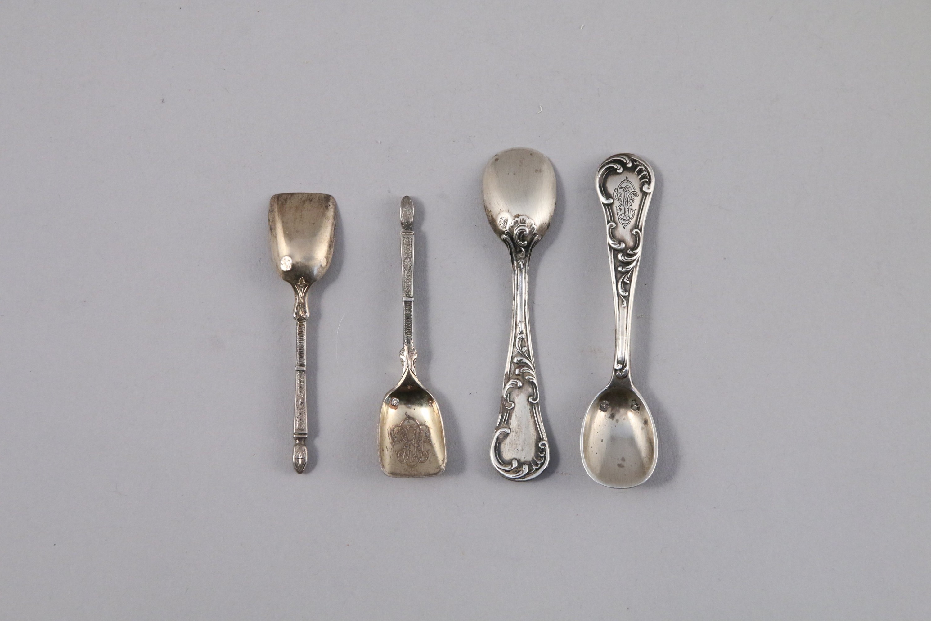 -PAIRE DE PELLES à SEL en vermeil, manche "à la russe" et cuilleron monogrammé "M C". Poinçon Minerve XIXe. Orfèvre non identifié : EC, un calice couronné. Poids 10 g.