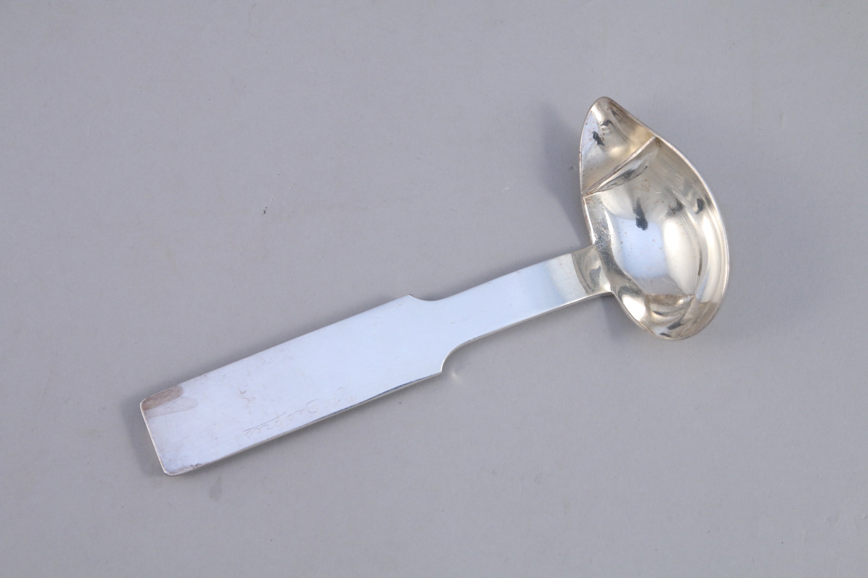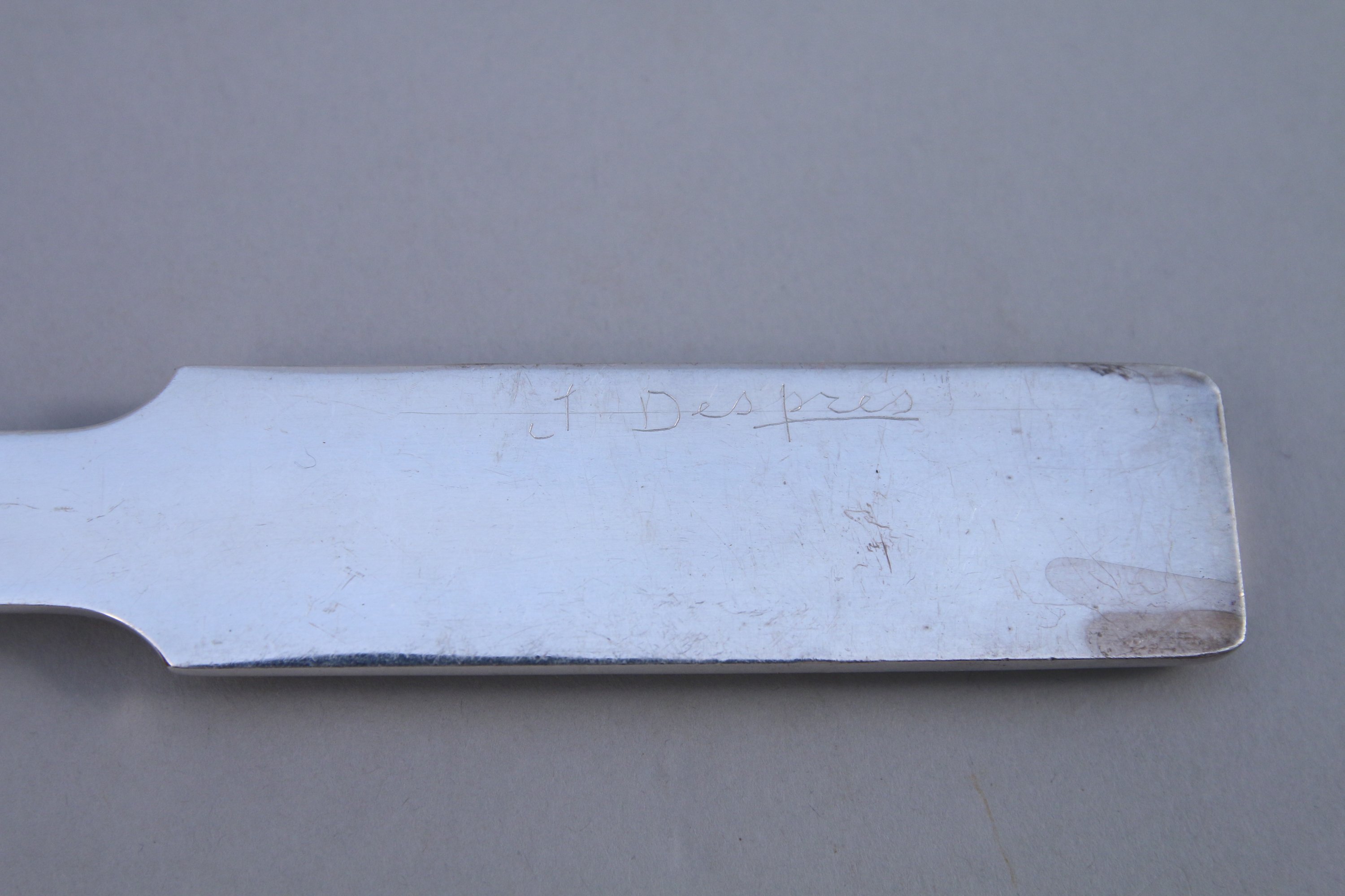Cuiller à sauce en métal argenté partiellement martelé. Ornée d'une application de frise de gourmette. Signée "J DESPRÉS".